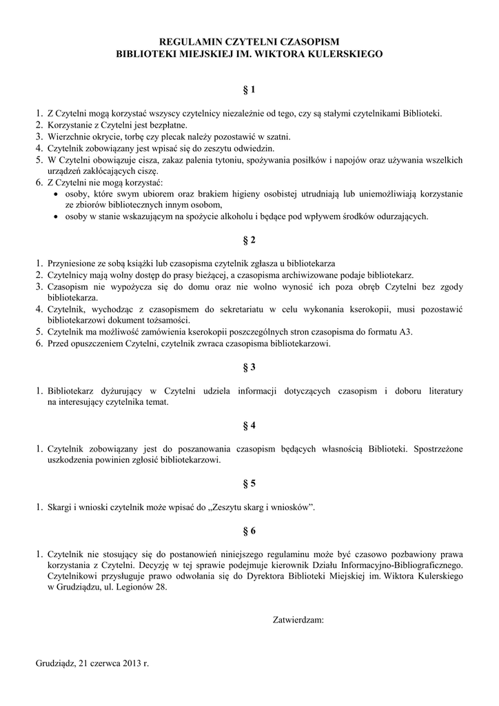 REGULAMIN CZYTELNI CZASOPISM BIBLIOTEKI MIEJSKIEJ IM. WIKTORA KULERSKIEGO §1 Z Czytelni mogą korzystać wszyscy czytelnicy niezależnie od tego, czy są stałymi czytelnikami Biblioteki. Korzystanie z Czytelni jest bezpłatne. Wierzchnie okrycie, torbę czy plecak należy pozostawić w szatni. Czytelnik zobowiązany jest wpisać się do zeszytu odwiedzin. W Czytelni obowiązuje cisza, zakaz palenia tytoniu, spożywania posiłków i napojów oraz używania wszelkich urządzeń zakłócających ciszę. 6. Z Czytelni nie mogą korzystać: osoby, które swym ubiorem oraz brakiem higieny osobistej utrudniają lub uniemożliwiają korzystanie ze zbiorów bibliotecznych innym osobom, osoby w stanie wskazującym na spożycie alkoholu i będące pod wpływem środków odurzających. 1. 2. 3. 4. 5. §2 1. Przyniesione ze sobą książki lub czasopisma czytelnik zgłasza u bibliotekarza 2. Czytelnicy mają wolny dostęp do prasy bieżącej, a czasopisma archiwizowane podaje bibliotekarz. 3. Czasopism nie wypożycza się do domu oraz nie wolno wynosić ich poza obręb Czytelni bez zgody bibliotekarza. 4. Czytelnik, wychodząc z czasopismem do sekretariatu w celu wykonania kserokopii, musi pozostawić bibliotekarzowi dokument tożsamości. 5. Czytelnik ma możliwość zamówienia kserokopii poszczególnych stron czasopisma do formatu A3. 6. Przed opuszczeniem Czytelni, czytelnik zwraca czasopisma bibliotekarzowi. §3 1. Bibliotekarz dyżurujący w Czytelni udziela informacji dotyczących czasopism i doboru literatury na interesujący czytelnika temat. §4 1. Czytelnik zobowiązany jest do poszanowania czasopism będących własnością Biblioteki. Spostrzeżone uszkodzenia powinien zgłosić bibliotekarzowi. §5 1. Skargi i wnioski czytelnik może wpisać do „Zeszytu skarg i wniosków”. §6 1. Czytelnik nie stosujący się do postanowień niniejszego regulaminu może być czasowo pozbawiony prawa korzystania z Czytelni. Decyzję w tej sprawie podejmuje kierownik Działu Informacyjno-Bibliograficznego. Czytelnikowi przysługuje prawo odwołania się do Dyrektora Biblioteki Miejskiej im. Wiktora Kulerskiego w Grudziądzu, ul. Legionów 28. Zatwierdzam: Grudziądz, 21 czerwca 2013 r.