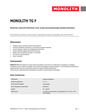 MONOLITH TG F Wzmacniacz nawierzchni betonowych. Grunt sczepny pod samopoziomujące posadzki przemysłowe Wyrób budowlany wprowadzony do obrotu zgodnie z Rozporządzeniem Parlamentu Europejskiego i Rady (UE) NR 305/2011 Właściwości: • • • • • • • Pielęgnuje nowo wykonane powierzchnie betonowe. Powoduje dodatkowe utwardzenie i uszczelnienie posadzki betonowej. Tworzy niepylącą, odporną na zawilgacanie powierzchnię. Podnosi estetykę wyglądu powierzchni betonowej. Nadaje się do zastosowań wewnątrz i na zewnątrz. Nie zawiera rozpuszczalników. Łatwy w aplikacji. Zastosowanie: MONOLITH TG F jest gotowym do użycia płynem gruntującym, który służy do zwiększania przyczepności i zapobiega przesiąkaniu wody z wylewki do podłoża. Służy również do pielęgnacji nowych posadzek, tj. przeciwdziałaniu gwałtownemu odparowywaniu wody oraz wzmacniania powierzchni starych posadzek betonowych. Produkt ten jest zaawansowanym technologicznie środkiem na bazie polimeru akrylowego. Dane techniczne: opakowanie wiaderka plastikowe wielkość opakowania 5 l, 10 l barwa świeżej dyspersji mlecznobiała barwa dyspersji po wyschnięciu bezbarwna gęstość ok. 1 kg/dm3 składowanie w suchym pomieszczeniu, w temperaturze od +5°C do +35°C, do 6 miesięcy MONOLITH TG F | 1.159 | Aktualizacja 13.10.2015 str. 1 Zużycie: 0,05 l/m2 jako warstwa pielęgnacyjna 0,15 – 0,20 l/m2 na 1 warstwę (w zależności od chłonności podłoża) jako grunt sczepny i wzmacniający Przygotowanie podłoża: W przypadku starej powierzchni betonowej należy, przede wszystkim usunąć warstwę zabrudzonego i słabego betonu, np. poprzez szlifowanie, frezowanie a następnie uzupełnić wszelkie ubytki zaprawami naprawczymi MONOLITH. Nowe istniejące podłoża należy oczyścić od wszelkich zabrudzeń, mleczka cementowego i luźnych części również poprzez szlifowanie, frezowanie, śrutowanie itp. Wykonanie: Zastosowanie jako powłoka pielęgnacyjna na nowo wykonanych oraz istniejących podłożach: Na nowo wykonywanych posadzkach preparat MONOLITH TG F aplikujemy bezpośrednio po rozłożeniu i zatarciu betonu. Aplikację dokonujemy poprzez natrysk max 0,05 l/m2. Materiał należy natrysnąć i rozprowadzić mopem tak, aby nie powstały zastoiny, ponieważ pozostawione mogą powodować powstanie wykwitów po wyschnięciu. Zastosowanie jako powłoka gruntująca: W każdym przypadku na istniejącym mineralnym, chłonnym podłożu należy stosować dwukrotne gruntowanie preparatem MONOLITH TG F. Ma to przeciwdziałać, m.in. pojawianiu się w wylewanej posadzce pęcherzy powietrza. W przypadku starych podłoży, preparat MONOLITH TG F nanosić szczotkami lub wałkami aż do nasycenia podłoża. Należy przy tym zapewnić równomierne rozłożenie preparatu na gruntowanej powierzchni i nie doprowadzać do powstawania zastoin. Tak przygotowaną nawierzchnię należy pozostawić przez 6-10 godz. do wyschnięcia. W przypadku wykonywania wylewek dwuwarstwowo, tzn. podkład wyrównawczy z produktu MONOLITH ABM 400 a na tej warstwie posadzka samopoziomująca z produktu MONOLITH ABM 435 Top to należy na podkładzie wykonać jednokrotne gruntowanie preparatem MONOLITH TG F. Ważne wskazówki: • Zastosowanie zbyt dużych ilości produktu MONOLITH TG F może prowadzić do powstania po wyschnięciu przebarwień i plam. Bezpieczeństwo pracy / zalecenia: Podczas wykonywania prac należy przestrzegać przepisów BHP. MONOLITH TG F w warunkach normalnych nie stwarza zagrożenia. Skażenie skóry: Wyprowadzić poszkodowanego z miejsca narażenia. Zdjąć skażoną odzież i buty. Skórę spłukać wodą z mydłem. Skażenie oczu: Natychmiast płukać oczy, przytrzymując odchylone powieki, dużą ilością czystej bieżącej wody. Płukać przez co najmniej 15 minut. W razie utrzymywania się dolegliwości zapewnić pomoc okulisty. Usuwanie odpadów: MONOLITH TG F jest materiałem nietoksycznym. Pozostałości utylizować jak dyspersje polimerów. Nie wpuszczać do kanalizacji i wód gruntowych. MONOLITH TG F | 1.159 | Aktualizacja 13.10.2015 str. 2 Uwagi: Materiał przeznaczony do profesjonalnego stosowania. Podane przez nas informacje i wskazówki są zgodne z naszymi przekonaniami i odpowiadają naszej najnowszej wiedzy i doświadczeniom, jednak ze względu na wielostronność możliwości zastosowań nie są wyczerpujące. W związku z tym nabywca jest zobowiązany do sprawdzenia na własną odpowiedzialność przydatności naszych produktów do zastosowania w przewidywanym celu np. przez wykonanie próby. Odmienne zalecenia naszych pracowników wymagają formy pisemnej, aby były ważne. Obowiązują nasze Ogólne Warunki Handlowe. Wraz z ukazaniem się niniejszej Karty Technicznej wszystkie poprzednie tracą ważność. VISBUD-Projekt Sp. z o.o. 51-649 Wrocław, ul. Bacciarellego 8E/I, tel. (+48) 71 344 04 34 MONOLITH TG F | 1.159 | Aktualizacja 13.10.2015 str. 3