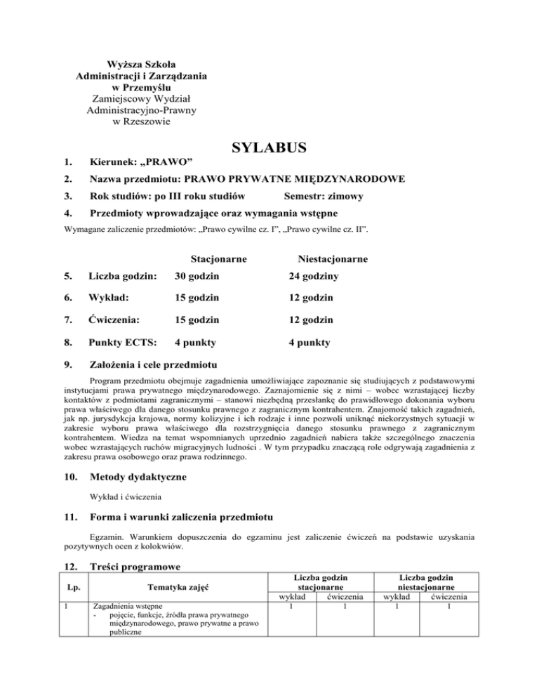 WyŜsza Szkoła Administracji i Zarządzania w Przemyślu Zamiejscowy Wydział Administracyjno-Prawny w Rzeszowie SYLABUS 1. Kierunek: „PRAWO” 2. Nazwa przedmiotu: PRAWO PRYWATNE MIĘDZYNARODOWE 3. Rok studiów: po III roku studiów 4. Przedmioty wprowadzające oraz wymagania wstępne Semestr: zimowy Wymagane zaliczenie przedmiotów: „Prawo cywilne cz. I”, „Prawo cywilne cz. II”. Stacjonarne Niestacjonarne 5. Liczba godzin: 30 godzin 24 godziny 6. Wykład: 15 godzin 12 godzin 7. Ćwiczenia: 15 godzin 12 godzin 8. Punkty ECTS: 4 punkty 4 punkty 9. ZałoŜenia i cele przedmiotu Program przedmiotu obejmuje zagadnienia umoŜliwiające zapoznanie się studiujących z podstawowymi instytucjami prawa prywatnego międzynarodowego. Zaznajomienie się z nimi – wobec wzrastającej liczby kontaktów z podmiotami zagranicznymi – stanowi niezbędną przesłankę do prawidłowego dokonania wyboru prawa właściwego dla danego stosunku prawnego z zagranicznym kontrahentem. Znajomość takich zagadnień, jak np. jurysdykcja krajowa, normy kolizyjne i ich rodzaje i inne pozwoli uniknąć niekorzystnych sytuacji w zakresie wyboru prawa właściwego dla rozstrzygnięcia danego stosunku prawnego z zagranicznym kontrahentem. Wiedza na temat wspomnianych uprzednio zagadnień nabiera takŜe szczególnego znaczenia wobec wzrastających ruchów migracyjnych ludności . W tym przypadku znaczącą role odgrywają zagadnienia z zakresu prawa osobowego oraz prawa rodzinnego. 10. Metody dydaktyczne Wykład i ćwiczenia 11. Forma i warunki zaliczenia przedmiotu Egzamin. Warunkiem dopuszczenia do egzaminu jest zaliczenie ćwiczeń na podstawie uzyskania pozytywnych ocen z kolokwiów. 12. Lp. 1 Treści programowe Tematyka zajęć Zagadnienia wstępne pojęcie, funkcje, źródła prawa prywatnego międzynarodowego, prawo prywatne a prawo publiczne Liczba godzin stacjonarne wykład ćwiczenia 1 1 Liczba godzin niestacjonarne wykład ćwiczenia 1 1 2 Norma kolizyjna i jej budowa definicja normy kolizyjnej, budowa normy, rodzaje łączników Zasady prawa prywatnego międzynarodowego zasada traktowania cudzoziemców, stosowanie i wykładnia przepisów legislacji międzynarodowej, kwalifikacje, kwestia wstępna, odesłanie, niejednolitość prawa właściwego, klauzula porządku publicznego, obejście prawa Zagadnienia jurysdykcji w prawie prywatnym międzynarodowym pojęcie jurysdykcji i jej rodzaje, skutki niezachowania przepisów jurysdykcyjnych Problematyka prawa osobowego statut osobowy osób fizycznych oraz osób prawnych ze szczególnym uwzględnieniem problematyki siedziby osoby prawnej Zagadnienia prawa rzeczowego prawo właściwe dla stosunków prawno – rzeczowych, zakres i zmiana właściwego stanu Stosunki zobowiązaniowe prawo właściwe dla zobowiązań z czynności prawnych (wybór statutu kontaktowego, statut kontaktowy wobec braku wyboru). prawo właściwe dla zobowiązań niewynikających z czynności prawnych (ze szczególnym uwzględnieniem problematyki czynów niedozwolonych). Prawo rodzinne materialne i formalne przesłanki zawarcia małŜeństwa, prawo właściwe dla rozwodu, uniewaŜnienie małŜeństwa i separacji, pochodzenie dziecka i stosunki między rodzicami a dziećmi, adopcja. Międzynarodowe prawo spadkowe dziedziczenie ustawowe, dziedziczenie testamentowe Prawo pracy prawo właściwe dla stosunków wynikających z umowy o pracę 3 4 5 6 7 8 9 10 13. 1. 2. 3. 4. 1 1 1 1 1 1 1 1 1 1 1 1 1 1 1 1 1 1 1 1 3 3 2 2 3 3 2 2 2 2 1 1 1 1 1 1 Literatura podstawowa M. Pazdan, Prawo prywatne międzynarodowe, Warszawa 2005 J. Kołaczyński, Prawo prywatne międzynarodowe, Warszawa 2003 K. Bagan - Kawluta, Prawo prywatne międzynarodowe, Warszawa 2006 T. Ereciński, J. Ciszewski, Międzynarodowe postępowanie cywilne, Warszawa 2000 14. 1. 2. 3. 4. Literatura uzupełniająca A. Mączyński, J. Skąpski, Wybór źródeł polskiego prawa prywatnego międzynarodowego, Warszawa 1983 F. Zoll, Zbiór kazusów z prawa prywatnego międzynarodowego, Kraków 1994 T. Pajor, Odpowiedzialność deliktowa w prawie prywatnym międzynarodowym, Warszawa 1989 J. Kosik, Zagadnienia prawa rzeczowego w prawie prywatnym międzynarodowym z 1965 r., Wrocław 1976 15. Nazwisko osoby prowadzącej zajęcia na studiach stacjonarnych - wykład: dr J. Gajda - ćwiczenia: dr J. Gajda 16. Nazwisko osoby prowadzącej zajęcia na studiach niestacjonarnych - wykład: dr J. Gajda - ćwiczenia: dr J. Gajda