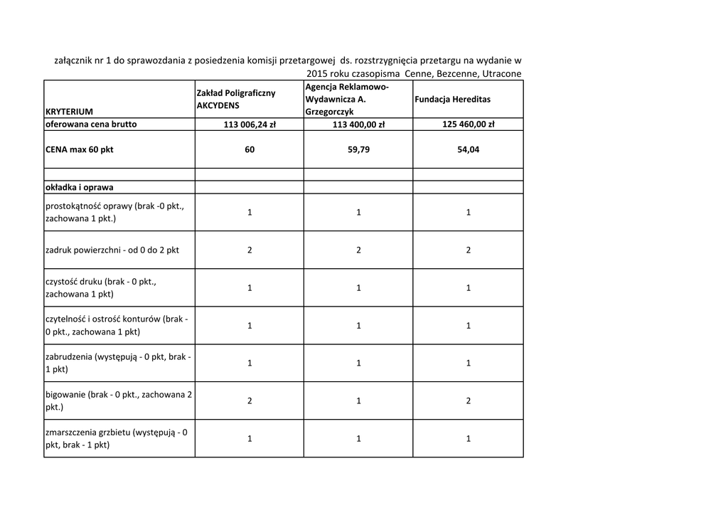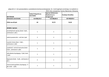 załącznik nr 1 do sprawozdania z posiedzenia komisji przetargowej ds. rozstrzygnięcia przetargu na wydanie w 2015 roku czasopisma Cenne, Bezcenne, Utracone KRYTERIUM oferowana cena brutto CENA max 60 pkt Zakład Poligraficzny AKCYDENS 113 006,24 zł Agencja ReklamowoWydawnicza A. Grzegorczyk 113 400,00 zł Fundacja Hereditas 125 460,00 zł 60 59,79 54,04 prostokątność oprawy (brak -0 pkt., zachowana 1 pkt.) 1 1 1 zadruk powierzchni - od 0 do 2 pkt 2 2 2 czystość druku (brak - 0 pkt., zachowana 1 pkt) 1 1 1 czytelność i ostrość konturów (brak 0 pkt., zachowana 1 pkt) 1 1 1 zabrudzenia (występują - 0 pkt, brak 1 pkt) 1 1 1 bigowanie (brak - 0 pkt., zachowana 2 pkt.) 2 1 2 zmarszczenia grzbietu (występują - 0 pkt, brak - 1 pkt) 1 1 1 okładka i oprawa skosy (są - 0 pkt, brak - 1 pkt) 1 1 1 zadruk grzbietu okładki (nieprawidłowy - 0 pkt, prawidłowy 2 pkt) 2 1 2 okrojenie boków (nieprawidłowe - 0 pkt. prawidłowe - 1 pkt) okrojenie marginesów (nieprawidłowe - 0 pkt. prawidłowe 1 pkt) 1 1 1 1 1 1 czystość nadruku (brak -0 pkt., zachowana 2 pkt.) intensywność nadruku ( nierównomierna - 0 pkt., równomierna - 2 pkt 2 2 2 2 1 2 czytelność ilustracji (0-4) 4 2 4 opracowanie ilustracji archiwalnych (0-9) 9 6 8 kompozycja strony (0-9) 9 5 9 100 87,79 wkład opracowanie graficzne RAZEM 93,04 Punkty za cenę zostaną wyliczone na podstawie wzoru: C = Cmin/Cp x 60 gdzie: Cmin - najniższa cena brutto badanych ofert, Cp - cena brutto badanej oferty. Punkty za jakość wydania książki zostaną wyliczone na podstawie wzoru: J = Jb/Jmax x 40 gdzie: Jb - ilość punktów przyznane książce w badanej ofercie, Jmax - maksymalna ilość punktów przyznanych książce w badanych ofertach.