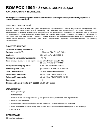 ROMPOX 1505 - ŻYWICA GRUNTUJĄCA KARTA INFORMACJI TECHNICZNEJ Bezrozpuszczalnikowy system dwu składnikowych żywic epoksydowych o niskiej lepkości z utwardzaczem aminowym OBSZARY ZASTOSOWAŃ ROMPOX 1505 stosuje się jako grunt do podłoży cementowych z niską wilgotnością szczątkową <4%. System żywic antyosmotycznych nadający się również do wykonywania szpachli, wylewek. Do zastosowania w halach, warsztatach, magazynach, na parkingach, schodach itp. Również jaką substancja do wytwarzania zabezpieczenia powierzchni na pasach startowych, drogach betonowych. Również do tworzenia zaprawy naprawczej. Z powodu niskiej lepkości możliwe stosowanie dużej ilości wypełniacza a dzięki temu możliwe stosowanie jako masa szpachlowa, wylewka samopoziomująca do podłoży cementowych. DANE TECHNICZNE Stosunek wagowy mieszania: 3:1 Gęstość przy 23 °C: 1,08 g/cm³ DIN EN ISO 2811-1 Lepkość: 650 ± 50 mPa·s DIN 53019 Minimalna temperatura wiązania: +10 °C Czas pracy z surowcem po wymieszaniu składników przy 23 °C: 28 min. ROMEX® NORM 04 Kolejna warstwa przy 23 °C: 8-48 h ROMEX® NORM 07 Pełne wiązanie przy 23 °C: po 7 dniach ROMEX® NORM 07 Czas „wiaderkowy”: 25 min. ROMEX® NORM 04 Odporność na nacisk: ok. 55 N/mm² DIN EN ISO 604 Odporność na ugięcie: ok. 40 N/mm² DIN EN ISO 14125 Zerwanie: 4% Twardość Shore D-Härte (DIN 53505): ok. 80 DIN 53505 WŁAŚCIWOŚCI - dobra penetracja - mała lepkość - możliwa duża ilość wypełniacza (1:19 grube ziarno, patrz instrukcja wykonania) - bez rozpuszczalników - uniwersalne zastosowanie jako grunt, szpachla, wylewka lub gruba wylewka - niska rozciągliwość na zmiany temperatur, możliwe stosowanie w wnętrzach i na zewnątrz - bezbarwny OPAKOWANIE 30 kg wiadro stalowe 1/4 SKŁADOWANIE W miejscu suchym i chłodnym powyżej 0ºC w oryginalnie zamkniętych, nieuszkodzonych opakowaniach. Minimum 12 miesięcy. Unikać temperatur poniżej 5°C i powyżej + 35°C. Po użyciu tylko części surowca należy jak najszybciej zużyć pozostałą ilość. Zawartość opakowania chronić przed wilgocią. DANE TECHNICZNE WYKONANIA Wymagania w odniesieniu do podłoża: Podłoża cementowe muszą być nośne, gładkie, wolne od kurzu, brudu, luźnych cząstek, oleju, tłuszczu i innych zabrudzeń mogących rozgraniczać warstwy żywicy. Jeżeli konieczne: przygotować podłoże poprzez śrutowanie, frezowanie lub szlifowanie. Szczątkowa wilgotność w betonie <4%. Minimalna odporność na zrywanie podłoża powinna być > 1,5N/mm2. WSKAZÓWKI WYKONANIA Komponent B (utwardzacz) dodać w całości do komponentu A (żywca) i mieszać powoli (ok. 300 obr./min). W przypadku użycia części składników odważyć dokładne ilości przy pomocy wagi elektronicznej. Mieszać tylko taką ilość, którą można rozprowadzić w czasie przydatności do wykonania. Nie pracować w opakowaniach z dostawy! Po wymieszaniu składników przelać do czystego pojemnika i jeszcze raz dokładnie wymieszać. ROMPOX® 1505 nakłada się rakletą lub pacą stalową. W celu uzyskania równej powierzchni żywicę należy wykończyć wałkiem strukturalnym (średnie/grube). Dla lepszego odpowietrzenia wykończyć powierzchnię wałkiem z kolcami. Przy temperaturze surowca lub podłoża poniżej +15°C mogą wystąpić problemy z uzyskaniem równej powierzchni! Przykłady zastosowań: Gruntowanie: Poz. Czynność Produkt ROMEX® 1.1 Przygotowanie podłoża 1.2 Gruntowanie ROMPOX 1505 1.3 Posypka Piasek kwarcowy suszony Ogniem 0,2 – 0,7mm Zużycie materiału [kg/m²] Aplikacja Patrz powyżej 0,3 Rozlać, rozciągnąć gumą wałkować Wskazówka: Jeżeli prace wykonywane są w pomieszczeniach można zrezygnować z posypki pod warunkiem wykonania kolejnej warstwy w dniu następnym. Szpachla wyrównująca nierówności: Poz. Czynność 2.1 Przygotowanie podłoża 2.2 Gruntowanie 2.3 Posypka 2.4 Szpachla Produkt ROMEX® Zużycie materiału [kg/m²] Aplikacja Patrz powyżej ROMPOX 1505 1 cz. w. ROMPOX® 1505 1 cz. w. piasek kwarcowy suszony Ø 0,1 – 0,5 mm 2/4 0,3 Rozlać, rozciągnąć gumą wałkować 1,0 Posypać 0,5 /mm w zależności od potrzeb 1 cz. w. piasek kwarcowy suszony Ø 0,2 – 0,7 mm 2.5 Posypka Piasek kwarcowy suszony Ø 0,2 – 0,7 mm Posypać Wskazówka: Jeżeli prace wykonywane są w pomieszczeniach można zrezygnować z posypki pod warunkiem wykonania kolejnej warstwy w dniu następnym. Wylewka wyrównująca do max. 3 mm grubości: Poz. Produkt ROMEX® Czynność Zużycie materiału [kg/m²] Aplikacja 3.1 Przygotowanie podłoża Patrz powyżej 3.2 Gruntowanie ROMPOX 1505 0,3 Rozlać, rozciągnąć gumą wałkować 3.3 Posypka Piasek kwarcowy suszony Ogniem 0,2 – 0,7mm 1,0 Posypać 3.4 Szpachla 1 cz. w. ROMPOX® 1505 3,5 /2mm w zależności od potrzeb 1,5 cz. w. piasek kwarcowy suszony Nanosić na grunt pacą ściągając mocno nadmiar Ø 0,1 – 2,0 mm 1,5 cz. w. piasek kwarcowy suszony 3.5 Posypka Ø 0,2 – 0,7 mm Piasek kwarcowy suszony Ø 0,2 – 0,7 mm Posypać Poprzez posypywanie zwiększa się grubość systemu o ok. 30 – 50 %. CZYSZCZENIE Narzędzia i urządzenia należy natychmiast po użyciu umyć ciepłą wodą i środkami czyszczącymi ROMEX. WSKAZÓWKI BEZPIECZEŃSTWA Produkty zawierają związki aktywne i są częściowo w stanie nie związanym szkodliwe dla zdrowia. Utwardzacz poprzez wysoka alkaliczność może działać drażniąco. Unikać kontaktu z ciałem. W przypadku zabrudzenia dokładnie umyć dużą ilością wody i mydłem. W przypadku kontaktu z oczami przemyć dużą ilością wody i udać się do lekarza. Dokładne środki bezpieczeństwa zawarto w kacie bezpieczeństwa produktu. UWAGI Wskazówki przekazywane naszym klientom lub firmom wykonawczym bazują na doświadczeniu i opisują bieżący stan wiedzy i praktyki. Są jednak nie wiążące i wykluczają jakiekolwiek działania prawne. Wykonanie i ilości materiałów muszą być dopasowane do warunków miejscowych. Zaleca się wykonywanie powie