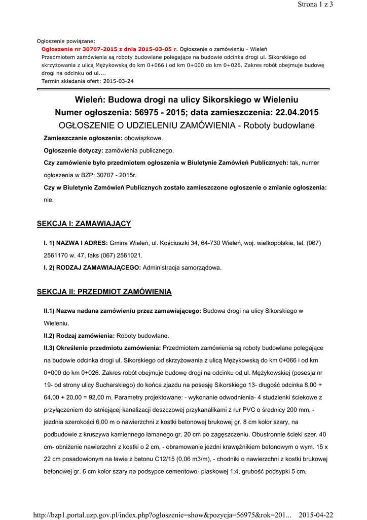 Strona 1 z 3 Ogłoszenie powiązane: Ogłoszenie nr 30707-2015 z dnia 2015-03-05 r. Ogłoszenie o zamówieniu - Wieleń Przedmiotem zamówienia są roboty budowlane polegające na budowie odcinka drogi ul. Sikorskiego od skrzyżowania z ulicą Mężykowską do km 0+066 i od km 0+000 do km 0+026. Zakres robót obejmuje budowę drogi na odcinku od ul.... Termin składania ofert: 2015-03-24 Wieleń: Budowa drogi na ulicy Sikorskiego w Wieleniu Numer ogłoszenia: 56975 - 2015; data zamieszczenia: 22.04.2015 OGŁOSZENIE O UDZIELENIU ZAMÓWIENIA - Roboty budowlane Zamieszczanie ogłoszenia: obowiązkowe. Ogłoszenie dotyczy: zamówienia publicznego. Czy zamówienie było przedmiotem ogłoszenia w Biuletynie Zamówień Publicznych: tak, numer ogłoszenia w BZP: 30707 - 2015r. Czy w Biuletynie Zamówień Publicznych zostało zamieszczone ogłoszenie o zmianie ogłoszenia: nie. SEKCJA I: ZAMAWIAJĄCY I. 1) NAZWA I ADRES: Gmina Wieleń, ul. Kościuszki 34, 64-730 Wieleń, woj. wielkopolskie, tel. (067) 2561170 w. 47, faks (067) 2561021. I. 2) RODZAJ ZAMAWIAJĄCEGO: Administracja samorządowa. SEKCJA II: PRZEDMIOT ZAMÓWIENIA II.1) Nazwa nadana zamówieniu przez zamawiającego: Budowa drogi na ulicy Sikorskiego w Wieleniu. II.2) Rodzaj zamówienia: Roboty budowlane. II.3) Określenie przedmiotu zamówienia: Przedmiotem zamówienia są roboty budowlane polegające na budowie odcinka drogi ul. Sikorskiego od skrzyżowania z ulicą Mężykowską do km 0+066 i od km 0+000 do km 0+026. Zakres robót obejmuje budowę drogi na odcinku od ul. Mężykowskiej (posesja nr 19- od strony ulicy Sucharskiego) do końca zjazdu na posesję Sikorskiego 13- długość odcinka 8,00 + 64,00 + 20,00 = 92,00 m. Parametry projektowane: - wykonanie odwodnienia- 4 studzienki ściekowe z przyłączeniem do istniejącej kanalizacji deszczowej przykanalikami z rur PVC o średnicy 200 mm, jezdnia szerokości 6,00 m o nawierzchni z kostki betonowej brukowej gr. 8 cm kolor szary, na podbudowie z kruszywa kamiennego łamanego gr. 20 cm po zagęszczeniu. Obustronnie ścieki szer. 40 cm- obniżenie nawierzchni z kostki o 2 cm, - obramowanie jezdni krawężnikiem betonowym o wym. 15 x 22 cm posadowionym na ławie z betonu C12/15 (0,06 m3/m), - chodniki o nawierzchni z kostki brukowej betonowej gr. 6 cm kolor szary na podsypce cementowo- piaskowej 1:4, grubość podsypki 5 cm, http://bzp1.portal.uzp.gov.pl/index.php?ogloszenie=show&pozycja=56975&rok=201... 2015-04-22 Strona 2 z 3 szerokość chodnika od 1,6 m do 1,85 m bez krawężnika i obrzeża, - zjazdy o nawierzchni z kostki betonowej brukowej gr. 8 cm kolor czerwony na podsypce cementowo- piaskowej 1:4 gr. 3 cm i podbudowie z chudego betonu gr. 15 cm, - obramowanie nawierzchni chodników i zjazdów obrzeżem betonowym o wymiarach 8x30 cm posadowionym na podsypce cementowo- piaskowej 1:4, uzupełnienie zieleni za chodnikiem naprzeciwko posesji nr 21, 19, 10. W zakresie zadania Wykonawca własnym kosztem i staraniem opracuje i uzgodni tymczasowy projekt organizacji ruchu przy włączeniu ulicy Sikorskiego do drogi powiatowej- ul. Mężykowska w Wieleniu. Roboty zostaną oznakowane zgodnie z ww. projektem organizacji ruchu. Zakres robót: 1) roboty pomiarowe- 0,234 km, 2) rozebranie chodnika z płyt betonowych- 101,59 m2, 3) rozebranie nawierzchni z płyt drogowych betonowych (bloczki M-6)- 13,55 m2, 4) rozebranie krawężników betonowych- 98,12 m, 5) rozebranie ław z betonu5,89 m3, 6) rozebranie nawierzchni z mieszanek mineralno- bitumicznych- 48,00 m2, 7) rozebranie obrzeży- 69,50 m, 8) załadowanie i wywóz gruzu z terenu budowy- 27,52 m3, 9) wykopy pod studzienki ściekowe i przykanaliki- 18,80 m3, 10) studzienki ściekowe uliczne z osadnikiem- 4 szt., 11) kanały z rur PCW o śr. 200 mm- 16,00 m, 12) zasypywanie wykopów- 16,60 m3, 13) roboty ziemne- wykonanie koryta- 228,38 m3, 14) profilowanie i zagęszczanie mechaniczne podłoża- 950,68 m2, 15) podbudowa z kruszyw łamanych 0/63 mm (za wyjątkiem kruszyw ze skał miękkich- wapieni, kruszyw uzyskanych z przekruszenia gruzu betonowego oraz kruszyw mało przekruszonych- nadziarna zawierające zbyt dużo ziarn okrągłych trudno zagęszczanych)- gr. warstwy po zagęszczeniu 20 cm- 553,31 m2, 16) podbudowa z chudego betonu na zjazdach, gr. po zagęszczeniu 15 cm- 142,15 m2, 17) ława betonowa z oporem pod krawężniki, beton C12/15 (0,06 m3/m)- 13,04 m3, 18) krawężniki betonowe o wym. 15x22 cm- 217,31 m, 19) nawierzchnia z kostki betonowej brukowej gr. 8 cm, kolor szary, na podsypce cementowo- piaskowej 1:4 gr. 4 cm, przy krawędziach jezdni ścieki o szer. 0,40 m (nawierzchnia obniżona o 2 cm)- 553,31 m2, 20) obrzeża betonowe o wym. 30x8 cm na podsypce cementowopiaskowej- 66,50 m, 21) nawierzchnia z kostki brukowej betonowej gr. 8 cm kolor czerwony na podsypce cementowo- piaskowej br. 4 cm (zjazdy)- 142,15 m2, 22) obrzeża betonowe o wym. 30x8 cm na podsypce cementowo- piaskowej 1:4- 156,97 m, 23) chodniki z kostki betonowej brukowej kolor szary, gr. 6 cm na podsypce cementowo- piaskowej 1:4 gr. 4 cm- 255,22 m2, 24) ziemia urodzajna pod zieleń18,68 m3, 25) plantowanie ręczne powierzchni gruntu rodzimego- 186,75 m2, 26) obsianie powierzchni ziemi urodzajnej- 186,75 m2, 27) regulacja pionowa włazów kanałowych- 4 szt., 28) regulacja zaworów wodociągowych i gazowych- 7 szt., 29) regulacja pionowa studzienek telefonicznych- 3 szt., 30) słupki z rur stalowych do znaków drogowych- 1 szt., 31) pionowe znaki ostrzegawcze A-7 ustąp pierwszeństwa odblaskowe- 1 szt., 32) roboty pomiarowe- inwentaryzacja geodezyjna powykonawcza- 1 kpl. Zamawiający zobowiązuje Wykonawcę do ujęcia w kalkulacji (ofercie) kosztów materiałów zgodnych z dokumentacją oraz STWiOR. Wskazane znaki towarowe, patenty lub pochodzenie materiałów i urządzeń służą jako pomocnicze, można zastosować materiały i urządzenia równoważne o równych lub lepszych parametrach technicznych. Użyte w projektach (lub opisach, rysunkach) materiał