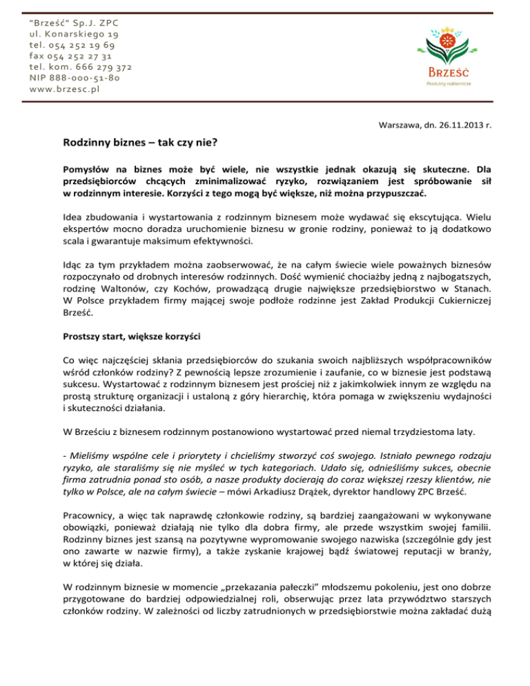 "Brześć" Sp. J. Z PC ul. Konarskiego 19 tel. 054 252 19 69 fax 054 252 27 31 tel. kom. 6 66 279 372 NIP 888-000-51-80 www.brzesc.pl Warszawa, dn. 26.11.2013 r. Rodzinny biznes – tak czy nie? Pomysłów na biznes może byd wiele, nie wszystkie jednak okazują się skuteczne. Dla przedsiębiorców chcących zminimalizowad ryzyko, rozwiązaniem jest spróbowanie sił w rodzinnym interesie. Korzyści z tego mogą byd większe, niż można przypuszczad. Idea zbudowania i wystartowania z rodzinnym biznesem może wydawad się ekscytująca. Wielu ekspertów mocno doradza uruchomienie biznesu w gronie rodziny, ponieważ to ją dodatkowo scala i gwarantuje maksimum efektywności. Idąc za tym przykładem można zaobserwowad, że na całym świecie wiele poważnych biznesów rozpoczynało od drobnych interesów rodzinnych. Dośd wymienid chociażby jedną z najbogatszych, rodzinę Waltonów, czy Kochów, prowadzącą drugie największe przedsiębiorstwo w Stanach. W Polsce przykładem firmy mającej swoje podłoże rodzinne jest Zakład Produkcji Cukierniczej Brześd. Prostszy start, większe korzyści Co więc najczęściej skłania przedsiębiorców do szukania swoich najbliższych współpracowników wśród członków rodziny? Z pewnością lepsze zrozumienie i zaufanie, co w biznesie jest podstawą sukcesu. Wystartowad z rodzinnym biznesem jest prościej niż z jakimkolwiek innym ze względu na prostą strukturę organizacji i ustaloną z góry hierarchię, która pomaga w zwiększeniu wydajności i skuteczności działania. W Brześciu z biznesem rodzinnym postanowiono wystartowad przed niemal trzydziestoma laty. - Mieliśmy wspólne cele i priorytety i chcieliśmy stworzyd coś swojego. Istniało pewnego rodzaju ryzyko, ale staraliśmy się nie myśled w tych kategoriach. Udało się, odnieśliśmy sukces, obecnie firma zatrudnia ponad sto osób, a nasze produkty docierają do coraz większej rzeszy klientów, nie tylko w Polsce, ale na całym świecie – mówi Arkadiusz Drążek, dyrektor handlowy ZPC Brześd. Pracownicy, a więc tak naprawdę członkowie rodziny, są bardziej zaangażowani w wykonywane obowiązki, ponieważ działają nie tylko dla dobra firmy, ale przede wszystkim swojej familii. Rodzinny biznes jest szansą na pozytywne wypromowanie swojego nazwiska (szczególnie gdy jest ono zawarte w nazwie firmy), a także zyskanie krajowej bądź światowej reputacji w branży, w której się działa. W rodzinnym biznesie w momencie „przekazania pałeczki” młodszemu pokoleniu, jest ono dobrze przygotowane do bardziej odpowiedzialnej roli, obserwując przez lata przywództwo starszych członków rodziny. W zależności od liczby zatrudnionych w przedsiębiorstwie można zakładad dużą "Brześć" Sp. J. Z PC ul. Konarskiego 19 tel. 054 252 19 69 fax 054 252 27 31 tel. kom. 6 66 279 372 NIP 888-000-51-80 www.brzesc.pl rozbieżnośd wiekową i różnorodnośd charakterów. Może to się przekładad na różnorodnośd pomysłów i potrzeb, a w dalszej mierze na bogatszy pluralizm oferowanych produktów i usług. Sentyment złym doradcą Jakkolwiek, tak jak wszystko ma swoje plusy i minusy, tak i w rodzinnym biznesie należy zwrócid uwagę na pewne zagrożenia. Nie zawsze interesy członków familii są zbieżne, co może prowadzid do mniejszych bądź większych konfliktów. Rodzinne przedsiębiorstwa raczej nie chcą zatrudniad osób z zewnątrz, a jeżeli już to robią, to w dalszej przyszłości nie mają oni perspektyw awansu na stanowiska kierownicze. Jednym z poważniejszych zagrożeo jest niewątpliwie zatrudnianie członka rodziny z sentymentu, biorąc pod uwagę jego pokrewieostwo, nie zaś posiadane umiejętności czy doświadczenie. Wierząc statystykom z badao przeprowadzonych w USA w 2012 roku, 40% rodzinnych firm jest w stanie przetrwad do drugiego pokolenia, 12% do trzeciego, natomiast tylko 3% do czwartego pokolenia. Średnia żywotnośd rodzinnego przedsiębiorstwa wynosi 24 lata. - Ta bariera jest już za nami, w przyszłym roku świętujemy 30-lecie firmy i wierzymy, że nie będzie to ostatni okrągły jubileusz – mówi Drążek. Młodsi członkowie przedsiębiorstwa są przede wszystkim bardziej otwarci na nowe trendy w technologii, bowiem urodzili się już w innej epoce, skomputeryzowanej w każdym calu. Jeśli do młodzieoczej fantazji i nieograniczonej kreatywności dodamy ogromny bagaż doświadczeo starszego pokolenia, oraz szczyptę zażyłości istniejącej między członkami rodziny, mamy gotowy przepis na sukces w biznesie. Wbrew pozorom, z rodziną niekoniecznie najlepiej wychodzi się tylko na zdjęciach… Kontakt dla mediów: Korneliusz Smolik [email protected] Tel: +48 510 796 217 ___ "Brześd" Sp.J. ZPC - Rodzinna firma istniejąca od 1984 roku. Brześd specjalizuje się w tradycyjnych, opartych na domowych recepturach wyrobów cukierniczych. Produkty Brześcia są sprzedawane poprzez przedstawicieli i dystrybutorów na terenie całej Polski.