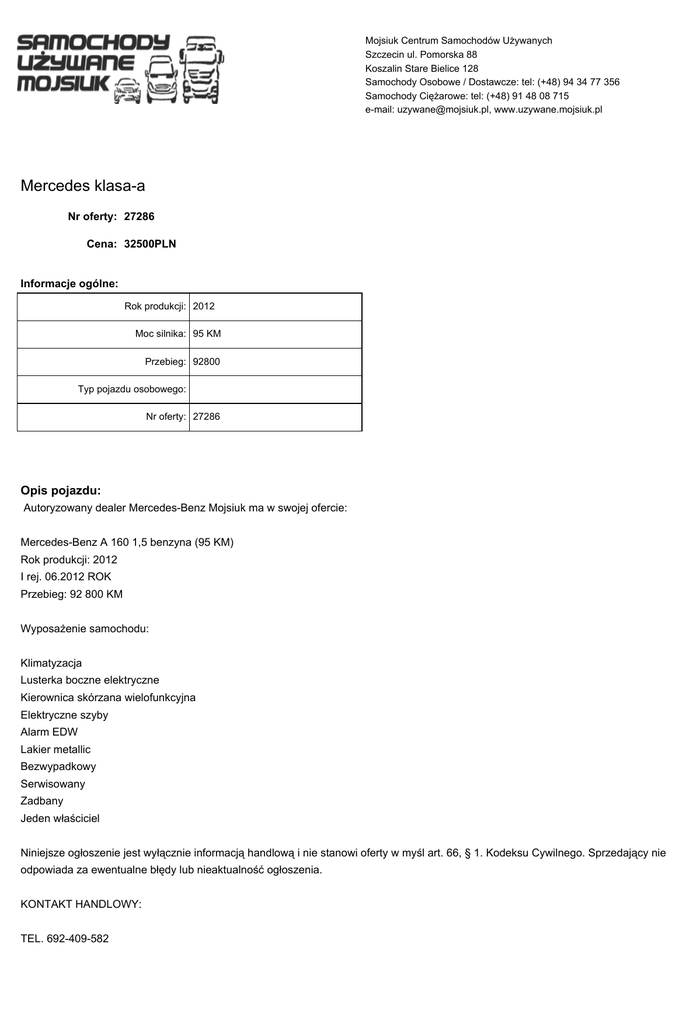 Mojsiuk Centrum Samochodów Używanych Szczecin ul. Pomorska 88 Koszalin Stare Bielice 128 Samochody Osobowe / Dostawcze: tel: (+48) 94 34 77 356 Samochody Ciężarowe: tel: (+48) 91 48 08 715 e-mail: [email protected], www.uzywane.mojsiuk.pl Mercedes klasa-a Nr oferty: 27286 Cena: 32500PLN Informacje ogólne: Rok produkcji: 2012 Moc silnika: 95 KM Przebieg: 92800 Typ pojazdu osobowego: Nr oferty: 27286 Opis pojazdu: Autoryzowany dealer Mercedes-Benz Mojsiuk ma w swojej ofercie: Mercedes-Benz A 160 1,5 benzyna (95 KM) Rok produkcji: 2012 I rej. 06.2012 ROK Przebieg: 92 800 KM Wyposażenie samochodu: Klimatyzacja Lusterka boczne elektryczne Kierownica skórzana wielofunkcyjna Elektryczne szyby Alarm EDW Lakier metallic Bezwypadkowy Serwisowany Zadbany Jeden właściciel Niniejsze ogłoszenie jest wyłącznie informacją handlową i nie stanowi oferty w myśl art. 66, § 1. Kodeksu Cywilnego. Sprzedający nie odpowiada za ewentualne błędy lub nieaktualność ogłoszenia. KONTAKT HANDLOWY: TEL. 692-409-582 TEL. 795-142-622 Jeżeli w naszej ofercie nie ma samochodu który Państwa interesuje proszę o kontakt telefoniczny pod nr tel. 795-142-622 lub przybycie do siedziby naszej firmy Mercedes-Benz Mojsiuk przy ul. Pomorskiej 88. Istnieje możliwość wyszukania indywidualnej oferty na samochód używany. 795-142-622 Jest to informacja handlowa nie stanowiąca oferty w rozumieniu prawa cywilnego, kolory na zdjęciach mogą być inne niż w rzeczywistości. Oferta nie przedstawia rzeczywistych stanów magazynowych