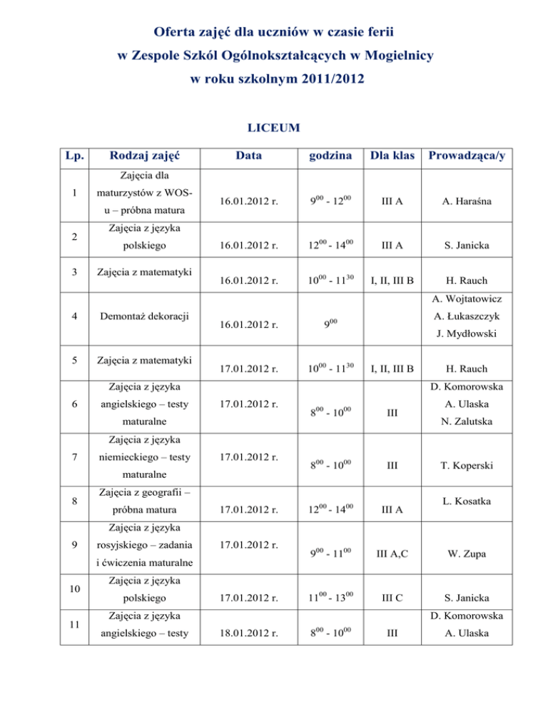 Oferta zajęć dla uczniów w czasie ferii w Zespole Szkól Ogólnokształcących w Mogielnicy w roku szkolnym 2011/2012 LICEUM Lp. Rodzaj zajęć Data godzina Dla klas Prowadząca/y 16.01.2012 r. 900 - 1200 III A A. Haraśna 16.01.2012 r. 1200 - 1400 III A S. Janicka 16.01.2012 r. 1000 - 1130 I, II, III B H. Rauch Zajęcia dla 1 maturzystów z WOSu – próbna matura 2 3 Zajęcia z języka polskiego Zajęcia z matematyki A. Wojtatowicz 4 5 Demontaż dekoracji Zajęcia z matematyki 16.01.2012 r. 900 17.01.2012 r. 1000 - 1130 A. Łukaszczyk J. Mydłowski I, II, III B Zajęcia z języka 6 angielskiego – testy H. Rauch D. Komorowska 17.01.2012 r. maturalne A. Ulaska 800 - 1000 III 800 - 1000 III 1200 - 1400 III A 900 - 1100 III A,C W. Zupa 1100 - 1300 III C S. Janicka N. Zalutska Zajęcia z języka 7 niemieckiego – testy 17.01.2012 r. maturalne 8 Zajęcia z geografii – próbna matura 17.01.2012 r. T. Koperski L. Kosatka Zajęcia z języka 9 rosyjskiego – zadania 17.01.2012 r. i ćwiczenia maturalne 10 11 Zajęcia z języka polskiego 17.01.2012 r. Zajęcia z języka angielskiego – testy D. Komorowska 18.01.2012 r. 800 - 1000 III A. Ulaska maturalne Zajęcia z języka 12 niemieckiego – testy 18.01.2012 r. 800 - 1000 III T. Koperski 900 - 1100 III A,C W. Zupa 18.01.2012 r. 1200 - 1400 III A L. Kosatka 18.01.2012 r. 900 - 1200 III B G. Rogalska 18.01.2012 r. 1100 - 1300 III C S. Janicka maturalne Zajęcia z języka 13 rosyjskiego – zadania 18.01.2012 r. i ćwiczenia maturalne 14 15 16 17 18 19 20 21. 22 23 Zajęcia z geografii – próbna matura Zajęcia z geografii – próbna matura Zajęcia z języka polskiego Przygotowanie do turnieju p.poż 18.01.2012 r. zgłoszone U. Tomala-Kujat A. Kłujszo- 1000 – 1200 osoby 19.01.2012 r. 900 - 1100 III B S. Janicka 19.01.2012 r. 1100 - 1300 III A S. Janicka 19.01.2012 r. 1100 - 1300 III B N. Zalutska 19.01.2012 r. 900 - 1200 III C J. Pawłowska 20.01.2012 r. 900 - 1100 III A S. Janicka 20.01.2012 r. 1100 - 1300 III B S. Janicka 1000 – 1230 III C J. Mydłowski Juścikowska Zajęcia z języka polskiego Zajęcia z języka polskiego Zajęcia z języka angielskiego Zajęcia z chemii – testy maturalne Zajęcia z języka polskiego Zajęcia z języka polskiego Zajęcia z biologii – 24 zadania i ćwiczenia poziom rozszerzony 20.01.2012 r.
