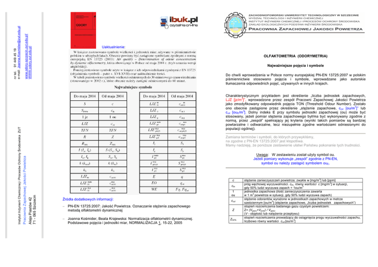 www.odory-szczecin.zut.edu.pl/ WWW.odory.zut.edu.pl OLFAKTOMETRIA (ODORYMETRIA) NajwaŜniejsze pojęcia i symbole Do chwili wprowadzenia w Polsce normy europejskiej PN-EN 13725:2007 w polskim piśmiennictwie stosowano pojęcia i symbole, wprowadzane jako autorskie tłumaczenia odpowiednich pojęć, uŜywanych w innych krajach. Charakterystycznym przykładem jest określenie „liczba jednostek zapachowych, LJZ [jz/m3]”, wprowadzone przez zespół Pracowni Zapachowej Jakości Powietrza jako zmodyfikowany odpowiednik pojęcia TON (Threshold Odour Number). Zostało ono obecnie zastąpione przez określenie „stęŜenie zapachowe, cod [ou/m3]” lub cod [ouE/m 3]. Dolny indeks E przy symbolu jednostki zapachowej (ou) moŜe być stosowany, jeŜeli pomiar stęŜenia zapachowego był/ma być wykonywany zgodnie z normą, przez „zespół” spełniający jej kryteria (wyniki takich pomiarów są bardziej powtarzalne i odtwarzalne, lecz niezupełnie zgodne wartościami odniesionymi do populacji ogólnej). Zamiana terminów i symboli, do których przywykliśmy, na zgodne z PN-EN 13725:2007 jest kłopotliwa. Mamy nadzieję, Ŝe poniŜsze zestawienie ułatwi Państwu pokonanie tych trudności. Uwaga: W zestawieniu został uŜyty symbol ou. JeŜeli pomiary wykonuje „zespół” zgodnie z PN-EN, symbol ou naleŜy zastąpić symbolem ouE. c cth Aleja Piastów 42 71 - 065 Szczecin Pracownia Zapachowej Jakości Powietrza nr tel. 91 449 45 19 e-mail: [email protected] Instytut InŜynierii Chemicznej i Procesów Ochrony Środowiska ZUT Uaktualnienie: 1 ou Źródła dodatkowych informacji: – PN-EN 13725:2007: Jakość Powietrza. Oznaczanie stęŜenia zapachowego metodą olfaktometrii dynamicznej – Joanna Kośmider, Beata Krajewska: Normalizacja olfaktometrii dynamicznej. Podstawowe pojęcia i jednostki miar, NORMALIZACJA 1, 15-22, 2005 cod Z Z50% stęŜenie zanieczyszczeń powietrza; zwykle w [mg/m3] lub [ppm] próg węchowej wyczuwalności. cth, równy wartości c [mg/m3] w sytuacji, gdy 50% ludzi wyczuwa zapach = 1ou/m3 jednostka zapachowa (ilość zanieczyszczenia zawarta w 1 m3 powietrza w sytuacji, gdy 50% ludzi wyczuwa zapach) stęŜenie odorantów wyraŜone w jednostkach zapachowych w metrze sześciennym [ou/m3] (stęŜenie zapachowe, „liczba jednostek zapachowych”) stopień rozcieńczenia badanego gazu czystym powietrzem: Z= (Vgazu+Vpow) / Vgazu (V - objętość lub natęŜenie przepływu) stopień rozcieńczenia prowadzący do osiągnięcia progu wyczuwalności zapachu, liczbowo równy wartości cod [ou/m3] S S 0, S Z k cod,60 : maks . cod 60 : 99 ,8 cod 60 : 98 cod 60 : cod,5 : cod,p : maks. cod p / t : intensywność zapachu; symbol w niektórych wypadkach zawiera indeks A lub B dodatkową informację o rodzaju zastosowanej skali intensywności: SA - uŜycie skali punktowej: 0, 1, 2, 3; SB - uŜycie wzorców n-butanolowych („krok” rozcieńczeń: zwykle 20/7) intensywność zapachu gazu nie rozcieńczonego (S0) i po rozcieńczeniu Z razy czystym powietrzem (SZ) współczynnik proporcjonalności w równaniu wiąŜącym intensywność zapachu z logarytmem stęŜenia lub rozcieńczenia (równanie Webera- Fechnera): S = k ⋅ log cod ; SZ = S0 - k ⋅ log Z S5 : Sp : maks. S p/t : maksymalna wartość Sp obserwowana w czasie piętnastu sekund (0,25 minuty), decydująca o ocenach intensywności zapachu notowanych co 15 sekund maks. S p /5 : maks . maksymalna z kolejnych wartości S p / 0 , 25 występujących w czasie pięciu minut terenowej kontroli zapachowej jakości powietrza cod,60 : średnia wartość cod w powietrzu otoczenia emitora, odniesiona do 60 minut maks . cod 60 : maksymalna w skali roku (lub sezonu) wartość cod,60, 99 ,8 cod 60 : średnia wartość cod w powietrzu otoczenia emitora, odniesiona do 60 minut, maksymalna w skali roku (lub sezonu) wartość cod,60, percentyl 99,8 cod,60 - stęŜenie obliczane na podstawie statystycznego rozkładu wielu 99 ,8 wyników pomiarów; wartości większe od cod 60 są stwierdzane w 0,2% pomiarów wykonanych w ciągu roku lub sezonu 98 cod 60 : percentyl 98 cod,60 - stęŜenie obliczane na podstawie statystycznego rozkładu wielu wyników pomiarów; wartości większe od 98 cod 60 są stwierdzane w 2% pomiarów wykonanych w ciągu roku lub sezonu średnia wartość cod w powietrzu otoczenia emitora, odniesiona do 5 minut kontroli terenowej, chwilowe stęŜenie odorantów, odniesione do najkrótszego czasu potrzebnego do percepcji zapachu (około 5 sekund) maksymalna wartość cod,p występująca w czasie t minut maks . maksymalna wartość cod,p występująca w czasie piętnastu sekund (0,25 minuty), cod p / 0 , 25 : decydująca o ocenach intensywności zapachu notowanych co 15 sekund maks. cod p / 5 : maks . S p / 0 , 25 : maks . maksymalna z kolejnych wartości cod p / 0 , 25 występujących w czasie pięciu minut terenowej kontroli zapachowej jakości powietrza średnia intensywność zapachu powietrza odniesiona do 5 minut kontroli chwilowa intensywność zapachu, obserwowana w najkrótszym czasie umoŜliwiającym percepcję - około 5 sekund (Sp ≈ S5 sekund) maksymalna wartość Sp obserwowana w czasie t minut 98 cod 60 : cod,5 : cod,p : maks. cod p / t : percentyl 99,8 cod,60 - stęŜenie obliczane na podstawie statystycznego rozkładu wielu wyników pomiarów; 99 ,8 wartości większe od cod 60 są stwierdzane w 0,2% pomiarów wykonanych w ciągu roku lub sezonu 98 cod 60 : percentyl 98 cod,60 - stęŜenie obliczane na podstawie 98 statystycznego rozkładu wielu wyników pomiarów; wartości większe od cod 60 są stwierdzane w 2% pomiarów wykonanych w ciągu roku lub sezonu średnia wartość cod w powietrzu otoczenia emitora, odniesiona do 5 minut kontroli terenowej chwilowe stęŜenie odorantów, odniesione do najkrótszego czasu potrzebnego do percepcji zapachu (około 5 sekund) maksymalna wartość cod,p występująca w czasie t minut maks . maksymalna wartość cod,p występująca w czasie piętnastu sekund (0,25 m