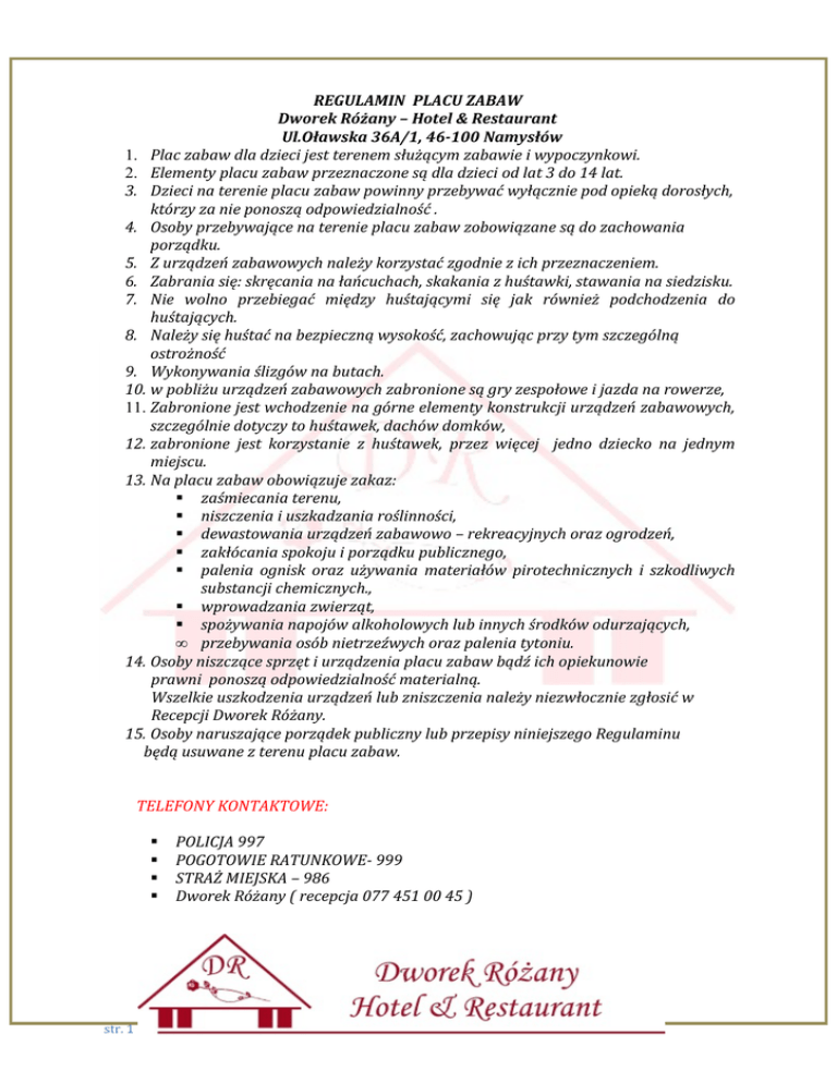 REGULAMIN PLACU ZABAW Dworek Różany – Hotel & Restaurant Ul.Oławska 36A/1, 46-100 Namysłów 1. Plac zabaw dla dzieci jest terenem służącym zabawie i wypoczynkowi. 2. Elementy placu zabaw przeznaczone są dla dzieci od lat 3 do 14 lat. 3. Dzieci na terenie placu zabaw powinny przebywać wyłącznie pod opieką dorosłych, którzy za nie ponoszą odpowiedzialność . 4. Osoby przebywające na terenie placu zabaw zobowiązane są do zachowania porządku. 5. Z urządzeń zabawowych należy korzystać zgodnie z ich przeznaczeniem. 6. Zabrania się: skręcania na łańcuchach, skakania z huśtawki, stawania na siedzisku. 7. Nie wolno przebiegać między huśtającymi się jak również podchodzenia do huśtających. 8. Należy się huśtać na bezpieczną wysokość, zachowując przy tym szczególną ostrożność 9. Wykonywania ślizgów na butach. 10. w pobliżu urządzeń zabawowych zabronione są gry zespołowe i jazda na rowerze, 11. Zabronione jest wchodzenie na górne elementy konstrukcji urządzeń zabawowych, szczególnie dotyczy to huśtawek, dachów domków, 12. zabronione jest korzystanie z huśtawek, przez więcej jedno dziecko na jednym miejscu. 13. Na placu zabaw obowiązuje zakaz: zaśmiecania terenu, niszczenia i uszkadzania roślinności, dewastowania urządzeń zabawowo – rekreacyjnych oraz ogrodzeń, zakłócania spokoju i porządku publicznego, palenia ognisk oraz używania materiałów pirotechnicznych i szkodliwych substancji chemicznych., wprowadzania zwierząt, spożywania napojów alkoholowych lub innych środków odurzających, • przebywania osób nietrzeźwych oraz palenia tytoniu. 14. Osoby niszczące sprzęt i urządzenia placu zabaw bądź ich opiekunowie prawni ponoszą odpowiedzialność materialną. Wszelkie uszkodzenia urządzeń lub zniszczenia należy niezwłocznie zgłosić w Recepcji Dworek Różany. 15. Osoby naruszające porządek publiczny lub przepisy niniejszego Regulaminu będą usuwane z terenu placu zabaw. TELEFONY KONTAKTOWE: str. 1 POLICJA 997 POGOTOWIE RATUNKOWE- 999 STRAŻ MIEJSKA – 986 Dworek Różany ( recepcja 077 451 00 45 )