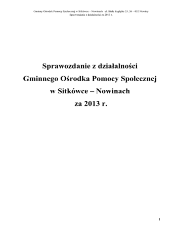 Gminny Ośrodek Pomocy Społecznej w Sitkówce – Nowinach ul. Białe Zagłębie 25, 26 – 052 Nowiny Sprawozdanie z działalności za 2013 r. Sprawozdanie z działalności Gminnego Ośrodka Pomocy Społecznej w Sitkówce – Nowinach za 2013 r. 1 Gminny Ośrodek Pomocy Społecznej w Sitkówce – Nowinach ul. Białe Zagłębie 25, 26 – 052 Nowiny Sprawozdanie z działalności za 2013 r. Podstawa prawna: Art. 110 ust 9 Ustawy z dnia 12 marca 2004 r. o pomocy społecznej (Dz. U z 2013 r. poz. 182) Ośrodek Pomocy Społecznej działa oraz realizuje zadania wynikające z następujących ustaw: 1. Ustawy z dnia 8 marca 1990 r. o samorządzie gminnym (Dz. U. z 2013 r., poz. 594 ze zmianami), 2. Ustawy z dnia 12 marca 2004 r. o pomocy społecznej (Dz. U. z 2013 r. poz. 182) i wydanych na jej podstawie aktów wykonawczych. 3. Ustawy z dnia 27 sierpnia 2009 r. o finansach publicznych ( Dz. U. z 2013 r. poz. 885 ze zmianami.) 4. Ustawy z dnia 13 listopada 2003 r. o dochodach jednostek samorządu terytorialnego (tekst jedn.: Dz. U. z 2010r. Nr 80, poz. 526 ze zmianami.) 5. Ustawy z dnia 29 września 1994 r. o rachunkowości (Dz. U. z 2013 r. poz. 330 ze zmianami) 6. Ustawy z dnia 21 listopada 2008 r. o pracownikach samorządowych ( Dz. U. z 2008 Nr 223, poz. 1458 ze zmianami) oraz wydanych na jej podstawie aktów wykonawczych. 7. Ustawy z dnia 13 października 1998 r. o systemie ubezpieczeń społecznych (Dz. U. z 2013 r. poz. 1442 ze zmianami.) 8. Ustawy z dnia 19 sierpnia 1994 r. o ochronie zdrowia psychicznego (Dz. U. z 2011 r. Nr 231, poz. 1375 ze zmianami.) 9. Ustawy z dnia 14 czerwca 1960 r.- Kodeksu postępowania administracyjnego (Dz. U. z 2013 r. poz. 267.) 10. Ustawy z dnia 21 czerwca 2001r. o dodatkach mieszkaniowych (Dz. U. z 2013 r. poz. 966 ze zmianami.) 11. Ustawy z dnia 7 września 2007 r. o pomocy osobom uprawnionym do alimentów (Dz. U. z 2012 r. poz.1228 ze zmianami) 12. Ustawy z dnia 28 listopada 2003 r. o świadczeniach rodzinnych (Dz. U. z 2013 r. poz. 1456 ze zmianami.) 13. Ustawy z dnia 27 sierpnia 2004 r. o świadczeniach opieki zdrowotnej finansowanych ze środków publicznych (Dz. U. z 2008 r. Nr 164, poz. 1027 ze zmianami.) 14. Ustawy z dnia 29 lipca 2005 r. o przeciwdziałaniu przemocy w rodzinie (Dz. U. z 2005 r. Nr 180, poz. 1493 ze zmianami.) 15. Ustawy z dnia 17 czerwca 1966 r. o postępowaniu egzekucyjnym w administracji (Dz. U. z 2012 r., poz. 1015 ze zmianami.) 16. Ustawy z dnia 9 czerwca 2011 r. o wspieraniu rodziny i systemie pieczy zastępczej (Dz. U. z 2013 r., poz. 135 ze zmianami.) 17. Ustawy z dnia 7 września 1991 r. o systemie oświaty (Dz. U. z 2004 r. Nr 256, poz. 2572 ze zmianami.) 2 Gminny Ośrodek Pomocy Społecznej w Sitkówce – Nowinach ul. Białe Zagłębie 25, 26 – 052 Nowiny Sprawozdanie z działalności za 2013 r. 18. Uchwały Nr I/56/90 Rady Gminy Sitkówka - Nowiny z dnia 05.03.1990 r. w sprawie utworzenia jednostki budżetowej pod nazwą "Gminny Ośrodek Pomocy Społecznej w Sitkówce - Nowinach". 19. Innych aktów prawnych dotyczącej jego działalności; Ośrodek Pomocy Społecznej w Sitkówce-Nowinach realizował w roku 2013 zadania wynikające z art. 17 ust 1-2 oraz 18 ust.1-2 Ustawy z dnia 12 marca 2004 r. o pomocy społecznej (Dz. U. Nr z 2013 r. poz. 182 ze zmianami), art. 176 Ustawy z dnia 9 czerwca 2011 r. o wspieraniu rodziny i systemie pieczy zastępczej (Dz. U. Nr 149, poz. 887 ze zmianami.), Ustawy z dnia 29 grudnia 2005 r. o ustanowieniu programu wieloletniego „Pomoc państwa w zakresie dożywiania” (Dz. U. Nr 267, poz. 2258). Podstawą działania były również akty wykonawcze do ustawy o pomocy społecznej, a w szczególności Rozporządzenie Rady Ministrów z dnia 7 lutego 2006 r. w sprawie realizacji programu wieloletniego „Pomoc państwa w zakresie dożywiania” (Dz. U. Nr 25 poz. 185), Rozporządzenie Ministra Polityki Społecznej z dnia 22 września 2005 r. w sprawie specjalistycznych usług opiekuńczych (Dz. U Nr 189 poz. 1598), Rozporządzenie Rady Ministrów z dnia 17 lipca 2012 r. roku w sprawie zweryfikowanych kryteriów dochodowych oraz kwot świadczeń pieniężnych z pomocy społecznej (Dz. U. z 2012, poz.823) Rozporządzenie Ministra Pracy i Polityki Społecznej z dnia 23 sierpnia 2012 r. w sprawie domów pomocy społecznej (Dz. U. z 2012, poz. 964), a także Ustawa z dnia 29 lipca 2005 r. o przeciwdziałaniu przemocy w rodzinie (Dz. U Nr 180 poz. 1493 z 2005 r. ze zmianami), Ustawa z dnia 20 kwietnia 2004 r. o promocji zatrudnienia i instytucjach rynku pracy (Dz. U Nr 99 poz.1001 z 2004 r. ze zmianami.), Ustawa z dnia 19 sierpnia 1994 o ochronie zdrowia psychicznego ( Dz. U Nr 111 poz. 535 z 1994 r. ze zmianami.) Gminny Ośrodek Pomocy Społecznej jest jednostką organizacyjną Gminy Sitkówka – Nowiny. Działa na podstawie Statutu zatwierdzonego Uchwałą Nr RG – XXIX / 240/13 Rady Gminy Sitkówka – Nowiny z dnia 27 marca 2013 r., oraz regulaminu Organizacyjnego Gminnego Ośrodka Pomocy Społecznej w Sitkówce – Nowinach zatwierdzonego Zarządzeniem Nr WG – 18/GOPS/2010 Wójta Gminy Sitkówka – Nowiny z dnia 12 lutego 2010 r. Przedmiotem działalności Gminnego Ośrodka Pomocy Społecznej w Sitkówce Nowinach jest realizacja polityki społecznej państwa mającą na celu umożliwienie osobom i rodzinom przezwyciężanie trudnych sytuacji życiowych, których nie są one w stanie 3 Gminny Ośrodek Pomocy Społecznej w Sitkówce – Nowinach ul. Białe Zagłębie 25, 26 – 052 Nowiny Sprawozdanie z działalności za 2013 r. pokonać wykorzystując własne środki, możliwości i uprawnienia. Nadrzędnym celem jest zaspokajanie niezbędnych potrzeb życiowych osób i rodzin oraz umożliwienie im bytowania w warunkach odpowiadających godności człowieka, poprzez podejmowanie działań zmierzających do życiowego usamodzielnienia osób i rodzin oraz ich integracji ze środowiskiem. Zadania własne Zgodnie z art. 17 ustawy o pomocy społecznej do zadań własnych gminy o charakterz
