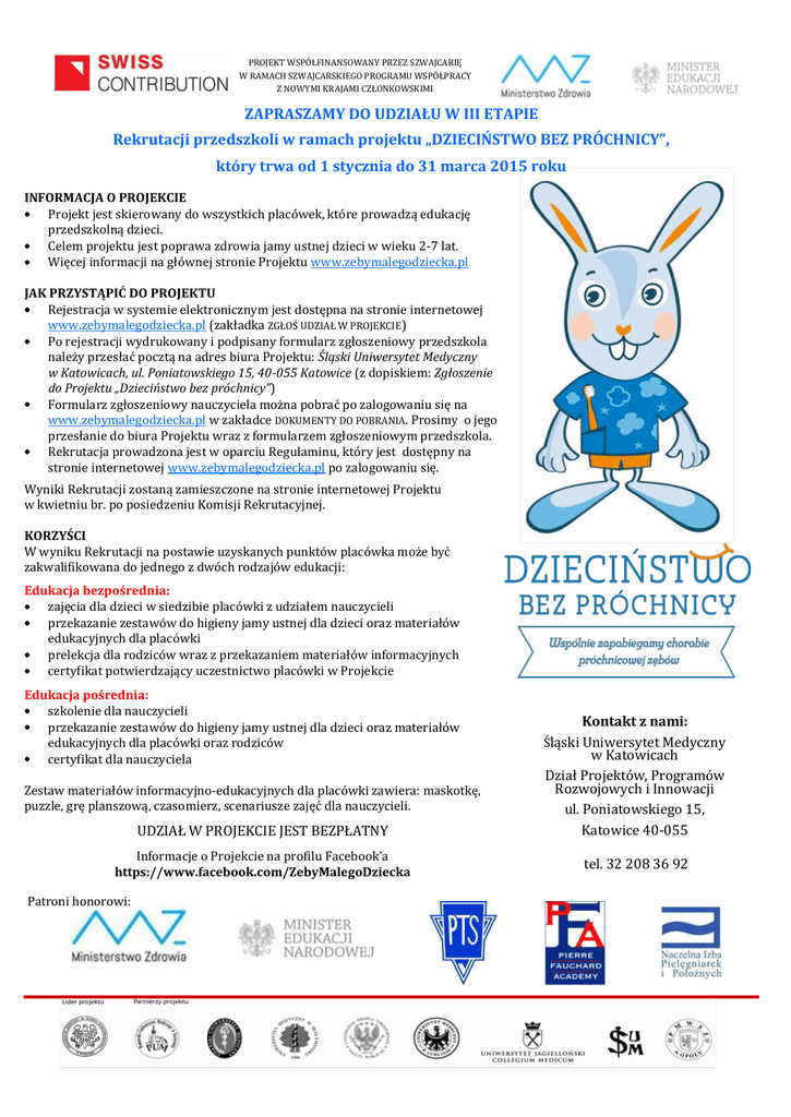 PROJEKT WSPÓŁFINANSOWANY PRZEZ SZWAJCARIĘ W RAMACH SZWAJCARSKIEGO PROGRAMU WSPÓŁPRACY Z NOWYMI KRAJAMI CZŁONKOWSKIMI ZAPRASZAMY DO UDZIAŁU W III ETAPIE Rekrutacji przedszkoli w ramach projektu „DZIECIŃSTWO BEZ PRÓCHNICY”, który trwa od 1 stycznia do 31 marca 2015 roku INFORMACJA O PROJEKCIE Projekt jest skierowany do wszystkich placówek, które prowadzą edukację przedszkolną dzieci. Celem projektu jest poprawa zdrowia jamy ustnej dzieci w wieku 2-7 lat. Więcej informacji na głównej stronie Projektu www.zebymalegodziecka.pl JAK PRZYSTĄPIĆ DO PROJEKTU Rejestracja w systemie elektronicznym jest dostępna na stronie internetowej www.zebymalegodziecka.pl (zakładka ZGŁOŚ UDZIAŁ W PROJEKCIE) Po rejestracji wydrukowany i podpisany formularz zgłoszeniowy przedszkola należy przesłać pocztą na adres biura Projektu: Śląski Uniwersytet Medyczny w Katowicach, ul. Poniatowskiego 15, 40-055 Katowice (z dopiskiem: Zgłoszenie do Projektu „Dzieciństwo bez próchnicy”) Formularz zgłoszeniowy nauczyciela można pobrać po zalogowaniu się na www.zebymalegodziecka.pl w zakładce DOKUMENTY DO POBRANIA. Prosimy o jego przesłanie do biura Projektu wraz z formularzem zgłoszeniowym przedszkola. Rekrutacja prowadzona jest w oparciu Regulaminu, który jest dostępny na stronie internetowej www.zebymalegodziecka.pl po zalogowaniu się. Wyniki Rekrutacji zostaną zamieszczone na stronie internetowej Projektu w kwietniu br. po posiedzeniu Komisji Rekrutacyjnej. KORZYŚCI W wyniku Rekrutacji na postawie uzyskanych punktów placówka może być zakwalifikowana do jednego z dwóch rodzajów edukacji: Edukacja bezpośrednia: zajęcia dla dzieci w siedzibie placówki z udziałem nauczycieli przekazanie zestawów do higieny jamy ustnej dla dzieci oraz materiałów edukacyjnych dla placówki prelekcja dla rodziców wraz z przekazaniem materiałów informacyjnych certyfikat potwierdzający uczestnictwo placówki w Projekcie Edukacja pośrednia: szkolenie dla nauczycieli przekazanie zestawów do higieny jamy ustnej dla dzieci oraz materiałów edukacyjnych dla placówki oraz rodziców certyfikat dla nauczyciela Zestaw materiałów informacyjno-edukacyjnych dla placówki zawiera: maskotkę, puzzle, grę planszową, czasomierz, scenariusze zajęć dla nauczycieli. UDZIAŁ W PROJEKCIE JEST BEZPŁATNY Informacje o Projekcie na profilu Facebook’a https://www.facebook.com/ZebyMalegoDziecka Patroni honorowi: Kontakt z nami: Śląski Uniwersytet Medyczny w Katowicach Dział Projektów, Programów Rozwojowych i Innowacji ul. Poniatowskiego 15, Katowice 40-055 tel. 32 208 36 92