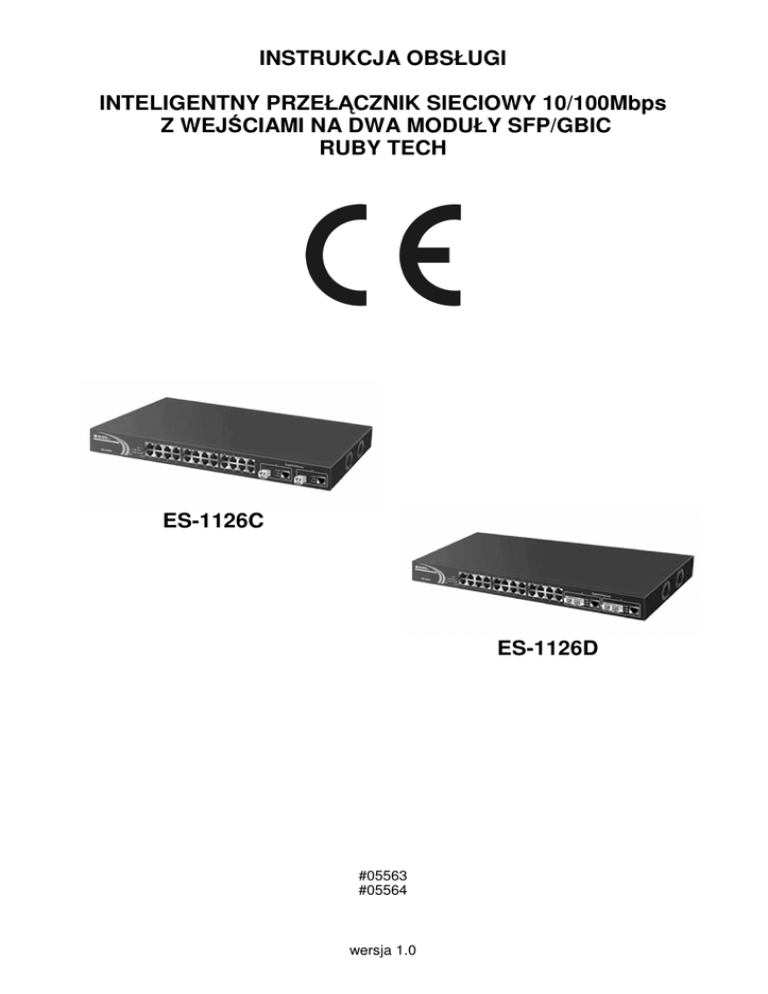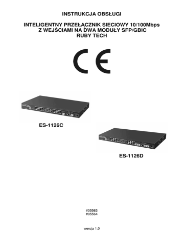 INSTRUKCJA OBSŁUGI INTELIGENTNY PRZEŁĄCZNIK SIECIOWY 10/100Mbps Z WEJŚCIAMI NA DWA MODUŁY SFP/GBIC RUBY TECH ES-1126C ES-1126D #05563 #05564 wersja 1.0 Wstęp Inteligentny przełącznik ES-1126C/D jest zarządzalnym, wysokowydajnym przełącznikiem sieciowym wyposaŜonym w 24 porty RJ-45 10/100 Mbps. Wbudowane 2 gniazda SFP/GBIC umoŜliwiają rozbudowę urządzenia o dodatkowe porty światłowodowe 1000Mbps. Urządzenie spełnia wymagania standardów IEEE802.3/u/x/z dla przełączników Fast Ethernet i Gigabit Ethernet. Zarządzanie odbywa się za pomocą protokołu HTTP. Administracja obejmuje m.in. kontrolę przepustowości, statystyki, funkcje zapewniania jakości transmisji QoS, limitowanie dostępu do portów itp. Przełącznik moŜe być montowany w szafach 19''. Dwa ostatnie porty obsługują dwa rodzaje mediów: miedziane i światłowodowe. Porty te wyposaŜone są w funkcję auto-detect (urządzenie rozpoznaje rodzaj przyłączonego medium). OstrzeŜenie NaleŜy zapewnić bezpieczne warunki pracy urządzenia. Dokonanie przez uŜytkownika jakichkolwiek własnych zmian w urządzeniu moŜe spowodować utratę moŜliwości jego legalnego uŜytkowania. Bezpieczeństwo uŜytkowania Urządzenie zostało zaprojektowane i wyprodukowane z najwyŜszą starannością o bezpieczeństwo osób instalujących i uŜytkujących. Dla zapewnienia bezpieczeństwa pracy, naleŜy stosować się do wszelkich wskazań zawartych w tej instrukcji jak i instrukcjach obsługi urządzeń towarzyszących (np. komputera PC). 1. Zawartość opakowania - inteligentny przełącznik ES-1126C lub ES-1126D, - kabel zasilający, - uchwyty mocujące do szafy 19”, - niniejsza instrukcja obsługi. Podczas dostawy naleŜy upewnić się, Ŝe opakowanie nie jest uszkodzone. W przypadku stwierdzonych uszkodzeń naleŜy niezwłocznie skontaktować się z dostawcą. Prosimy równieŜ o sprawdzenie zgodności zawartości opakowania z powyŜej zamieszczoną listą. 2. Zawartość instrukcji Instrukcja ta zawiera opis przełącznika sieciowego ES-1126C/D z odpowiednimi procedurami instalacji, konfiguracji i uŜytkowania. Przed przystąpieniem do instalacji urządzenia naleŜy dokładnie przeczytać całość tej instrukcji, w szczególności zaś punkty poświęcone bezpieczeństwu. 3. Zasady bezpieczeństwa Przełącznik sieciowy ES-1126C/D jest zgodny z przepisami w zakresie bezpieczeństwa uŜytkowania urządzeń elektrycznych. - Gniazdo sieciowe musi być uziemione zgodnie z obowiązującymi przepisami. - Przed przeniesieniem lub wykonywaniem innych operacji technicznych urządzenie naleŜy odłączyć od zasilania. - Nie stosować uszkodzonych lub zuŜytych przewodów zasilania, gdyŜ powodują one znaczne zagroŜenie dla bezpieczeństwa uŜytkownika. - Prace instalacyjne muszą być wykonywane przez odpowiednio przeszkolony personel techniczny. - Nie stosować urządzenia w miejscach występowania substancji łatwopalnych. - Zabezpieczyć urządzenie przed dostępem dzieci lub osób niepowołanych. - Upewnić się, Ŝe urządzenie zostało odpowiednio zamocowane. - Urządzenie jest wyłączone dopiero po odłączeniu przewodów zasilania oraz przewodów łączących je z innymi urządzeniami. - Jeśli urządzenie zostanie przeniesione z miejsca chłodnego do ciepłego, w jego wnętrzu moŜe skroplić się para wodna uniemoŜliwiając prawidłowe funkcjonowanie. NaleŜy wówczas odczekać, aŜ wilgoć odparuje. Uwaga: Nie naleŜy dotykać styków gniazd znajdujących się na obudowie urządzenia. Wyładowanie elektrostatyczne moŜe spowodować trwałe uszkodzenie urządzenia. 2 4. Instalacja sprzętu 4.1. Zasilanie Przełącznik sieciowy ES-1126C/D jest zasilany z wbudowanego zasilacza. Przy pomocy załączonego przewodu zasilania naleŜy podłączyć urządzenie do sieci 230V. 4.2. Oprogramowanie Do prawidłowego oprogramowania. funkcjonowania przełącznika nie jest wymagane instalowanie dodatkowego 4.3. Środowisko pracy NaleŜy zadbać, aby urządzenie umieszczone było w sposób zapewniający dobry przepływ powietrza i łatwy dostęp do portów. Powietrze powinno być wolne od zanieczyszczeń, a urządzenie nie powinno znajdować się w bezpośredniej bliskości źródeł ciepła (piece, grzejniki, bezpośrednie nasłonecznienie) bądź urządzeń generujących zakłócenia elektromagnetyczne (silniki, telewizory itp.). 4.4. Wskaźniki LED Przełącznik sieciowy ES-1126C/D naleŜy umieścić w taki sposób, by było widać diody kontrolne umieszczone na przednim panelu urządzenia. Opis diod LED (w niektórych wersjach urządzeń nie występują wszystkie wymienione wskaźniki LED) POWER Świecenie ciągłe oznacza włączone zasilanie CPU ACT Świecenie pulsacyjne oznacza pracę procesora LINK/ACT Świecenie ciągłe diody oznacza poprawne podłączenie innego urządzenia do portu, świecenie pulsacyjne oznacza przesyłanie pakietów przez port. 100/10Mbps SFP/GBIC Zielony kolor światła oznacza pracę portu w trybie 1000Mbps. Bursztynowy kolor oznacza pracę portu w trybie 100Mbps. Natomiast brak światła oznacza brak połączenia. Świecenie ciągłe oznacza poprawne połączenie poprzez moduł SFP/GBIC. 5. Instalacja okablowania Dla połączenia przełącznika sieciowego z innymi urządzeniami sieciowymi zaleca się stosowanie przyłączy odpowiednich dla typu wbudowanych weń portów. Specyfikacja przyłączy UTP: - przełącznik sieciowy obsługuje funkcje auto-krosowania MDI/MDI-X, z tego powodu do podłączenia elementów sieci aktywnych i pasywnych moŜna wykorzystać przyłącza krosowane (cross-over) i niekrosowane (straight-through), - do połączenia przełącznika sieciowego z komputerem naleŜy wykorzystać przyłącze UTP o parametrach: dla standardu Fast Ethernet - kategoria kabli 5 lub 5e, - maksymalna długość zastosowanego przyłącza UTP 100 metrów, - porty: 25, 26 obsługują dwa typy mediów: TP (miedziane) lub moduły optyczne. Opcjonalne moduły SFP obsługują funkcję „hot swap