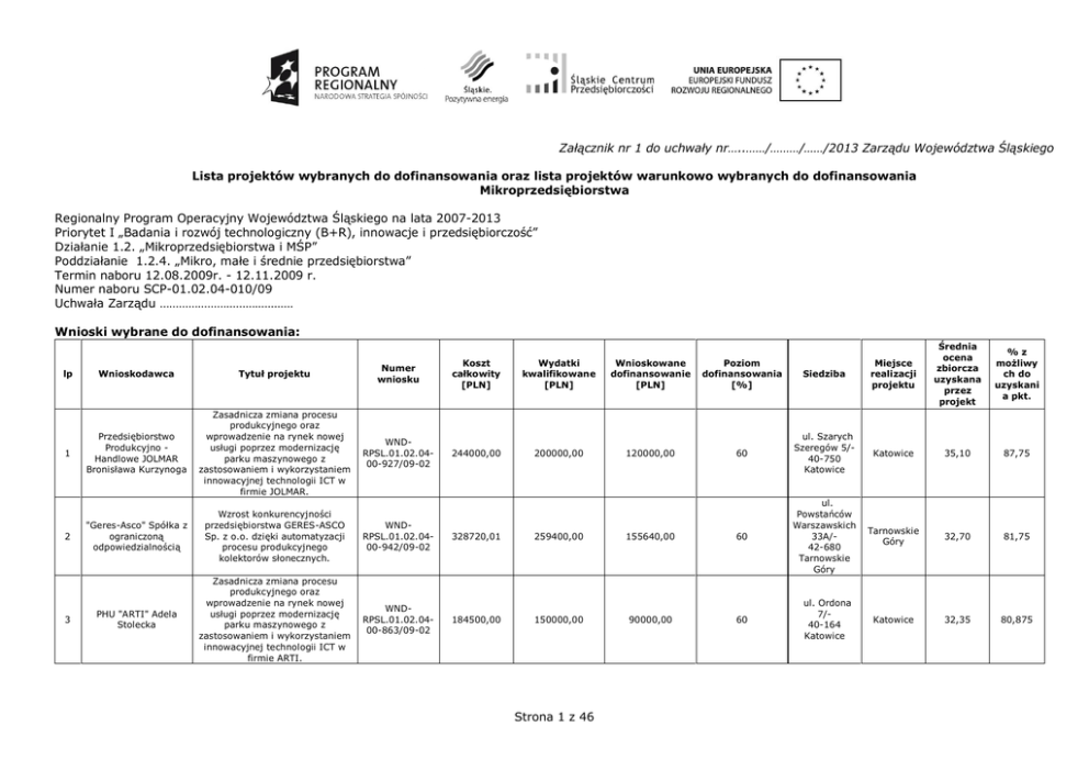 Załącznik nr 1 do uchwały nr…..……/………/……/2013 Zarządu Województwa Śląskiego Lista projektów wybranych do dofinansowania oraz lista projektów warunkowo wybranych do dofinansowania Mikroprzedsiębiorstwa Regionalny Program Operacyjny Województwa Śląskiego na lata 2007-2013 Priorytet I „Badania i rozwój technologiczny (B+R), innowacje i przedsiębiorczość” Działanie 1.2. „Mikroprzedsiębiorstwa i MŚP” Poddziałanie 1.2.4. „Mikro, małe i średnie przedsiębiorstwa” Termin naboru 12.08.2009r. - 12.11.2009 r. Numer naboru SCP-01.02.04-010/09 Uchwała Zarządu …………………………………… Wnioski wybrane do dofinansowania: lp 1 2 3 Siedziba Miejsce realizacji projektu Średnia ocena zbiorcza uzyskana przez projekt %z możliwy ch do uzyskani a pkt. 60 ul. Szarych Szeregów 5/40-750 Katowice Katowice 35,10 87,75 ul. Powstańców Warszawskich 33A/42-680 Tarnowskie Góry Tarnowskie Góry 32,70 81,75 Katowice 32,35 80,875 Koszt całkowity [PLN] Wydatki kwalifikowane [PLN] Wnioskowane dofinansowanie [PLN] Poziom dofinansowania [%] 244000,00 200000,00 120000,00 Wnioskodawca Tytuł projektu Numer wniosku Przedsiębiorstwo Produkcyjno Handlowe JOLMAR Bronisława Kurzynoga Zasadnicza zmiana procesu produkcyjnego oraz wprowadzenie na rynek nowej usługi poprzez modernizację parku maszynowego z zastosowaniem i wykorzystaniem innowacyjnej technologii ICT w firmie JOLMAR. WNDRPSL.01.02.0400-927/09-02 "Geres-Asco" Spółka z ograniczoną odpowiedzialnością Wzrost konkurencyjności przedsiębiorstwa GERES-ASCO Sp. z o.o. dzięki automatyzacji procesu produkcyjnego kolektorów słonecznych. WNDRPSL.01.02.0400-942/09-02 328720,01 259400,00 155640,00 60 PHU "ARTI" Adela Stolecka Zasadnicza zmiana procesu produkcyjnego oraz wprowadzenie na rynek nowej usługi poprzez modernizację parku maszynowego z zastosowaniem i wykorzystaniem innowacyjnej technologii ICT w firmie ARTI. WNDRPSL.01.02.0400-863/09-02 184500,00 150000,00 90000,00 60 Strona 1 z 46 ul. Ordona 7/40-164 Katowice 4 AZCO Polskie Meble Biurowe Edward Balicki Poszerzenie oferty handlowej o nowe produkty w oparciu o wdrożenie nowoczesnej maszyny WNDRPSL.01.02.0400-574/09-02 5 Arriba S.C Maria Julia Barboza De Sztyler, Jacek Sztyler Budowa mroźni, zakup wyposażenia oraz wprowadzenie ISO celem wzrostu konkurencyjności Firmy Arriba S.C WNDRPSL.01.02.0400-277/09-02 6 Wielospecjalistyczny Niepubliczny Zakład Opieki Zdrowotnej PROMED Mariola Wiatr Wzrost konkurencyjności Niepublicznego Zakładu Opieki Zdrowotnej PROMED poprzez zakup nowoczesnego sprzetu specjalistycznego. WNDRPSL.01.02.0400-784/09-02 166823,80 155910,11 7 Matterhorn Weronika Jaromin Innowacyjny sklep internetowy WNDRPSL.01.02.0400-A09/09-02 249406,14 198221,52 8 Prywatna Praktyka Dentystyczna Lek. dent. Daniel Dłucik Wzrost konkurencyjności i rozwój Praktyki Dentystycznej poprzez zakup nowego sprzętu. WNDRPSL.01.02.0400-570/09-02 9 Dariusz Mierzwa GRAFICOM Zakup nowoczesnego sprzętu jako lokata gwarantująca Klientom korzystanie z najwyższej jakości usług wirtualnego świata. WNDRPSL.01.02.0400-663/09-02 10 Praktyka Stomatologiczna Maria Krzemień Wzrost konkurencyjności i rozszerzenie zakresu usług Praktyki Stomatologicznej poprzez zakup specjalistycznego sprzętu diagnostycznoleczniczego. WNDRPSL.01.02.0400-257/09-03 140526,00 109835,25 11 Firma Usługowo Handlowa AKRA II Małgorzata Wróbel Rozwój Firmy UsługowoHandlowej AKRA II Małgorzata Wróbel z Bielska-Białej poprzez zakup specjalnego samochodu ratownictwa drogowego. WNDRPSL.01.02.0400-073/09-02 923867,94 753500,00 591382,62 213681,94 401000,00 117655,13 568190,47 162194,95 360164,24 83487,08 Strona 2 z 46 34,9 ul. Grażyńskiego 65/Nie d 43-300 Bielsko-Biała BielskoBiała 31,68 79,1875 59,84 ul. Obroki 130/40-833 Katowice Katowice 31,60 79 93530,47 59,99 ul. Żeromskiego 34/17 41-902 Bytom Bytom 31,45 78,625 118932,91 60 ul. Fabryczna 7/ 41-400 Mysłowice Mysłowice 31,40 78,5 53,62 ul. Panewnicka 35/40-730 Katowice Katowice 31,35 78,375 59,99 ul. Bożogrobców 3/41-503 Chorzów Chorzów 31,13 77,8125 65890,17 59,99 ul. M. SkłodowskiejCurie 30/2 40-058 Katowice Katowice 31,00 77,5 199978,90 26,54 ul. Palmowa 12/-43-300 Bielsko-Biała BielskoBiała 30,85 77,125 198298,47 97057,46 193120,07 50083,91 MEDIA, STUDIO REKLAMY, DRUKARNIA PRZYBYLAK RAFAŁ Wdrożenie innowacyjnego systemu cyfrowego naświetlania termicznych form drukowych w Media, Studio Reklamy, Drukarnia WNDRPSL.01.02.0400-892/09-02 13 Urkom Adam Nocoń Wzrost konkurencyjności Firmy Urkom poprzez remont pomieszczeń wraz z niezbędnymi zakupami inwestycyjnymi. WNDRPSL.01.02.0400-906/09-02 14 Biuro Obsługi Inwestycji - Piotr Urbanek Zakup nowoczesnej aparatury geodezyjnej - podstawą rozwoju i wzrostu konkurencyjności Firmy. WNDRPSL.01.02.0400-091/09-02 81764,40 61020,00 15 STB Spółka z ograniczoną odpowiedzialnością Nowy oddział - nowy etap rozwoju STB Sp. z o. o. WNDRPSL.01.02.0400-087/09-02 244004,57 76688,69 16 Przedsiębiorstwo Wielobranżowe MAXIMUS Radosław Kasprzyk Budowa i przebudowa obiektów firmy Maximus Radosław Kasprzyk w celu rozwoju działalności eksportowej. WNDRPSL.01.02.0400-702/09-02 17 Polvet Healthcare Teodorowski Spółka Jawna Utworzenie pracowni rentgena cyfrowego drogą do wzrostu konkurencyjności Polvet Healthcare WNDRPSL.01.02.0400-567/09-02 18 Przedsiebiorstwo ProdukcyjnoUsługowo-Handlowe "ROS" Roman Sakowski Zakup nowoczesnych maszyn do produkcji opakowań ekologicznych i wykonywania usług poligraficznych. WNDRPSL.01.02.0400-636/09-02 126971,82 74056,60 19 Niepubliczny Zakład Opieki Zdrowotnej, Praktyka Stomatologiczna Marmol Dariusz Zakup nowoczesnej aparatury medycznej do gabinetu stomatologicznego w Katowicach WNDRPSL.01.02.0400-127/09-02 235854,80 219495,40 12 399141,98 354591,78 621208,17 379160,00 324865,56 232859,82 426417,51 333250,00 Strona 3 z 46 ul. Kołłątaja 73/ 42-500 Będzin Będzin 30,80 77 59,52 ul. Paderewskieg o 42/41-810 Zabrze