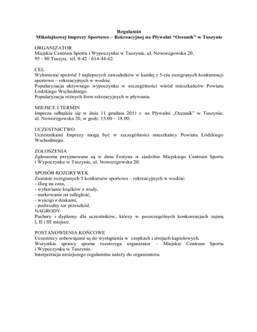 Regulamin Mikołajkowej Imprezy Sportowo – Rekreacyjnej na Pływalni “Oceanik” w Tuszynie ORGANIZATOR Miejskie Centrum Sportu i Wypoczynku w Tuszynie, ul. Noworzgowska 20, 95 - 80 Tuszyn; tel. 0-42 / 614-44-62. CEL Wyłonienie spośród 3 najlepszych zawodników w każdej z 5-ciu rozegranych konkurencji sportowo – rekreacyjnych w wodzie. Popularyzacja aktywnego wypoczynku w szczególności wśród mieszkańców Powiatu Łódzkiego Wschodniego. Popularyzacja różnych form rekreacyjnych w pływaniu. MIEJSCE I TERMIN Impreza odbędzie się w dniu 11 grudnia 2011 r. na Pływalni „Oceanik” w Tuszynie, ul. Noworzgowska 20, w godz. 15.00 – 18.00. UCZESTNICTWO Uczestnikami Imprezy mogą być w szczególności mieszkańcy Powiatu Łódzkiego Wschodniego. ZGŁOSZENIA Zgłoszenia przyjmowane są w dniu Festynu w siedzibie Miejskiego Centrum Sportu i Wypoczynku w Tuszynie, ul. Noworzgowska 20. SPOSÓB ROZGRYWEK Zostanie rozegranych 5 konkursów sportowo – rekreacyjnych w wodzie: - ślizg na czas, - wyławianie krążków z wody, - nurkowanie na odległość, - wyścigi z deskami, - podwodny tor przeszkód. NAGRODY Puchary i dyplomy dla uczestników, którzy w poszczególnych konkurencjach zajmą I, II i III miejsce. POSTANOWIENIA KOŃCOWE Uczestnicy zobowiązani są do wystąpienia w czepkach i strojach kąpielowych. Wszystkie sprawy sporne rozstrzyga organizator – Miejskie Centrum Sportu i Wypoczynku w Tuszynie. Interpretacja niniejszego regulaminu należy do organizatora.