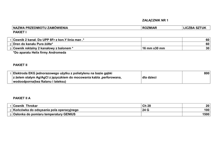 ZAŁĄCZNIK NR 1 NAZWA PRZEDMIOTU ZAMÓWIENIA PAKIET I ROZMIAR 1 Cewnik 2 kanał. Do UPP 8Fr z kon.Y linia man .* 2 Dren do kanału Pura żółte* 3 Cewnik rektalny 2 kanałowy z balonem * 16 mm x30 mm LICZBA SZTUK 60 60 30 *Do aparatu Helix firmy Andromeda PAKIET II 1 Elektroda EKG jednorazowego użytku z polietylenu na bazie gąbki z żelem stałym Ag/AgCl z języczkiem do mocowania kabla ,perforowana, wodoodporna(bez ftalanu i lateksu) 800 dla dzieci PAKIET II A 1 Cewnik Throkar 2 Końcówka do odsysania pola operacyjnego 3 Osłonka do pomiaru temperatury GENIUS Ch 28 24 G 20 100 1500 PAKIET II B 1 Cewnik do podawania tlenu przez nos typu wąsy ,pakowany pojedynczo 2 Cewnik do odsysania Redon 12F/70 3 Maska tlenowa dla dorosłych z drenem(bez ftalanów) 5 Cewnik urologiczny jednorazowy z PCV, sterylny typ NELATON dł. drenu 200-220 cm 5 mm Ch 8,Ch 10 , Ch 14, Ch 16, Ch 18 6 Cewnik urologiczny jednorazowy z PCV, sterylny typ TIEMANN Ch 10, Ch 12 , Ch 14, Ch 20, Ch 22 4 Prowadnica do rurki intubacyjnej 2000 200 800 30 450 250 PAKIET II C 1 2 3 4 5 6 7 8 9 Cewnik urologiczny dwudrożny silikonowany typ FOLEY( wielkość balonu 5-15 ml) Cewnik urologiczny trójdrożny silikonowany typ FOLEY (wielkość balonu 5-15 ml) Kompres żelowy zimno-cieplny Korek sterylny do wkłuć obwodowych i centralnych Maska do znieczuleń bez lateksu Maska tlenowa dla dorosłych z drenem i workiem(bez ftalanów) Worek kolostomijny do wycięcia zamknięty Osłonka do pomiaru temperatury BRAUN Wziernik uszny z tworzywa sztucznego rozmiar Ch 12, Ch 14 ,Ch 16, Ch 18 ,Ch 20 ,Ch24 1500 Ch 20,Ch 22 28 cmx20 cm dług.1,5 cm rozmiar 2 , 4 , 5 dł. drenu 200-220 cm 4 mm 200 15 40 000 500 400 300 20000 400 PAKIET III 1 Drut stomatologiczny miękki 2 Drut stomatologiczny miękki 3 Szyna stomatologiczna Fi 0,4 mm x10 mb Fi 0,5 mm x10 mb 6 i 8 zaczepowa 7 7 30 numer 5 i 6 numer 8 numer 8 i 10 numer 8 i 10 numer 8 60 10 20 20 3 PAKIET IV 1 Rurka intubacyjna do mikrochirurgii krtani z mankietem 2 Rurka tracheotomijna z mankietem , prowadnicą 3 Rurka trach.ocz.+ kaniula wewn.-okienko 4 Rurka trach.ocz.+ kaniula wewn. -bez balonika 5 Rurka trach. z wkładem,prowadnicą,balonik +okienko Filtr oddechowy sterylny, antyb., antywirus.,elektrostatyczny z wydzielonym 6 wymiennikiem ciepła i wilgoci złącza 22M/15F-22F/15M z portem capno o zredukowanej przestrzeni martwej 35 ml 7 Przedłużacz do rur dotchawiczych typu"kominek" 800 22 M/15Fdł.od15 cm 100 numer 5,5 - 7-7,5- 8 numer 9 700 PAKIET IV A 1 Rurka intubacyjna zbrojona z mankietem uszczelniającym z tworz.sztuczn. z oczkiem Murphego z min. 2 oznaczeniami rozmiaru ,ze znaczn.głębokości PAKIET V 1 Igła do nakłuć lędżwiowych z przeżroczystą nasadką 2 Kaniula dotętnicza z zamknieciem typu"Floswitch" 1,2 x 90 18G 20 G 150 240 3 Maska krtaniowa jednorazowego użytku do wentylacji pacjenta z zabezpieczeniem w postaci użebrowania chroniącym przed możliwością wklinowania nagłośni, przeżroczysta 4 Kaniula dożylna z poliuretanu+korek Luer-lock* 5 Kaniula dożylna z poliuretanu+korek Luer-lock* 6 Kaniula dożylna z poliuretanu+korek Luer-lock* rozmiar 4 (50-70 kg) rozmiar 5 (70-100kg) 18 Gx45x1,3mm 20 Gx32x1,1mm 22 Gx25x0,9mm 50 5000 8000 3000 *-minimum 3 paski kontrastujące,filtr hydrofobowy,skrzydełka w kolorze indentyfikującym rozmiar,przeżroczysta komora,zintegrowany korek z wewn.trzpieniem nie wystającym poza jego zewnętrzne ścianki-pochodzący od producenta kaniul ze względu na kompatybilność. PAKIET V A 1 Igła do biopsji prost. uniwersalna 2 Trocar z gwintem Premium 18 G x 20 cm 10/11 mm dł.110 mm 40 5 PAKIET V B 1 Ostrze wymienne ostrokończaste numer 11 6 60 3000 40 3 3400 2 Szczotka do rurek tchawicy 3 Vacutainer probówka niebieska jasna 4 Żel do USG sterylny 5 Prowadnica intubacyjna wygięta jednorazowa 2,7 ml op. 20 g Ch 15 - 60 cm 6 Przedłużacz do pomp strzykawkowych, infuzyjnych z jedną końcówką luer - Lock biały 150 cm PAKIET VI 1 Igła domięśniowa 0,5 x 25 opak.100 szt. 150 op. 2 Łącznik do zestawu dwudrożnego z regulatorem RF500 600 1000 900 3000 3 Przyrząd do chemioterapii dwudrożny sterylny 4 Przyrząd do transferu leków ChemoAidePin EMC3490 5 Przyrząd do transferu leków Cytoluer jałowy,apirogenny do użycia z 6 7 8 9 10 11 12 13 workami Viaflo EMC7405 Przyrząd do żywienia dojelitowego zarówno do worków jak i butelek Flocare Strzykawka trzyczęściowa z tworzywa z końcówką Luer-Lock Strzykawka trzyczęściowa z tworzywa z końcówką Luer-Lock Strzykawka trzyczęściowa z tworzywa z końcówką Luer-Lock Strzykawka trzyczęściowa z tworzywa z końcówką Luer-Lock Worek na mocz sterylny z odpływem i drenem sterylnym Wziernik ginekologiczny sterylny z tworzywa sztucznego Zestaw do drenażu klatki piersiowej trójkomor.10105PX 200 3 ml 5 ml 10 ml 30 ml 2000 ml rozmiar S 800 800 1000 500 1500 150 40 14 Zestaw do punkcji jamy opłucnej Seldinger z igłą,kranikiem i łącznikiem 20 LuerLock,drenem opłucnowym strzykawką bezoporową 15 Zestaw do znieczuleń zewnątrzoponowych-( bez zbrojenia metalowego): igła Touhy 18 G dł.80-90 mm,średn.1,3 mm z nieruchomymi skrzydełkami, cewnik 20G dł.100 cm ,strzykawka niskooporowa 10 ml z końc.Luer 200 PAKIET VII 1 Ostrza dermatomu elektrycznego Zimmera 2 Siatka do dermatomu Zimmera 3 Siatka do dermatomu Zimmera 1,5-1,0 3,0-1,0 60 60 60 PAKIET VIII 1 Igła do znieczuleń podpajęczynówkowych typu 2 3 4 5 6 PENCAN z ostrzem atraumatycznym o trójpł.szlifie Igła do portu zakrzyw./skrzydełko Surecan Igła do portu CYTOCAN Igła do stymulacji z drenem Stimuplex,kabel elektr. I dren inf.wychodzący na końcu uchwytu igły,drenik inf.zintegrowany z uchwytem igły dł.drenika do30cm Kranik trójdrożny Ostrza dermatomu akumulatorowego Aesculap 25 G i 27 G 20 G - 25 mm 22 G x 25 mm 0,7 x 50 mm 220 50 80 30 50 10 7 Ostrza do noża Humbiego 15 cm 29 15 600 150 3000 2000 3000 6 100 ml 20 ml 2 ml 1 ml 50 ml 1500 40000 30000 650 200 8 Przedłużacz do pomp infuzyjnych Omnifi
