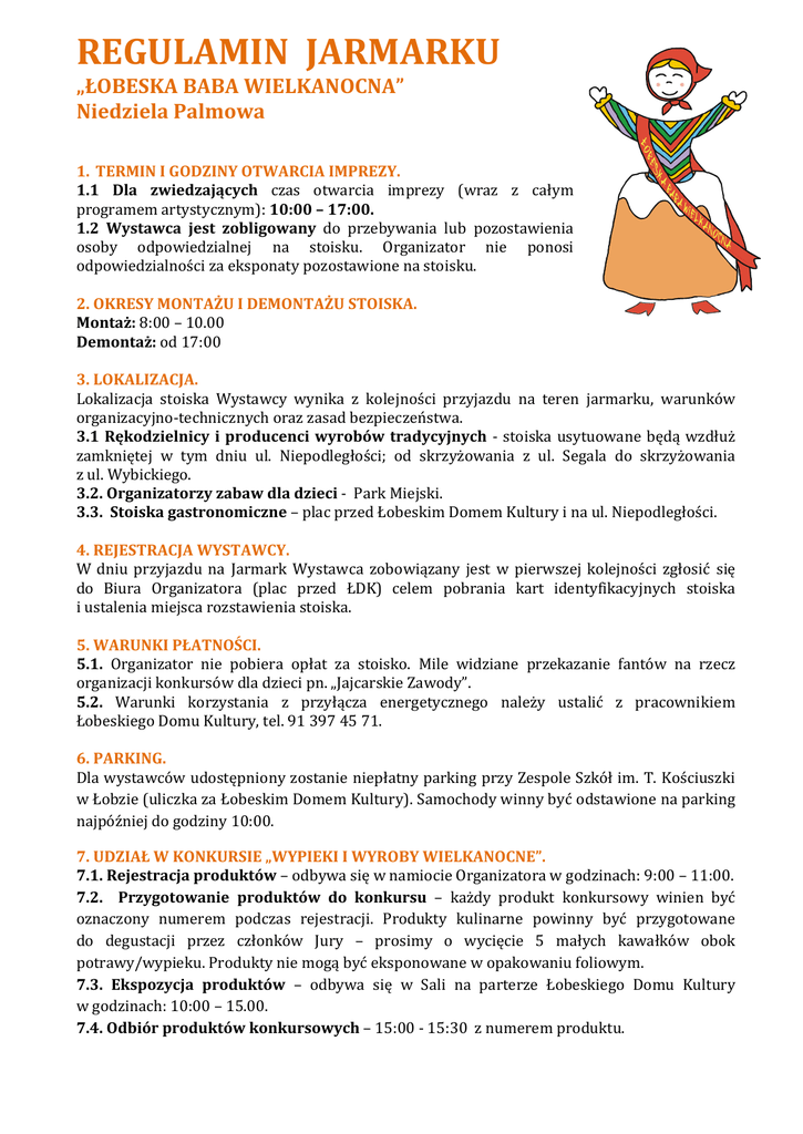 REGULAMIN JARMARKU „ŁOBESKA BABA WIELKANOCNA” Niedziela Palmowa 1. TERMIN I GODZINY OTWARCIA IMPREZY. 1.1 Dla zwiedzających czas otwarcia imprezy (wraz z całym programem artystycznym): 10:00 – 17:00. 1.2 Wystawca jest zobligowany do przebywania lub pozostawienia osoby odpowiedzialnej na stoisku. Organizator nie ponosi odpowiedzialności za eksponaty pozostawione na stoisku. 2. OKRESY MONTAŻU I DEMONTAŻU STOISKA. Montaż: 8:00 – 10.00 Demontaż: od 17:00 3. LOKALIZACJA. Lokalizacja stoiska Wystawcy wynika z kolejności przyjazdu na teren jarmarku, warunków organizacyjno-technicznych oraz zasad bezpieczeństwa. 3.1 Rękodzielnicy i producenci wyrobów tradycyjnych - stoiska usytuowane będą wzdłuż zamkniętej w tym dniu ul. Niepodległości; od skrzyżowania z ul. Segala do skrzyżowania z ul. Wybickiego. 3.2. Organizatorzy zabaw dla dzieci - Park Miejski. 3.3. Stoiska gastronomiczne – plac przed Łobeskim Domem Kultury i na ul. Niepodległości. 4. REJESTRACJA WYSTAWCY. W dniu przyjazdu na Jarmark Wystawca zobowiązany jest w pierwszej kolejności zgłosić się do Biura Organizatora (plac przed ŁDK) celem pobrania kart identyfikacyjnych stoiska i ustalenia miejsca rozstawienia stoiska. 5. WARUNKI PŁATNOŚCI. 5.1. Organizator nie pobiera opłat za stoisko. Mile widziane przekazanie fantów na rzecz organizacji konkursów dla dzieci pn. „Jajcarskie Zawody”. 5.2. Warunki korzystania z przyłącza energetycznego należy ustalić z pracownikiem Łobeskiego Domu Kultury, tel. 91 397 45 71. 6. PARKING. Dla wystawców udostępniony zostanie niepłatny parking przy Zespole Szkół im. T. Kościuszki w Łobzie (uliczka za Łobeskim Domem Kultury). Samochody winny być odstawione na parking najpóźniej do godziny 10:00. 7. UDZIAŁ W KONKURSIE „WYPIEKI I WYROBY WIELKANOCNE”. 7.1. Rejestracja produktów – odbywa się w namiocie Organizatora w godzinach: 9:00 – 11:00. 7.2. Przygotowanie produktów do konkursu – każdy produkt konkursowy winien być oznaczony numerem podczas rejestracji. Produkty kulinarne powinny być przygotowane do degustacji przez członków Jury – prosimy o wycięcie 5 małych kawałków obok potrawy/wypieku. Produkty nie mogą być eksponowane w opakowaniu foliowym. 7.3. Ekspozycja produktów – odbywa się w Sali na parterze Łobeskiego Domu Kultury w godzinach: 10:00 – 15.00. 7.4. Odbiór produktów konkursowych – 15:00 - 15:30 z numerem produktu.