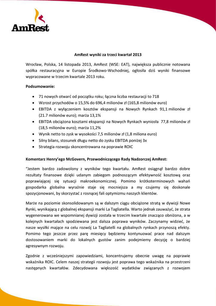 AmRest wyniki za trzeci kwartał 2013 Wrocław, Polska, 14 listopada 2013, AmRest (WSE: EAT), największa publicznie notowana spółka restauracyjna w Europie Środkowo-Wschodniej, ogłosiła dziś wyniki finansowe wypracowane w trzecim kwartale 2013 roku. Podsumowanie: 71 nowych otwarć od początku roku; łączna liczba restauracji to 718 Wzrost przychodów o 15,5% do 696,4 milionów zł (165,8 milionów euro) EBITDA z wyłączeniem kosztów ekspansji na Nowych Rynkach 91,1 milionów zł (21.7 milionów euro); marża 13,1% EBITDA obciążona kosztami ekspansji na Nowych Rynkach wyniosła 77,8 milionów zł (18,5 milionów euro); marża 11,2% Wynik netto to zysk w wysokości 7,5 milionów zł (1,8 miliona euro) Silny bilans, stosunek długu netto do zysku EBITDA poniżej 3x Strategia rozwoju skoncentrowana na poprawie ROIC Komentarz Henry’ego McGovern, Przewodniczącego Rady Nadzorczej AmRest: “Jestem bardzo zadowolony z wyników tego kwartału. AmRest osiągnął bardzo dobre rezultaty finansowe dzięki udanym zabiegom podnoszącym efektywność kosztową oraz poprawiającej się sytuacji makroekonomicznej. Pomimo krótkoterminowych wahań gospodarka globalna wyraźnie staje się mocniejsza a my czujemy się doskonale spozycjonowani, by skorzystać z rosnącej fali optymizmu naszych klientów. Marże na poziomie skonsolidowanym są w dalszym ciągu obciążone stratą w dywizji Nowe Rynki, wynikającą z globalnej ekspansji marki La Tagliatella. Warto jednak zauważyć, że strata wygenerowana we wspomnianej dywizji została w trzecim kwartale znacząco obniżona, a w kolejnych kwartałach spodziewana jest dalsza poprawa wyników. Zaczynamy widzieć, że nasze wysiłki mające na celu rozwój La Tagliatelli na globalnych rynkach przynoszą efekty. Pomimo tego jeszcze przez parę miesięcy będziemy kontynuować prace nad dalszym dostosowaniem marki do lokalnych gustów zanim podejmiemy decyzję o bardziej agresywnym rozwoju. Zgodnie z wcześniejszymi zapowiedziami, koncentrujemy obecnie uwagę na poprawie wskaźnika ROIC. Celem naszej strategii rozwoju jest poprawa tego wskaźnika na przestrzeni następnych kwartałów. Zdecydowana większość wydatków związanych z rozwojem przeznaczona będzie na projekty poprawiające wartość ROIC, środki przeznaczone na inwestycję w koncepty niesprawdzone zostaną ograniczone.” Outlook Zarząd AmRest jest optymistyczny co do przyszłości, z uwagi na pojawiające się sygnały poprawy sytuacji makroekonomicznej. W roku 2013 otwarte zostanie około 100 restauracji. Roczne nakłady inwestycyjne wyniosą w przybliżeniu 400 mln zł. Informacje uzupełniające Pełen raport za trzeci kwartał 2013 znajduje się na stronie www.amrest.eu Telekonferencja inwestorska odbędzie się 15 listopada 2013 o godzinie 14:30. W celu uczestnictwa w konferencji i innych pytań proszę o kontakt: Dorota Surowiec IR Specialist +48 71 386 1235 [email protected]