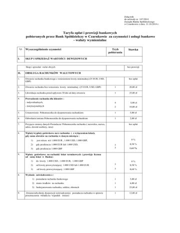 Załącznik do uchwały nr 147/2014 Zarządu Banku Spółdzielczego w Czarnkowie z dnia 31.10.2014 r. Taryfa opłat i prowizji bankowych pobieranych przez Bank Spółdzielczy w Czarnkowie za czynności i usługi bankowe - waluty wymienialne Lp. I. Wyszczególnienie czynności Tryb pobierania Stawka SKUP I SPRZEDAŻ WARTOŚCI DEWIZOWYCH Skup i sprzedaż walut obcych bez prowizji II. OBSŁUGA RACHUNKÓW WALUTOWYCH 1. Otwarcie rachunku bankowego z wniesieniem kwoty minimalnej (25 EUR, USD, GBP) 2. Otwarcie rachunku bez wniesienia kwoty minimalnej (25 EUR, USD, GBP) 1 20,00 zł 3. Likwidacja rachunku przed upływem 30 dni od daty otwarcia 1 25,00 zł 4. Prowadzenie rachunku dla klientów : - indywidualnych, 4 5,00 zł - instytucjonalnych 2 10,00 zł 5. Ustanowienie Pełnomocnika do dysponowania rachunkiem 1 5,00 zł 6. Odwołanie/zmiana Pełnomocnika do dysponowania rachunkiem 1 2,00 zł 7. Przyjęcie zmiany danych Posiadacza/ Pełnomocnika rachunku ( nazwisko, nazwa, adres, dowód osobisty, inne) 8. Wpłaty/wypłaty gotówkowe na/z rachunku ( z wyłączeniem lokat), gdy suma obrotów na rachunku w danym miesiącu : 1) jest niższa niż 1.000 EUR , 1.000 USD, 1.000 GBP, 2) gdy przekracza 1.000 EUR lub 1.000 USD, 3) 9. 8. 9. gdy przekracza 1.000 GBP bez opłat bez opłat 0% 0,50 % 3 3 0,60 % Wpłaty gotówkowe na rachunki lokat terminowych ( prowizja liczona od sumy lokat w Banku): 1) do kwoty 1.000 USD , 1.000 EUR, 1.000 GBP 2) od kwoty przewyższającej 1.000 USD lub 1.000 EUR 3 0,50 % 3) od kwoty przewyższającej 1.000 GBP 3 0,60 % 1) posiadaniu rachunku bankowego 1 5,00 zł 2) stanie środków na rachunku 1 6,00 zł 3) funkcjonowaniu rachunku, saldzie, obrotach 1 25,00 zł 1 12,00 zł 0% Wydanie zaświadczenia o : Zmiana/odwołanie dyspozycji (oświadczenia) posiadacza rachunku w sprawie przeznaczenia wkładu na wypadek śmierci 10. Wyciągi bankowe: : 1) sporządzenie wyciągu bankowego w formie papierowej i wydanie w placówce prowadzącej rachunek , 2) wysłanie wyciągu bankowego raz w miesiącu, 3) wysłanie wyciągu bankowego częściej niż 1 raz w miesiącu ( za każde wysłanie) 4) sporządzenie kopii : a) wyciągu bankowego ( bez załączników) oraz historii rachunku: - z bieżącego roku kalendarzowego - z lat poprzednich b) bez opłat bez opłat 1 1 1 pojedynczej dyspozycji złożonej przez klienta( załącznika), gdy: - Klient określi datę dokonania operacji, - Klient nie określi daty operacji 11. Wydanie na wniosek klienta historii rachunku III. SERWIS SMS 1. 5,00 zł 5,00 zł 5,00 zł + po 2,00 zł za każdy rok poprzedni 10,00 zł 15,00 zł 1 10,00 zł Abonament miesięczny ( w cenie abonamentu 10 SMS-ów darmowych) 2 3,50 zł 2. Opłata za każdy kolejny SMS 2 0,30 zł 3. Zmiana numeru telefonu komórkowego, na który mają być przesyłane informacje 1 1,00 zł 4. Dodanie kolejnego numeru telefonu, na który mają być przesyłane informacje 1 1,00 zł IV. POZOSTAŁE OPŁATY 1. Wystawienie zaświadczenia uprawniającego do wywozu wartości dewizowych za granicę 1 20,00 zł 2. Dostęp do informacji o stanie środków na rachunku za pośrednictwem Teleserwisu bez opłat Uwaga! 1- W przypadku wyliczania prowizji i opłat metodą procentową należy do przeliczenia równowartości PLN stosować kursy średnie NBP z dnia rozliczania transakcji. 2- W indywidualnych przypadkach dopuszcza się możliwość stosowania innych opłat i prowizji niż przewidziane w taryfie, ustalonych w umowie z klientem. 3- Bank nie pobiera prowizji za prowadzenie rachunków od samorządów terytorialnych i organizacji charytatywnych. 4- Opłatę za prowadzenie rachunku pobiera się od miesiąca, w którym nastąpił wpływ środków na rachunek. LEGENDA: 1- opłata pobierana jednorazowo w momencie wykonywania czynności 2- opłata pobierana ostatniego dnia każdego miesiąca za miesiąc bieżący 3- opłata pobierana ostatniego dnia roboczego każdego miesiąca za miesiąc bieżący 4- opłata pobierana miesięcznie z góry, do 10-go każdego miesiąca\