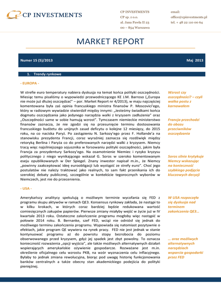 CP INVESTMENTS email: CP sp. z o.o. [email protected] al. Jana Pawła II 23 tel. + 48 22 110 00 64 00 – 854 Warszawa MARKET REPORT Numer 15 (5)/2013 Maj 2013 1. Trendy rynkowe - EUROPA W strefie euro temperatury nabiera dyskusja na temat końca polityki oszczędności. Miesiąc temu pisaliśmy o wypowiedzi przewodniczącego KE J.M. Barroso („Europa nie może już dłużej oszczędzać” – por. Market Report nr 4/2013), w maju najczęściej komentowana była zaś opinia francuskiego ministra finansów P. Moscovici’ego, który w radiowym wywiadzie stwierdził między innymi: „Jesteśmy świadkami końca dogmatu oszczędzania jako jedynego narzędzia walki z kryzysem zadłużenia” oraz „Oszczędności same w sobie hamują wzrost”. Tymczasem niemieckie ministerstwo finansów zaznacza, że nie zgodzi się na przesunięcie terminu dostosowania francuskiego budżetu do unijnych zasad deficytu o kolejne 12 miesięcy, do 2015 roku, na co naciska Paryż. Po zastąpieniu N. Sarkozy’ego przez F. Hollande’a na stanowisku prezydenta Francji, coraz wyraźniej zaznacza się rozdźwięk między retoryką Berlina i Paryża co do preferowanych narzędzi walki z kryzysem. Niemcy tracą więc najsilniejszego sojusznika w forsowaniu polityki oszczędności, jakim była Francja za prezydentury Sarkozy’ego. Na osamotnienie Niemiec i ryzyko kryzysu politycznego z niego wynikającego wskazał G. Soros w szeroko komentowanym eseju opublikowanych w Der Spiegel. Znany inwestor napisał m.in., że Niemcy „powinny zaakceptować ideę euroobligacji lub wystąpić ze strefy euro”. Choć jego postulatów nie należy traktować jako realnych, to sam fakt przenikania ich do szerokiej debaty publicznej, szczególnie w kontekście tegorocznych wyborów w Niemczech, jest nie do przecenienia. Wzrost czy oszczędności? – czyli walka postu z karnawałem Francja przechodzi do obozu przeciwników oszczędzania Soros silnie krytykuje Niemcy wskazując na konieczność szybkiego podjęcia kluczowych decyzji - USA Amerykańscy analitycy spekulują o możliwym terminie wycofania się FED z programu skupu aktywów w ramach QE3. Konsensus rynkowy zakłada, że nastąpi to w kilku krokach, w których coraz bardziej będzie redukowana wartość comiesięcznych zakupów papierów. Pierwsze zmiany miałyby wejść w życie już w IV kwartale 2013 roku. Ostateczne zakończenie programu mogłoby więc nastąpić w połowie 2014 roku. B. Bernanke, szef FED, wciąż nie odniósł się jednak do możliwego terminu zakończenia programu. Wypowiada się natomiast pozytywnie o efektach, jakie program QE wywiera na rynek pracy. FED nie jest jednak w stanie kontynuować programu aż do powrotu stopy bezrobocia do poziomu obserwowanego przed kryzysem, gdyż jej spadek jest zbyt powolny. To oznacza konieczność rozważenia „opcji wyjścia”, ale także możliwych alternatywnych działań wspierających amerykańskie ożywienie gospodarcze. Rozważane jest m.in. określenie oficjalnego celu wzrostu PKB, na wzór wyznaczenia celu inflacyjnego. Byłaby to jednak zmiana rewolucyjna, biorąc pod uwagę historię funkcjonowania banków centralnych a także obecny stan akademickiego podejścia do polityki pieniężnej. W USA rozpoczęła się dyskusja nad terminem zakończenia QE3… … oraz możliwych alternatywnych narzędziach wsparcia gospodarki przez FED CP INVESTMENTS email: CP sp. z o.o. [email protected] al. Jana Pawła II 23 tel. + 48 22 110 00 64 00 – 854 Warszawa Stopa bezrobocia w USA wciąż znajduje się na poziomie zdecydowanie wyższym niż przed kryzysem Stopa bezrobocia w Stanach Zjednoczonych w latach 2006-2013. Wykres: tradingeconomics.com - CHINY Chińskie władze zapowiedziały, że pozytywnie odnoszą się do, rekomendowanego od kilku miesięcy w raportach rządowych agencji, wprowadzenia podatku od surowcochłonnych przedsiębiorstw w ramach EPTS (Environmental Protection Taxation System). Walka z emisją zanieczyszczeń do atmosfery oznacza schłodzenie wzrostu gospodarczego w Chinach, co w połączeniu z trwającym wciąż programem kontroli cen w branży mieszkaniowej, a także słabymi danymi makroekonomicznymi napływającymi z Państwa Środka, skłania analityków do redukcji założeń wzrostu gospodarczego w Chinach w najbliższych kwartałach. EPT w Chinach zwiastunem silniejszego chłodzenia gospodarki Państwa Środka - POLSKA Polskie dane makroekonomiczne wciąż pokazują, że dołek koniunktury dopiero przed nami. W kwietniu wielomiesięczne minimum zanotował wskaźnik PMI dla przemysłu (tylko 46,9 pkt). Produkcja przemysłowa wzrosła zaledwie o 2,7% r/r (przy wyższej liczbie dni roboczych w kwietniu 2013 roku), a sprzedaż detaliczna spadła o 0,2% r/r. Wzrost PKB w I kwartale 2013 wyniósł zaledwie 0,5%. Pozytywnie zaskoczyły analityków tylko dane dotyczące przeciętnego wynagrodzenia, które wzrosło o 3% r/r wobec mediany oczekiwań na poziome 2,2%. Przy wciąż spadającej inflacji CPI, oznacza to już trzeci z rzędu miesiąc wzrostu realnych wynagrodzeń r/r. Może to pomóc odbudować popyt generowany przez gospodarstwa domowe. Z drugiej strony słabnąca inflacja może zachęcać do odkładania zakupów w czasie. 8,0% 6,0% 4,0% 2,0% 0,0% -2,0% -4,0% -6,0% Wynagrodzenia Inflacja CPI Wynagrodzenia realne Inflacja CPI, wynagrodzenia nominalne i wynagrodzenia realne w polskiej gospodarce w ujęciu rok do roku. Wykres: opracowanie własne. Dane: GUS. Wciąż słabe dane makro w Polsce… … z wyjątkiem wzrostu płac realnych… … trzeci miesiąc z rzędu CP INVESTMENTS email: CP sp. z o.o. [email protected] al. Jana Pawła II 23 tel. + 48 22 110 00 64 00 – 854 Warszawa Słabnąca inflacja, która znajduje się obecnie istotnie poniżej dolnej granicy przedziału wahań dla celu inflacyjnego NBP, skłoniła Radę Polityki Pieniężnej do ponownego cięcia referencyjnej stopy bazowej o 25 p. b. do 3%. Decyzja taka zaskoczyła część analityków. Komunikat po majowym 
