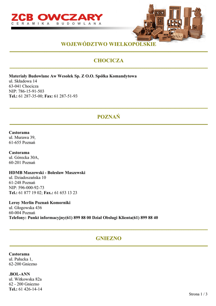 WOJEWÓDZTWO WIELKOPOLSKIE ___________________________________________________________________________________________ CHOCICZA ___________________________________________________________________________________________ Materiały Budowlane Aw Wesołek Sp. Z O.O. Spółka Komandytowa ul. Składowa 14 63-041 Chocicza NIP: 786-15-91-503 Tel.: 61 287-35-00; Fax: 61 287-51-93 ___________________________________________________________________________________________ POZNAŃ ___________________________________________________________________________________________ Castorama ul. Murawa 39, 61-655 Poznań Castorama ul. Górecka 30A, 60-201 Poznań HDMB Maszewski - Bolesław Maszewski ul. Dziadoszańska 10 61-248 Poznań NIP: 596-000-92-73 Tel.: 61 877 19 02; Fax.: 61 653 13 23 Leroy Merlin Poznań Komorniki ul. Głogowska 436 60-004 Poznań Telefony: Punkt informacyjny(61) 899 88 00 Dział Obsługi Klienta(61) 899 88 40 ___________________________________________________________________________________________ GNIEZNO ___________________________________________________________________________________________ Castorama ul. Pałucka 1, 62-200 Gniezno .BOL-ANN ul. Witkowska 82a 62 - 200 Gniezno Tel.: 61 426-14-14 Strona 1 / 3 ___________________________________________________________________________________________ JAROCIN ___________________________________________________________________________________________ "ROLMEX" Spółka Jawna Magdalena Gościniak Rafał Gosciniak Cielcza, ul. Sienkiewicza 53a; 63-200 Jarocin Tel.: 62 749 37 23 ___________________________________________________________________________________________ KALISZ ___________________________________________________________________________________________ Castorama ul. Tylna 17-23, 62-800 Kalisz Leroy Merlin Kalisz ul. Poznańska 121-131 62-800 Kalisz Telefony: Punkt informacyjny(62) 760 88 00 Dział Obsługi Klienta(62) 760 88 19 Donbud S.C. Piotr Marciniak ul. Chocimska 4 A 62-800 Kalisz Kom.: 618-200-94-28 Tel.: 62 503 31 15 ___________________________________________________________________________________________ SUCHY LAS ___________________________________________________________________________________________ Leroy Merlin Poznań Suchy Las ul. Złotnicka 1, Złotniki 62-002 Suchy Las Telefony: Punkt informacyjny(61) 820 98 00 Dział Obsługi Klienta(61) 820 98 40 ___________________________________________________________________________________________ STARE MIASTO ___________________________________________________________________________________________ Castorama ul. Ogrodowa 31, 62-571 Stare Miasto k/Konina Strona 2 / 3 ___________________________________________________________________________________________ SWARZĘDZ ___________________________________________________________________________________________ Castorama ul. Sienkiewicza 23, 62-020 Swarzędz Leroy Merlin Poznań Swarzędz ul. Poznańska 4a 62-020 Swarzędz Telefony: Punkt informacyjny(61) 897 58 00 Dział Obsługi Klienta(61) 897 58 40 ___________________________________________________________________________________________ TARNOWO PODGÓRNE ___________________________________________________________________________________________ Leroy Merlin Poznań Swadzim ul. Św. Antoniego 6 62-080 Tarnowo Podgórne Telefony: Punkt informacyjny(61) 896 18 00 Dział Obsługi Klienta(61) 896 18 40 Strona 3 / 3