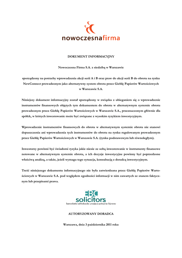 DOKUMENT INFORMACYJNY Nowoczesna Firma S.A. z siedzibą w Warszawie sporządzony na potrzeby wprowadzenia akcji serii A i B oraz praw do akcji serii B do obrotu na rynku NewConnect prowadzonym jako alternatywny system obrotu przez Giełdę Papierów Wartościowych w Warszawie S.A. Niniejszy dokument informacyjny został sporządzony w związku z ubieganiem się o wprowadzenie instrumentów finansowych objętych tym dokumentem do obrotu w alternatywnym systemie obrotu prowadzonym przez Giełdę Papierów Wartościowych w Warszawie S.A., przeznaczonym głównie dla spółek, w których inwestowanie może być związane z wysokim ryzykiem inwestycyjnym. Wprowadzenie instrumentów finansowych do obrotu w alternatywnym systemie obrotu nie stanowi dopuszczenia ani wprowadzenia tych instrumentów do obrotu na rynku regulowanym prowadzonym przez Giełdę Papierów Wartościowych w Warszawie S.A. (rynku podstawowym lub równoległym). Inwestorzy powinni być świadomi ryzyka jakie niesie ze sobą inwestowanie w instrumenty finansowe notowane w alternatywnym systemie obrotu, a ich decyzje inwestycyjne powinny być poprzedzone właściwą analizą, a także, jeżeli wymaga tego sytuacja, konsultacją z doradcą inwestycyjnym. Treść niniejszego dokumentu informacyjnego nie była zatwierdzana przez Giełdę Papierów Wartościowych w Warszawie S.A. pod względem zgodności informacji w nim zawartych ze stanem faktycznym lub przepisami prawa. AUTORYZOWANY DORADCA Warszawa, dnia 3 października 2011 roku Dokument Informacyjny Nowoczesna Firma S.A. strona 2 z 190 Wstęp Dokument informacyjny Emitent Nowoczesna Firma S.A. z siedzibą w Warszawie ul. Wiertnicza 141 02-952 Warszawa tel.: + 48 22 314 14 00 fax: + 48 22 314 14 10 internet: www.nf.pl e-mail: [email protected] Autoryzowany Doradca EBC Solicitors Arkadiusz Stryja sp.k. z siedzibą w Warszawie ul. Grzybowska 4 lok. U9B 00-131 Warszawa tel.: + 48 22 419 20 70 faks: + 48 22 419 20 69 internet: www.ebcsolicitors.pl e-mail: [email protected] Informacje na temat instrumentów finansowych wprowadzanych do obrotu w Alternatywnym systemie obrotu Na podstawie niniejszego dokumentu informacyjnego do obrotu w Alternatywnym systemie obrotu wprowadzane są: 11 100 000 (jedenaście milionów sto tysięcy) akcji na okaziciela serii A o wartości nominalnej 10 gr (dziesięć groszy) każda, 1 667 308 (jeden milion sześćset sześćdziesiąt siedem tysięcy trzysta osiem) akcji na okaziciela serii B o wartości nominalnej 10 gr (dziesięć groszy) każda; 1 667 308 (jeden milion sześćset sześćdziesiąt siedem tysięcy trzysta osiem) praw do akcji na okaziciela serii B o wartości nominalnej 10 gr (dziesięć groszy) każda. Na podstawie niniejszego dokumentu informacyjnego do obrotu w Alternatywnym systemie obrotu wprowadzane są akcje reprezentujące 100 proc. kapitału zakładowego Emitenta. Struktura kapitału zakładowego Emitenta, z uwzględnieniem niezarejestrowanych na dzień sporządzania niniejszego dokumentu informacyjnego Akcji Serii B, przedstawia się następująco: medium wiedzy dla biznesu www.nf.pl Dokument Informacyjny Nowoczesna Firma S.A. strona 3 z 190 Tabela 1. Struktura kapitału zakładowego Emitenta L.p. Seria akcji Liczba akcji Udział w kapitale za- Udział w głosach (w (w szt.) kładowym (w proc.) proc.) 1. A 11 100 000 86,94 86,94 2. B 1 667 308 13,06 13,06 12 767 308 100 100 Razem Źródło: opracowanie własne Emitenta medium wiedzy dla biznesu www.nf.pl Dokument Informacyjny Nowoczesna Firma S.A. strona 4 z 190 Spis Treści Wstęp ............................................................................................................................................................................... 2 Spis Treści ....................................................................................................................................................................... 4 1. Czynniki ryzyka ..................................................................................................................................................... 7 1.1. Czynniki ryzyka związane z otoczeniem, w jakim Emitent prowadzi działalność ..................................... 7 1.2. Czynniki ryzyka związane z działalnością Emitenta ........................................................................................ 8 1.3. Czynniki ryzyka związane z rynkiem kapitałowym ....................................................................................... 10 2. Osoby odpowiedzialne za informacje zawarte w dokumencie informacyjnym....................................... 15 2.1. Emitent ................................................................................................................................................................. 15 2.2. Autoryzowany Doradca ..................................................................................................................................... 15 3. Dane o instrumentach finansowych wprowadzanych do alternatywnego systemu obrotu................... 16 3.1. Informacje o wprowadzanych do obrotu instrumentach finansowych ..................................................... 16 3.2. Podstawa prawna emisji instrumentów finansowych.................................................................................... 30 3.3. Oznaczenie dat, od których Akcje uczestniczą w dywidendzie .................................................................. 34 3.4. Prawa wynikające z instrumentów finansowych ............................................................................................ 34 3.4.1. Prawa o charakterze majątkowym.................................................................................................................. 34 3.4.2. Prawa o charakterze korporacyjnym ............................................................................................................. 35 3.5. Określenie podstawowych zasad polityki Emitenta co do wypłaty