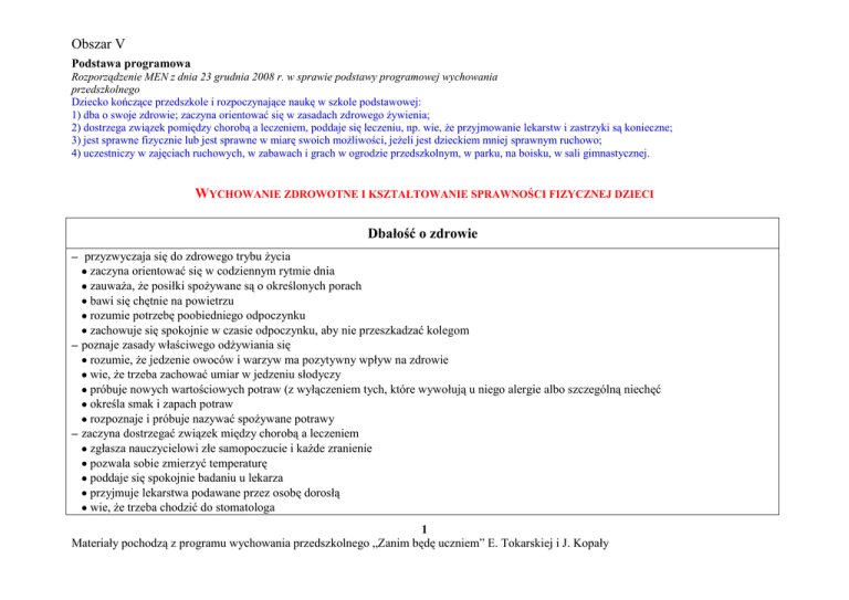 Obszar V Podstawa programowa Rozporządzenie MEN z dnia 23 grudnia 2008 r. w sprawie podstawy programowej wychowania przedszkolnego Dziecko kończące przedszkole i rozpoczynające naukę w szkole podstawowej: 1) dba o swoje zdrowie; zaczyna orientować się w zasadach zdrowego żywienia; 2) dostrzega związek pomiędzy chorobą a leczeniem, poddaje się leczeniu, np. wie, że przyjmowanie lekarstw i zastrzyki są konieczne; 3) jest sprawne fizycznie lub jest sprawne w miarę swoich możliwości, jeżeli jest dzieckiem mniej sprawnym ruchowo; 4) uczestniczy w zajęciach ruchowych, w zabawach i grach w ogrodzie przedszkolnym, w parku, na boisku, w sali gimnastycznej. WYCHOWANIE ZDROWOTNE I KSZTAŁTOWANIE SPRAWNOŚCI FIZYCZNEJ DZIECI Dbałość o zdrowie przyzwyczaja się do zdrowego trybu życia zaczyna orientować się w codziennym rytmie dnia zauważa, że posiłki spożywane są o określonych porach bawi się chętnie na powietrzu rozumie potrzebę poobiedniego odpoczynku zachowuje się spokojnie w czasie odpoczynku, aby nie przeszkadzać kolegom poznaje zasady właściwego odżywiania się rozumie, że jedzenie owoców i warzyw ma pozytywny wpływ na zdrowie wie, że trzeba zachować umiar w jedzeniu słodyczy próbuje nowych wartościowych potraw (z wyłączeniem tych, które wywołują u niego alergie albo szczególną niechęć określa smak i zapach potraw rozpoznaje i próbuje nazywać spożywane potrawy zaczyna dostrzegać związek między chorobą a leczeniem zgłasza nauczycielowi złe samopoczucie i każde zranienie pozwala sobie zmierzyć temperaturę poddaje się spokojnie badaniu u lekarza przyjmuje lekarstwa podawane przez osobę dorosłą wie, że trzeba chodzić do stomatologa 1 Materiały pochodzą z programu wychowania przedszkolnego „Zanim będę uczniem” E. Tokarskiej i J. Kopały Obszar V Rozwijanie sprawności ruchowej Etap I podejmuje spontanicznie zabawy ruchowe porusza się prawidłowo, zachowując równowagę w czasie chodzenia, biegania, podskakiwania w różnym terenie – w sali, ogrodzie, parku przyjmuje prawidłową pozycję w siadzie płaskim, w przysiadzie, ze skrzyżowanymi nogami, na krzesełku korzysta z urządzeń i sprzętów przeznaczonych dla najmłodszych dzieci podczas zabaw na powietrzu jeździ na zabawkach na kółkach, odpychając się nogami porusza się na trzykołowym rowerku próbuje jeździć na hulajnodze wchodzi po kilku stopniach na pochyłe drabinki, np. na zjeżdżalnię naśladuje sposób poruszania się wybranych zwierząt, np. psa, kota, ptaka chodzi swobodnie po zwężonym torze prostym, pokonuje niskie przeszkody, przechodzi z asekuracją po podwyższeniu, np. po ławeczce gimnastycznej biega swobodnie do przodu, po obwodzie koła, w wyznaczonym kierunku, do określonego celu i zatrzymuje się na sygnał porusza się na czworakach, wspierając się na całych dłoniach i palcach stóp przechodzi pod przeszkodami, np. pod poprzeczką przechodzi przez płaskie przeszkody, np. złożoną szarfę lub rozłożoną skakankę podrzuca i chwyta przybory rzuca woreczki, baloniki, piłki różnej wielkości do góry i w różnych kierunkach, oburącz i jedną ręką próbuje rzucać do wyznaczonego celu stara się chwytać piłkę oburącz podskakuje w dowolny sposób porusza się podskokami do przodu próbuje wskakiwać obunóż np. do obręczy uczestniczy w zabawach ruchowych organizowanych przez nauczyciela korzysta w ustalony sposób z przyborów gimnastycznych, np. woreczków, piłek, krążków reaguje na sygnał wzrokowy, słuchowy, gest 2 Materiały pochodzą z programu wychowania przedszkolnego „Zanim będę uczniem” E. Tokarskiej i J. Kopały Obszar V Sposoby realizacji: improwizacja ruchowa Rudolfa Labana – rozwija inwencję twórczą, kształtuje świadomość własnego ciała, poczucie ciężaru, czasu i przestrzeni, uczy adaptacji ruchów własnych do ruchów partnera lub grupy; zabawy ruchowe prowadzone według metody „Pracy szkolnej” Karola Orffa – rozwijają sprawność ruchową w powiązaniu z muzyką i słowem oraz ekspresję twórczą; zabawy ruchowe prowadzone metodą „Ruchu Rozwijającego” Weroniki Sherborne – pozwalają na poznanie przestrzeni swojego ciała, uczą koncentracji oraz kontroli zachowania, doskonalą płynność ruchów, rozwijają poczucie siły, delikatność i wrażliwość; zabawy ruchowe uwzględniające różne formy ruchu (należy pamiętać o tym, aby w jednym dniu nie powtarzały się zabawy z dominacją tej samej formy ruchu): o orientacyjno-porządkowe – kształtują umiejętność poruszania się w grupie, ćwiczą orientację, szybkość reakcji, spostrzegawczość, wdrażają do przestrzegania określonych zasad, o bieżne – rozwijają koordynację ruchów, wytrwałość, pobudzają pracę serca i zwiększają pojemność płuc, o z elementem czworakowania – wzmacniają mięśnie ramion i brzucha, odciążają prace mięśni grzbietu i nóg, o z elementem równowagi – rozwijają koordynację ruchową, o z elementem skoku i podskoku – ćwiczą duże grupy mięśniowe, pobudzają pracę serca i płuc, przyśpieszają krążenie krwi i przemianę materii, o z elementem rzutu, celowania, toczenia – rozwijają koordynację wzrokowo-ruchową i zręczność, o z elementem wspinania i wstępowania na przyrządy – wpływają na wzmocnienie mięśni tułowia i ramion, wyrabiają w dzieciach odwagę; ćwiczenia poranne i gimnastyczne – należy prowadzić, uwzględniając podstawowe zasady: dostosowanie zadań do możliwości dzieci, przechodzenie od ćwiczeń łatwiejszych do wymagających większego wysiłku, rozpoczynanie ćwiczeń od dużych grup mięśniowych, po intensywnych czynnościach prowadzenie zabaw o małym natężeniu ruchu; zawody i gry sportowe na powietrzu – mobilizują do podejmowania wysiłku, uczą współzawodnictwa, rozwijają ambicję i wytrwałość; zabawy na śniegu i lodzie oraz w wodzie – hartują organizm, ćwiczą orientację