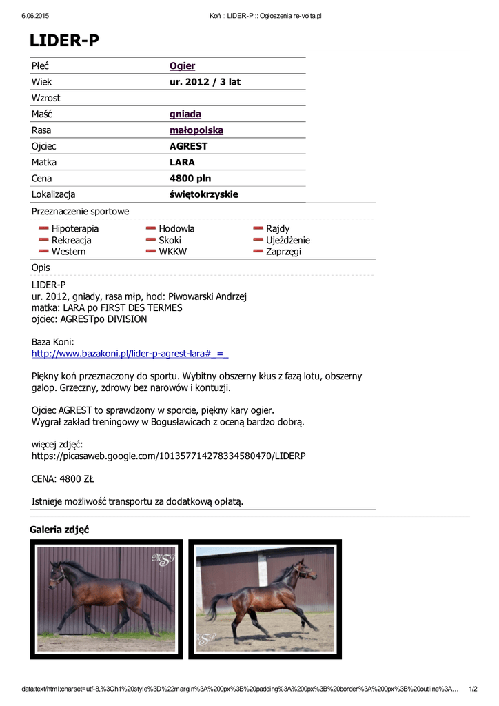 6.06.2015 Koń :: LIDERP :: Ogłoszenia revolta.pl LIDERP Płeć Ogier Wiek ur. 2012 / 3 lat Wzrost Maść gniada Rasa małopolska Ojciec AGREST Matka LARA Cena 4800 pln Lokalizacja świętokrzyskie Przeznaczenie sportowe Hipoterapia Rekreacja Western Hodowla Skoki WKKW Rajdy Ujeżdżenie Zaprzęgi Opis LIDERP ur. 2012, gniady, rasa młp, hod: Piwowarski Andrzej matka: LARA po FIRST DES TERMES ojciec: AGRESTpo DIVISION Baza Koni: http://www.bazakoni.pl/liderpagrestlara#_=_ Piękny koń przeznaczony do sportu. Wybitny obszerny kłus z fazą lotu, obszerny galop. Grzeczny, zdrowy bez narowów i kontuzji. Ojciec AGREST to sprawdzony w sporcie, piękny kary ogier. Wygrał zakład treningowy w Bogusławicach z oceną bardzo dobrą. więcej zdjęć: https://picasaweb.google.com/101357714278334580470/LIDERP CENA: 4800 ZŁ Istnieje możliwość transportu za dodatkową opłatą. Galeria zdjęć data:text/html;charset=utf8,%3Ch1%20style%3D%22margin%3A%200px%3B%20padding%3A%200px%3B%20border%3A%200px%3B%20outline%3A… 1/2 6.06.2015 Koń :: LIDERP :: Ogłoszenia revolta.pl data:text/html;charset=utf8,%3Ch1%20style%3D%22margin%3A%200px%3B%20padding%3A%200px%3B%20border%3A%200px%3B%20outline%3A… 2/2
