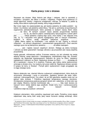 Karta pracy: Liść z drzewa Nazywam się drzewo. Moja historia jest długa i ciekawa. Jest to opowieść o szczęściu i przyjaźni, ale takŜe o smutku i niepokoju. Pragnę teraz powierzyć Ci swoje tajemnice, skarby i magiczne umiejętności, wierząc, Ŝe właśnie Ty jesteś tą osobą, która dobrze wykorzysta wiedzę, którą mogę przekazać. Być moŜe nigdy nie zastanawiałeś się, jak bardzo jesteśmy do siebie podobni - wy ludzie i my drzewa i jak jesteśmy sobie bliscy. Tak jak ty, pochodzę od prymitywnych organizmów jednokomórkowych, które powstały w wodach naszej Ziemi około …………lat temu. W tamtych czasach nasza planeta przypominała bardziej …………….. niŜ raj. Jej obecne piękno zawdzięczamy fascynującemu cudowi jakim jest………….. Oboje jesteśmy częścią tego Ŝycia, choć kaŜdy z nas odgrywa inną rolę. Ja, Ty i wszystkie inne gatunki występujemy tylko w naszym środowisku, bogatym w słonce, wodę, składniki odŜywcze, powietrze, ……….. i glebę. Mamy wpływ na środowisko i ono wpływa na nas. śyjemy w róŜnych miejscach - na róŜnych długościach i szerokościach geograficznych. Choć warunki naszego Ŝycia nie są identyczne, jesteśmy …………. od siebie nawzajem. ………….. jest i będzie naszym wspólnym domem. Dlatego jej dobra kondycja i zdrowie są takŜe gwarantem naszego zdrowia a jej przyszłość jest naszą wspólną przyszłością. KaŜdy gatunek, milimetrowa roślina, 5-tonowe zwierzę, czy teŜ człowiek ma swoją własną historię, swoje tajemnice i niezastąpioną, indywidualną misję. My, Drzewa, stałyśmy się doskonale dostosowanymi roślinami do Ŝycia na Ziemi. Jesteśmy największymi roślinami na Ziemi. NajwyŜsze drzewa na Ziemi - ……… dorastają do 95 m wysokości i mierzą 10 m średnicy. Podczas, gdy rośliny zielne (jednoroczne) umierają w okresie zimy, my moŜemy Ŝyć przez wiele lat. Najstarsze drzewo wyrosło 8 tysięcy lat temu w Szwecji1. Pomyśl jakim wydarzeniom mogło przyglądać się w ciągu swojego Ŝycia. Natura obdarzyła nas, równieŜ kilkoma cudownymi umiejętnościami, które słuŜą do utrzymania równowagi i Ŝycia w przyrodzie. Jesteśmy domem dla wielu roślin, zwierząt i mikroorganizmów. Czy wiesz, Ŝe aŜ 300 gatunków owadów moŜe Ŝyć na jednym tylko drzewie ? Potrafimy regulować temperaturę naszego otoczenia. Zmniejszamy temperaturę podczas gorących letnich dni i odwrotnie, w zimie koło nas jest cieplej. MoŜemy równieŜ kontrolować siłę …………….. Gdy wiatr dociera do naszych koron wtedy słabnie jego prędkość. Dzięki temu kurz i zanieczyszczenia mogą osiąść na naszych liściach i powietrze staje się czystsze i zdrowsze. Kolejnym elementem, który potrafimy regulować jest woda. Potrafimy mniej więcej odparować taką samą ilość wody jaką nasze korzenie zdołają wchłonąć, która 1 Za najstarsze drzewo świata uznaje się rosnący zachodniej Szwecji świerk pospolity (Picea Alba), zwanego tam Świerkiem Norweskim. Jego wiek, szacowany na 8 tys. lat. Dotychczas za najstarsze drzewo uchodził Matuzalem - rosnący w kalifornijskich Górach Białych egzemplarz sosny sędziwej (Pinus longaeva), mający około 5 tys. lat. następnie formuje się w chmury i ponownie wraca na ziemię w postaci deszczu. Nasze silne korzenie stabilizują glebę oraz ochronią przed ………….. powstającą na skutek działania wiatru i wody. Ludzie szybko odkryli oni naszą wartość. Od niepamiętnych czasów wykorzystywali nasze drewno do budowy domów, statków i maszyn. Cieszyli się naszymi owocami i nauczyli się wykorzystywać nas do produkcji papieru. najwaŜniejszych jednak skarbem dla człowieka związanym bezpośrednio z naszą obecnością na Ziemi jest tlen , który wytwarzamy w procesie fotosyntezy. Miliony lat temu, człowiek nie mógłby Ŝyć, poniewaŜ atmosfera zawierała zbyt duŜe ilości dwutlenku węgla. Drzewa wraz z innymi roślinami zielonymi nauczyły się wykorzystywać dwutlenek węgla do tworzenia substancji odŜywczych w procesie zwanym …………….. uwalniając w tym procesie do atmosfery Ŝyciodajny ………….. . Dzięki temu na Ziemi mogło rozwinąć się Ŝycie, a My zostaliśmy nazwani zielonymi płucami Ziemi. Człowiek przystosowuje się do Ŝycia na Ziemi najszybciej ze wszystkich organizmów. Nauczył się co robić, aby nie marznąć zimą, mieć światło w nocy i zawsze dostępne jedzenie oraz jak szybko przenosić się z miejsca na miejsce. Aby utrzymywać i wciąŜ rozwijać swój styl Ŝycia potrzebuje jednak coraz więcej i więcej energii. Uzyskuje ją spalając węgiel, ropę i ……. Niestety, nie pozostaje to obojętne dla kondycji naszej Planety. Wytwarzanie potrzebnej obecnie człowiekowi energii powoduje ogromne emisje ..….. i przyczynia się do ocieplenia ……. Moje Ŝycie teŜ się zmieniło i nie jest juŜ takie jak kiedyś. Woda, która spada z nieba w postaci deszczu i śniegu juŜ nie jest czysta. Klimat stał się ………… . Moje zdrowie jest osłabione. Cierpię z powodu róŜnych chorób i szkodników. Uszkodzone korzenie nie wchłaniają wody. Liście przedwcześnie spadają. Kwiaty nie dojrzewają do owoców. Człowiek zbyt późno zdał sobie sprawę, Ŝe jest częścią przyrody. Wszystko, co zostało zmienione w jego środowiska, ma …………. w równym stopniu na jego własne Ŝycie. Mimo to wiem, Ŝe człowiek nie jest zły. Musi jednak nauczyć się jak korzystać z zasobów przyrody. Wystarczy aby zaczął naśladować nas - drzewa. My, tak jak i ty , jemy, pijemy i pracujemy przez cały czas. JednakŜe, nie zanieczyszczamy …………… w którym Ŝyjemy. Nauczyliśmy się uŜywać energii słonecznej, która jest tak powszechnie dostępna. Nie marnujemy wody. Bierzemy jej tylko tyle, ile potrzeba do Ŝycia. UŜywamy składników odŜywczych, które pobieramy z gleby, aby potem je zwrócić. Odpady stałe, które produkujemy ulegają rozk