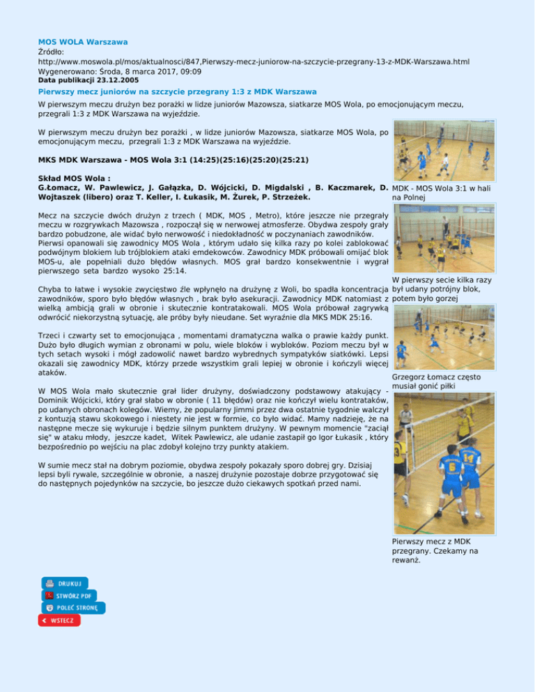 MOS WOLA Warszawa Źródło: http://www.moswola.pl/mos/aktualnosci/847,Pierwszy-mecz-juniorow-na-szczycie-przegrany-13-z-MDK-Warszawa.html Wygenerowano: Środa, 8 marca 2017, 09:09 Data publikacji 23.12.2005 Pierwszy mecz juniorów na szczycie przegrany 1:3 z MDK Warszawa W pierwszym meczu drużyn bez porażki w lidze juniorów Mazowsza, siatkarze MOS Wola, po emocjonującym meczu, przegrali 1:3 z MDK Warszawa na wyjeździe. W pierwszym meczu drużyn bez porażki , w lidze juniorów Mazowsza, siatkarze MOS Wola, po emocjonującym meczu, przegrali 1:3 z MDK Warszawa na wyjeździe. MKS MDK Warszawa - MOS Wola 3:1 (14:25)(25:16)(25:20)(25:21) Skład MOS Wola : G.Łomacz, W. Pawlewicz, J. Gałązka, D. Wójcicki, D. Migdalski , B. Kaczmarek, D. MDK - MOS Wola 3:1 w hali Wojtaszek (libero) oraz T. Keller, I. Łukasik, M. Żurek, P. Strzeżek. na Polnej Mecz na szczycie dwóch drużyn z trzech ( MDK, MOS , Metro), które jeszcze nie przegrały meczu w rozgrywkach Mazowsza , rozpoczął się w nerwowej atmosferze. Obydwa zespoły grały bardzo pobudzone, ale widać było nerwowość i niedokładność w poczynaniach zawodników. Pierwsi opanowali się zawodnicy MOS Wola , którym udało się kilka razy po kolei zablokować podwójnym blokiem lub trójblokiem ataki emdekowców. Zawodnicy MDK próbowali omijać blok MOS-u, ale popełniali dużo błędów własnych. MOS grał bardzo konsekwentnie i wygrał pierwszego seta bardzo wysoko 25:14. W pierwszy secie kilka razy Chyba to łatwe i wysokie zwycięstwo źle wpłynęło na drużynę z Woli, bo spadła koncentracja był udany potrójny blok, zawodników, sporo było błędów własnych , brak było asekuracji. Zawodnicy MDK natomiast z potem było gorzej wielką ambicją grali w obronie i skutecznie kontratakowali. MOS Wola próbował zagrywką odwrócić niekorzystną sytuację, ale próby były nieudane. Set wyraźnie dla MKS MDK 25:16. Trzeci i czwarty set to emocjonująca , momentami dramatyczna walka o prawie każdy punkt. Dużo było długich wymian z obronami w polu, wiele bloków i wybloków. Poziom meczu był w tych setach wysoki i mógł zadowolić nawet bardzo wybrednych sympatyków siatkówki. Lepsi okazali się zawodnicy MDK, którzy przede wszystkim grali lepiej w obronie i kończyli więcej ataków. W MOS Wola mało skutecznie grał lider drużyny, doświadczony podstawowy atakujący Dominik Wójcicki, który grał słabo w obronie ( 11 błędów) oraz nie kończył wielu kontrataków, po udanych obronach kolegów. Wiemy, że popularny Jimmi przez dwa ostatnie tygodnie walczył z kontuzją stawu skokowego i niestety nie jest w formie, co było widać. Mamy nadzieję, że na następne mecze się wykuruje i będzie silnym punktem drużyny. W pewnym momencie "zaciął się" w ataku młody, jeszcze kadet, Witek Pawlewicz, ale udanie zastapił go Igor Łukasik , który bezpośrednio po wejściu na plac zdobył kolejno trzy punkty atakiem. Grzegorz Łomacz często musiał gonić piłki W sumie mecz stał na dobrym poziomie, obydwa zespoły pokazały sporo dobrej gry. Dzisiaj lepsi byli rywale, szczególnie w obronie, a naszej drużynie pozostaje dobrze przygotować się do następnych pojedynków na szczycie, bo jeszcze dużo ciekawych spotkań przed nami. Pierwszy mecz z MDK przegrany. Czekamy na rewanż. Komentarz (0) dodaj komentarz Brak komentarzy dodaj komentarz