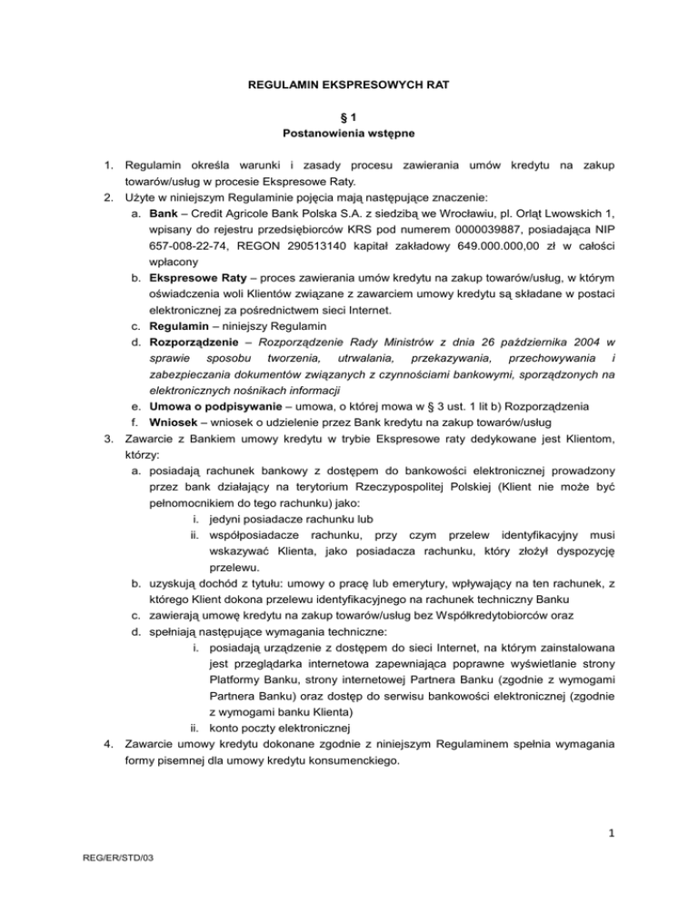 REGULAMIN EKSPRESOWYCH RAT §1 Postanowienia wstępne 1. Regulamin określa warunki i zasady procesu zawierania umów kredytu na zakup towarów/usług w procesie Ekspresowe Raty. 2. UŜyte w niniejszym Regulaminie pojęcia mają następujące znaczenie: a. Bank – Credit Agricole Bank Polska S.A. z siedzibą we Wrocławiu, pl. Orląt Lwowskich 1, wpisany do rejestru przedsiębiorców KRS pod numerem 0000039887, posiadająca NIP 657-008-22-74, REGON 290513140 kapitał zakładowy 649.000.000,00 zł w całości wpłacony b. Ekspresowe Raty – proces zawierania umów kredytu na zakup towarów/usług, w którym oświadczenia woli Klientów związane z zawarciem umowy kredytu są składane w postaci elektronicznej za pośrednictwem sieci Internet. c. Regulamin – niniejszy Regulamin d. Rozporządzenie – Rozporządzenie Rady Ministrów z dnia 26 października 2004 w sprawie sposobu tworzenia, utrwalania, przekazywania, przechowywania i zabezpieczania dokumentów związanych z czynnościami bankowymi, sporządzonych na elektronicznych nośnikach informacji e. Umowa o podpisywanie – umowa, o której mowa w § 3 ust. 1 lit b) Rozporządzenia f. Wniosek – wniosek o udzielenie przez Bank kredytu na zakup towarów/usług 3. Zawarcie z Bankiem umowy kredytu w trybie Ekspresowe raty dedykowane jest Klientom, którzy: a. posiadają rachunek bankowy z dostępem do bankowości elektronicznej prowadzony przez bank działający na terytorium Rzeczypospolitej Polskiej (Klient nie moŜe być pełnomocnikiem do tego rachunku) jako: i. jedyni posiadacze rachunku lub ii. współposiadacze rachunku, przy czym przelew identyfikacyjny musi wskazywać Klienta, jako posiadacza rachunku, który złoŜył dyspozycję przelewu. b. uzyskują dochód z tytułu: umowy o pracę lub emerytury, wpływający na ten rachunek, z którego Klient dokona przelewu identyfikacyjnego na rachunek techniczny Banku c. zawierają umowę kredytu na zakup towarów/usług bez Współkredytobiorców oraz d. spełniają następujące wymagania techniczne: i. posiadają urządzenie z dostępem do sieci Internet, na którym zainstalowana jest przeglądarka internetowa zapewniająca poprawne wyświetlanie strony Platformy Banku, strony internetowej Partnera Banku (zgodnie z wymogami Partnera Banku) oraz dostęp do serwisu bankowości elektronicznej (zgodnie z wymogami banku Klienta) ii. konto poczty elektronicznej 4. Zawarcie umowy kredytu dokonane zgodnie z niniejszym Regulaminem spełnia wymagania formy pisemnej dla umowy kredytu konsumenckiego. 1 REG/ER/STD/03 §2 Akceptacja Regulaminu – zawarcie Umowy o podpisywanie 1. Akceptacja niniejszego Regulaminu, w sposób opisany w § 3 ust. 6 Regulaminu stanowi zawarcie przez Bank i Klienta Umowy o podpisywanie. 2. Umowa o podpisywanie zostaje zawarta pod warunkiem potwierdzenia przez Bank toŜsamości Klienta w oparciu o dane identyfikacyjne nadawcy przelewu oraz skany (zdjęcia) dokumentu toŜsamości Klienta i potwierdzenie otrzymywanych dochodów, przesłanych do Banku zgodnie z § 3 ust. 7-8 Regulaminu. 3. Za datę złoŜenia przez Klienta oświadczenia woli o zawarciu Umowy o podpisywanie uznaje się chwilę zaakceptowania przez Klienta Regulaminu w sposób opisany w § 3 ust. 6 Regulaminu. Akceptacja Regulaminu wywiera skutki prawne od chwili jej dokonania pod warunkiem zaksięgowania na rachunku technicznym Banku przelewu, prawidłowo wykonanego przez Klienta zgodnie z § 3 ust. 8. 4. W przypadku negatywnej weryfikacji załączonych przez Klienta dokumentów lub dokonanego przelewu Umowę o podpisywanie uwaŜa się za niezawartą. 5. Strony ustalają, Ŝe danymi identyfikującymi Klienta, których dołączenie do umowy kredytu stanowi podpisanie tej umowy są: a. Imię i Nazwisko Klienta b. Numer umowy kredytowej c. Data wpływu na rachunek bankowy Klienta dochodu, zgodna z przekazaną do Banku informacją w wygenerowanym z bankowości elektronicznej Klienta potwierdzeniem uzyskiwanego dochodu. 6. Strony ustalają, Ŝe przesłanie przez Klienta do Banku, otrzymanego od Banku spersonalizowanego projektu umowy, dołączenie do niego, poprzez Platformę Banku, danych identyfikujących, zgodnie z § 3 ust. 12 Regulaminu stanowi dołączenie przez Klienta danych identyfikujących, o którym mowa w § 3 ust. 1 lit b) Rozporządzenia, co skutkuje podpisaniem przez Klienta umowy kredytu. §3 Szczegółowy opis procesu zawarcia umowy kredytu w postaci elektronicznej zrównanej z formą pisemną (w trybie Ekspresowe raty) ZłoŜenie wniosku kredytowego i wybór trybu zawarcia umowy 1. Klient wypełnia Wniosek na stronie internetowej Partnera Banku. 2. Po otrzymaniu Wniosku Bank kontaktuje się z Klientem i podczas rozmowy telefonicznej przekazuje mu informacje dotyczące kredytu, informuje o wstępnej decyzji kredytowej, o trybach zawarcia umowy kredytu oraz udziela asysty przedkontraktowej. Jeśli Klient spełnia warunki do zawarcia Umowy kredytu w trybie Ekspresowe raty, Bank składa mu propozycję zawarcia umowy w tym trybie oraz przekazuje informację o haśle, którym zabezpieczone będą przesłane Klientowi pliki zawierające spersonalizowaną umowę kredytu oraz formularz informacyjny EAI. 3. W przypadku wyboru trybu Ekspresowe raty, dalszy proces zawierania umowy kredytu odbywa się w postaci elektronicznej z wykorzystaniem adresu poczty elektronicznej, wskazanego przez Klienta we Wniosku o udzielenie kredytu. 2 REG/ER/STD/03 Wstępna identyfikacja i ocena zdolności kredytowej Klienta. Zawarcie Umowy o podpisywanie. 4. Bank wysyła do Klienta wiadomość mailową (MAIL_1), w której przekazuje: a. link do zaszyfrowanego formularza na Platformie Banku, b. nr rachunku technicznego Banku, na który klient powinien dokonać przelewu identyfikacyjnego, c. numer Wniosku, d. opis dalszego postępowania. 5. W formularzu na Platformie Banku zostają zamieszczone następujące informacje: a. Regulamin Ekspresowych rat, b. opis procesu Ekspresowe raty. 6. Klient w pierwszej kolejności zapozn