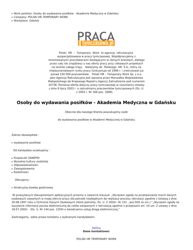 ● ● ● Work position: Osoby do wydawania posiłków - Akademia Medyczna w Gdańsku Company: POLSKI HR TEMPORARY WORK Workplace: Gdańsk Polski HR – Temporary Work to agencja rekrutacyjna wyspecjalizowana w pracy tymczasowej. Współpracujemy z renomowanymi pracodawcami działającymi w różnych branżach, dlatego przez cały rok znajdziesz u nas oferty pracy przy ciekawych projektach na terenie całego kraju. Należymy do Polskiego HR S.A., który na międzynarodowym rynku pracy funkcjonuje od 1999 r. i zrekrutował już ponad 150 000 pracowników. Polski HR – Temporary Work Sp. z o.o. jako Agencja Rekrutacyjna jest wpisana przez Marszałka Województwa Małopolskiego do Krajowego Rejestru Agencji Zatrudnienia pod numerem 10736. Poniższa oferta dotyczy pracy tymczasowej w rozumieniu Ustawy z dnia 9 lipca 2003 r. o zatrudnianiu pracowników tymczasowych (Dz. U. z 2003 r. Nr 166 poz. 1608). Osoby do wydawania posiłków - Akademia Medyczna w Gdańsku Obecnie dla naszego Klienta poszukujemy osób do wydawania posiłków w Akademii Medycznej w Gdańsku Zakres obowiązków : ● wydawanie posiłków Od kandydata oczekujemy : ● ● ● ● ● Książeczki SANEPID Wysokiej kultury osobistej Odpowiedzialności Zaangażowania Rzetelności Oferujemy : ● Atrakcyjną stawkę godzinową W przesyłanych dokuąmentach aplikacyjnych prosimy o zawarcie klauzuli: „Wyrażam zgodę na przetwarzanie moich danych osobowych zawartych w mojej ofercie pracy dla potrzeb niezbędnych do realizacji procesu rekrutacji zgodnie z Ustawą z dnia 29.08.1997 roku o Ochronie Danych Osobowych (tekst jednolity: Dz. U. Z 2002r. Nr 101 , poz.926 ze zm.).”„Wyrażam zgodę na wysyłanie informacji poczta elektroniczną do celów związanych z rekrutacją zgodnie z przepisami art. 10 ust. 2 ustawy z dnia 18.07.2002r. (Dz. U. Nr 144 poz. 1204) o świadczeniu usług drogą elektroniczną.” Zastrzegamy sobie prawo kontaktu z wybranymi kandydatami. Aplikuj Dane kontaktowe: POLSKI HR TEMPORARY WORK Send Save Print Tweet