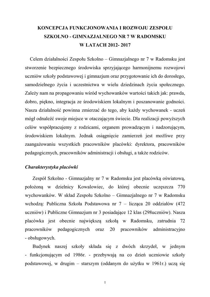 KONCEPCJA FUNKCJONOWANIA I ROZWOJU ZESPOŁU SZKOLNO - GIMNAZJALNEGO NR 7 W RADOMSKU W LATACH 2012- 2017 Celem działalności Zespołu Szkolno – Gimnazjalnego nr 7 w Radomsku jest stworzenie bezpiecznego środowiska sprzyjającego harmonijnemu rozwojowi uczniów szkoły podstawowej i gimnazjum oraz przygotowanie ich do dorosłego, samodzielnego życia i uczestnictwa w wielu dziedzinach życia społecznego. Zależy nam na propagowaniu wśród wychowanków wartości takich jak: prawda, dobro, piękno, integracja ze środowiskiem lokalnym i poszanowanie godności. Nasza działalność powinna zmierzać do tego, aby każdy wychowanek - uczeń mógł odnaleźć swoje miejsce w otaczającym świecie. Dla realizacji powyższych celów współpracujemy z rodzicami, organem prowadzącym i nadzorującym, środowiskiem lokalnym. Jednak osiągnięcie zamierzeń jest możliwe przy zaangażowaniu wszystkich pracowników placówki: dyrektora, pracowników pedagogicznych, pracowników administracji i obsługi, a także rodziców. Charakterystyka placówki Zespół Szkolno - Gimnazjalny nr 7 w Radomsku jest placówką oświatową, położoną w dzielnicy Kowalowiec, do której obecnie uczęszcza 770 wychowanków. W skład Zespołu Szkolno – Gimnazjalnego nr 7 w Radomsku wchodzą: Publiczna Szkoła Podstawowa nr 7 – licząca 20 oddziałów (472 uczniów) i Publiczne Gimnazjum nr 3 posiadające 12 klas (298uczniów). Nasza placówka jest obecnie największą szkołą w Radomsku, zatrudnia 72 pracowników pedagogicznych oraz 20 pracowników administracyjno - obsługowych. Budynek naszej szkoły składa się z dwóch skrzydeł, w jednym - funkcjonującym od 1986r. - przebywają na co dzień uczniowie szkoły podstawowej, w drugim – starszym (oddanym do użytku w 1961r.) uczą się 1 gimnazjaliści. Historia Publicznej Szkoły Podstawowej nr 7 sięga 1938 roku, natomiast Publiczne Gimnazjum nr 3 powstało w związku z reformą oświaty w 1999r. Od 1 września 2003r. obie szkoły funkcjonują jako Zespół Szkolno - Gimnazjalny nr 7 w Radomsku. Aby wypełnić misję placówki, nasze działania powinny polegać na kontynuacji podjętych w poprzednich latach zadań oraz na realizacji niżej określonych kierunków pracy. Zostały one ustalone w oparciu o „Koncepcję pracy PSP7 i PG3 n lata 2010 – 2015”, wewnętrzne badania przeprowadzone wśród rodziców, nauczycieli i uczniów , własne doświadczenia wyniesione z pracy na stanowisku wicedyrektora Zespołu Szkolno- Gimnazjalnego nr 7 w latach 2007-2012 oraz określenie mocnych i słabych stron działalności placówki. Do mocnych stron szkoły należą: - bezpieczna szkoła, wolna od zagrożeń; - w porę zauważony problem i praca nad nim; - rozwój osobisty i społeczny uczniów ( w tym przede wszystkim umiejętność pracy w grupie), „uczenie dzieci jak żyć”; - wysoko wykwalifikowana, przyjazna i kreatywna kadra pedagogiczna; - zorganizowanie w szkole dwóch świetlic: osobno dla uczniów klas 0-III i drugiej – z przeznaczeniem dla klas IV-VI oraz gimnazjum; - szacunek społeczności lokalnej. Do słabych stron trzeba zaliczyć: - brak boiska; - możliwość wchodzenia do szkoły osób z zewnątrz – bez kontroli; - słaby przepływ informacji; - nauka uczniów klas 0 - III na dwie zmiany; 2 - małe zaangażowanie rodziców w działalność szkoły; - niewystarczająca ilość nowoczesnych pomocy dydaktycznych w salach. W związku z powyższym należy określić takie kierunki działania, które by rozwijały i poszerzały mocne strony działalności placówki, a w miarę możliwości likwidowały i zapobiegały powstawaniu nowych - słabych stron jej funkcjonowania. Główne kierunki tych działań tworzą koncepcję mojej ewentualnej pracy na stanowisku dyrektora Zespołu Szkolno- Gimnazjalnego nr 7 w Radomsku: 1. Poszerzenie oferty edukacyjnej szkoły. Orientacja zawodowa. 2. Doskonalenie procesu opiekuńczo- wychowawczego w szkole. 3. Podnoszenie kwalifikacji i umiejętności nauczycieli, stymulowanie ich rozwoju zawodowego. 4. Współpraca ze środowiskiem lokalnym jako wspomaganie realizacji zadań zespołu. Budowanie partnerskich zasad współpracy z rodzicami 5. Poprawa bazy. 6. Podniesienie jakości pracy placówki polegające na zapewnieniu skutecznego zarządzania wszystkimi dziedzinami pracy szkoły. Organizacja pracy dyrektora szkoły. 7. Ograniczanie kosztów funkcjonowania placówki Pełniąc funkcję dyrektora chciałabym kontynuować tworzenie w szkole optymalnych warunków do wszechstronnego, harmonijnego rozwoju wszystkich uczniów, z uwzględnieniem ich indywidualnych potrzeb i oczekiwań; tworzenie szkoły przyjaznej dziecku i jego rodzinie, zapewniającej godne warunki pracy 3 i rozwoju wszystkim pracownikom. Chciałabym kontynuować współpracę ze środowiskiem lokalnym oraz instytucjami i organizacjami oświatowymi. Powyższe cele zamierzam realizować poprzez podjęcie następujących przedsięwzięć w najważniejszych dziedzinach pracy szkoły: * Proces kształcenia W zakresie aktualizowania i uatrakcyjniania oferty edukacyjnej szkoły podejmę działania: - kontynuowania inicjatywy związanej z organizacją w gimnazjum klas z rozszerzonym programem wychowania fizycznego – piłka nożna; - zwiększenia oferty kół zainteresowań i dostosowania rodzaju kół do zainteresowań uczniów oraz poszerzenia oferty zajęć dla uczniów szczególnie uzdolnionych (mających na celu przygotowanie ich do konkursów przedmiotowych); - zorganizowania „pogotowia przedmiotowego” - dodatkowych zajęć dla dzieci mających trudności w nauce; - uatrakcyjniania nauczania przez współpracę z organizacjami pozarządowymi i samorządowymi; - wyposażenia biblioteki szkolnej w książki do czytania, czasopisma i filmy w j. angielskim, niemieckim i włoskim; - większego wykorzystania podczas zajęć technologii komputerowej i tablicy interaktywnej; - prowadzenia zajęć lekcyjnych i pozalekcyjnych w pracowni informatyczn