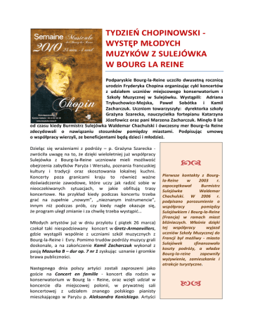TYDZIEŃ CHOPINOWSKI WYSTĘP MŁODYCH MUZYKÓW Z SULEJÓWKA W BOURG LA REINE Podparyskie Bourg-la-Reine uczciło dwusetną rocznicę urodzin Fryderyka Chopina organizując cykl koncertów z udziałem uczniów miejscowego konserwatorium i Szkoły Muzycznej w Sulejówku. Wystąpili: Adriana Trybuchowicz-Mojska, Paweł Sobótka i Kamil Zacharczuk. Uczniom towarzyszyły: dyrektorka szkoły Grażyna Szarecka, nauczycielka fortepianu Katarzyna Józefowicz oraz pani Marzena Zacharczuk. Minęło 8 lat od czasu kiedy Burmistrz Sulejówka Waldemar Chachulski i ówczesny mer Bourg–la Reine zdecydowali o nawiązaniu stosunków pomiędzy miastami. Podpisując umowę o współpracy wierzyli, ze beneficjentami będą dzieci i młodzież. Dzieląc się wrażeniami z podróży – p. Grażyna Szarecka zwróciła uwagę na to, że dzięki wieloletniej już współpracy Sulejówka z Bourg-la-Reine uczniowie mieli możliwość obejrzenia zabytków Paryża i Wersalu, poznania francuskiej kultury i tradycji oraz skosztowania lokalnej kuchni. Koncerty poza granicami kraju to również ważne doświadczenie zawodowe, które uczy jak radzić sobie w nieoczekiwanych sytuacjach, w jakie obfitują trasy koncertowe. Na przykład kiedy podczas koncertu trzeba grać na zupełnie „nowym”, „nieznanym instrumencie”, innym niż podczas prób, czy kiedy nagle okazuje się, że program uległ zmianie i za chwilę trzeba wystąpić… Młodych artystów już w dniu przylotu ( piątek 26 marca) czekał taki niespodziewany koncert w Gretz-Armanvillers, gdzie wystąpili wspólnie z uczniami szkół muzycznych z Bourg-la-Reine i Evry. Pomimo trudów podróży muzycy grali doskonale, a na zakończenie Kamil Zacharczuk wykonał z pasją Mazurka B – dur op. 7 nr 1 zyskując uznanie i gromkie brawa publiczności. Następnego dnia polscy artyści zostali zaproszeni jako goście na Concert en famille - koncert dla rodzin w konserwatorium w Bourg la - Reine, oraz wzięli udział w koncercie dla miejscowej polonii, w prywatnej sali koncertowej z udziałem znanego polskiego pianisty mieszkającego w Paryżu p. Aleksandra Konickiego. Artyści Pierwsze kontakty z Bourgla-Reine w 2003 r. zapoczątkował Burmistrz Sulejówka Waldemar Chachulski. W 2006 r. podpisano porozumienie o współpracy pomiędzy Sulejówkiem i Bourg-la-Reine (Francja) w ramach miast bliźniaczych. Właśnie dzięki tej współpracy wyjazd uczniów Szkoły Muzycznej do Francji był możliwy - miasto Sulejówek sfinansowało koszty podróży, a władze Bourg-la-reine zapewniły wyżywienie, zamieszkanie i atrakcje turystyczne. koncertowali na prawie 100 letnim instrumencie – legendarnym STEINWAY-u. W niedzielę 28 marca odbył się Concert des Ensembles w sali koncertowej Agoreine z udziałem Pawła Sobótki, który zagrał Fantaisie-Impromptu cis - moll , a na bis wykonał Preludium nr 14 op. 28. Z kolei 29 i 31 marca Adriana Trybuchowicz-Mojska i Kamil Zacharczuk wystąpili gościnnie podczas koncertów konserwatorium Bourg – la – Reine w Sal Audytorium. Adriana wykonała Nokturn cis – moll op. 7 nr 1, a Kamil Nokturn Es – dur op. 2 nr 13. Występy młodych, polskich artystów publiczność i organizatorzy Tygodnia Chopinowskiego, tj. Stowarzyszenia Przyjaźni Międzynarodowych Bourg-la-Reine ARAI i Stowarzyszenia Ile-deFrance en Varsovie przyjmowali entuzjastycznie. Muzycy dzięki talentowi i dobremu przygotowaniu zdobyli również uznanie uczniów i nauczycieli szkół z Bourg-la-Reine i Evry. Szkoły przyjęły zaproszenie do Sulejówka, gdzie w ramach rewizyty wezmą udział w Międzynarodowym Festiwalu Chopinowskim dla Młodzieży – JuVena 2010, na które wszystkich melomanów w dniach od 31 maja do 2 czerwca serdecznie zapraszamy. Agnieszka Wyrostkiewicz od lewej: Marzena Zacharczuk, Kamil Zacharczuk, GraŜyna Szarecka, Paweł Sobótka, Katarzyna Józefowicz, Ada Trybuchowicz - Mojska Gra Kamil Zacharczuk Za fortepianem - Ada Trybuchowicz – Mojska Występ Pawła Sobótki