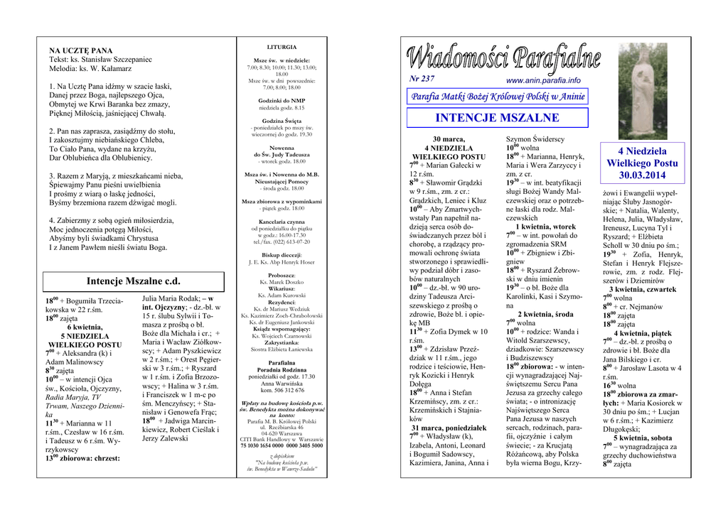 NA UCZTĘ PANA Tekst: ks. Stanisław Szczepaniec Melodia: ks. W. Kałamarz 1. Na Ucztę Pana idźmy w szacie łaski, Danej przez Boga, najlepszego Ojca, Obmytej we Krwi Baranka bez zmazy, Pięknej Miłością, jaśniejącej Chwałą. 2. Pan nas zaprasza, zasiądźmy do stołu, I zakosztujmy niebiańskiego Chleba, To Ciało Pana, wydane na krzyżu, Dar Oblubieńca dla Oblubienicy. 3. Razem z Maryją, z mieszkańcami nieba, Śpiewajmy Panu pieśni uwielbienia I prośmy z wiarą o łaskę jedności, Byśmy brzemiona razem dźwigać mogli. 4. Zabierzmy z sobą ogień miłosierdzia, Moc jednoczenia potęgą Miłości, Abyśmy byli świadkami Chrystusa I z Janem Pawłem nieśli światu Boga. LITURGIA Msze św. w niedziele: 7.00; 8.30; 10.00; 11.30; 13.00; 18.00 Msze św. w dni powszednie: 7.00; 8.00; 18.00 Godzinki do NMP niedziela godz. 8.15 Godzina Święta - poniedziałek po mszy św. wieczornej do godz. 19.30 Nowenna do Św. Judy Tadeusza - wtorek godz. 18.00 Msza św. i Nowenna do M.B. Nieustającej Pomocy - środa godz. 18.00 Msza zbiorowa z wypominkami - piątek godz. 18.00 Kancelaria czynna od poniedziałku do piątku w godz.: 16.00-17.30 tel./fax. (022) 613-07-20 Biskup diecezji: J. E. Ks. Abp Henryk Hoser Intencje Mszalne c.d. 1800 + Bogumiła Trzeciakowska w 22 r.śm. 1800 zajęta 6 kwietnia, 5 NIEDZIELA WIELKIEGO POSTU 700 + Aleksandra (k) i Adam Malinowscy 830 zajęta 1000 – w intencji Ojca św., Kościoła, Ojczyzny, Radia Maryja, TV Trwam, Naszego Dziennika 1130 + Marianna w 11 r.śm., Czesław w 16 r.śm. i Tadeusz w 6 r.śm. Wyrzykowscy 1300 zbiorowa: chrzest: Julia Maria Rodak; – w int. Ojczyzny; - dz.-bł. w 15 r. ślubu Sylwii i Tomasza z prośbą o bł. Boże dla Michała i cr.; + Maria i Wacław Ziółkowscy; + Adam Pyszkiewicz w 2 r.śm.; + Orest Pęgierski w 3 r.śm.; + Ryszard w 1 r.śm. i Zofia Brzozowscy; + Halina w 3 r.śm. i Franciszek w 1 m-c po śm. Menczyńscy; + Stanisław i Genowefa Frąc; 1800 + Jadwiga Marcinkiewicz, Robert Cieślak i Jerzy Zalewski Proboszcz: Ks. Marek Doszko Wikariusz: Ks. Adam Kurowski Rezydenci: Ks. dr Mariusz Wedziuk Ks. Kazimierz Zoch-Chrabołowski Ks. dr Eugeniusz Jankowski Ksiądz wspomagający: Ks. Wojciech Czarnowski Zakrystianka: Siostra ElŜbieta Łaniewska Parafialna Poradnia Rodzinna poniedziałki od godz. 17.30 Anna Warwińska kom. 506 312 676 Wpłaty na budowę kościoła p.w. św. Benedykta moŜna dokonywać na konto: Parafia M. B. Królowej Polski ul. Rzeźbiarska 46 04-620 Warszawa CITI Bank Handlowy w Warszawie 75 1030 1654 0000 0000 3405 5000 z dopiskiem "Na budowę kościoła p.w. św. Benedykta w Wawrze-Sadulu” Nr 237 www.anin.parafia.info Parafia Matki BoŜej Królowej Polski w Aninie INTENCJE MSZALNE 30 marca, 4 NIEDZIELA WIELKIEGO POSTU 700 + Marian Gałecki w 12 r.śm. 830 + Sławomir Grądzki w 9 r.śm., zm. z cr.: Grądzkich, Leniec i Kluz 1000 – Aby Zmartwychwstały Pan napełnił nadzieją serca osób doświadczanych przez ból i chorobę, a rządzący promowali ochronę świata stworzonego i sprawiedliwy podział dóbr i zasobów naturalnych 1000 – dz.-bł. w 90 urodziny Tadeusza Arciszewskiego z prośbą o zdrowie, Boże bł. i opiekę MB 1130 + Zofia Dymek w 10 r.śm. 1300 + Zdzisław Przeździak w 11 r.śm., jego rodzice i teściowie, Henryk Kozicki i Henryk Dołęga 1800 + Anna i Stefan Krzemińscy, zm. z cr.: Krzemińskich i Stajniaków 31 marca, poniedziałek 700 + Władysław (k), Izabela, Antoni, Leonard i Bogumił Sadowscy, Kazimiera, Janina, Anna i Szymon Świderscy 1000 wolna 1800 + Marianna, Henryk, Maria i Wera Zarzyccy i zm. z cr. 1930 – w int. beatyfikacji sługi Bożej Wandy Malczewskiej oraz o potrzebne łaski dla rodz. Malczewskich 1 kwietnia, wtorek 700 – w int. powołań do zgromadzenia SRM 1000 + Zbigniew i Zbigniew 1800 + Ryszard Żebrowski w dniu imienin 1930 – o bł. Boże dla Karolinki, Kasi i Szymona 2 kwietnia, środa 700 wolna 1000 + rodzice: Wanda i Witold Szarszewscy, dziadkowie: Szarszewscy i Budziszewscy 1800 zbiorowa: - w intencji wynagradzającej Najświętszemu Sercu Pana Jezusa za grzechy całego świata; - o intronizację Najświętszego Serca Pana Jezusa w naszych sercach, rodzinach, parafii, ojczyźnie i całym świecie; - za Krucjatą Różańcową, aby Polska była wierna Bogu, Krzy- 4 Niedziela Wielkiego Postu 30.03.2014 żowi i Ewangelii wypełniając Śluby Jasnogórskie; + Natalia, Walenty, Helena, Julia, Władysław, Ireneusz, Lucyna Tyl i Ryszard; + Elżbieta Scholl w 30 dniu po śm.; 1930 + Zofia, Henryk, Stefan i Henryk Flejszerowie, zm. z rodz. Flejszerów i Dziemirów 3 kwietnia, czwartek 700 wolna 800 + cr. Nejmanów 1800 zajęta 1800 zajęta 4 kwietnia, piątek 700 – dz.-bł. z prośbą o zdrowie i bł. Boże dla Jana Bilskiego i cr. 800 + Jarosław Lasota w 4 r.śm. 1630 wolna 1800 zbiorowa za zmarłych: + Maria Kosiorek w 30 dniu po śm.; + Lucjan w 6 r.śm.; + Kazimierz Długokęski; 5 kwietnia, sobota 700 – wynagradzająca za grzechy duchowieństwa 800 zajęta Liturgia Słowa Bożego 1 Sm 16,1b.6-7.1013a Pan mym pasterzem, nie brak mi niczego Ef 5,8-14 J 9,1-41 Jezus przechodząc obok ujrzał pewnego człowieka, niewidomego od urodzenia. Uczniowie Jego zadali Mu pytanie: Rabbi, kto zgrzeszył, że się urodził niewidomym on czy jego rodzice? Jezus odpowiedział: Ani on nie zgrzeszył, ani rodzice jego, ale /stało się tak/, aby się na nim objawiły sprawy Boże. Potrzeba nam pełnić dzieła Tego, który Mnie posłał, dopóki jest dzień. Nadchodzi noc, kiedy nikt nie będzie mógł działać. Jak długo jestem na świecie, jestem światłością świata. To powiedziawszy splunął na ziemię, uczynił błoto ze śliny i nałożył je na oczy niewidomego, i rzekł do niego: Idź, obmyj się w sadzawce Siloam co się tłumaczy: Posłany. On więc odszedł, obmył się i wrócił widząc. A sąsiedzi i ci, którzy przedtem widywali go jako żebraka, mówili: Czyż to nie jest ten, który siedzi i żebrze? (…) Zaprowadzili więc te