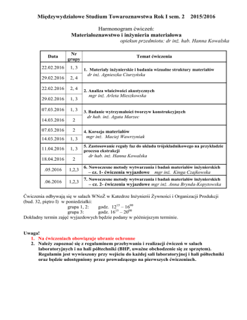 Międzywydziałowe Studium Towaroznawstwa Rok I sem. 2 2015/2016 Harmonogram ćwiczeń: Materiałoznawstwo i inżynieria materiałowa opiekun przedmiotu: dr inż. hab. Hanna Kowalska Data Nr grupy 22.02.2016 1, 3 29.02.2016 2, 4 22.02.2016 2, 4 29.02.2016 1, 3 07.03.2016 1, 3 14.03.2016 2 07.03.2016 2 14.03.2016 1, 3 11.04.2016 1, 3 18.04.2016 2 .05.2016 1,2,3 6. Nowoczesne metody wytwarzania i badań materiałów inżynierskich – cz. 1- ćwiczenia wyjazdowe mgr inż. Kinga Czajkowska .06.2016 1,2,3 7. Nowoczesne metody wytwarzania i badań materiałów inżynierskich – cz. 2- ćwiczenia wyjazdowe mgr inż. Anna Brynda-Kopytowska Temat ćwiczenia 1. Materiały inżynierskie i badania wizualne struktury materiałów dr inż. Agnieszka Ciurzyńska 2. Analiza właściwości akustycznych mgr inż. Arleta Mieszkowska 3. Badanie wytrzymałości tworzyw konstrukcyjnych dr hab. inż. Agata Marzec 4. Korozja materiałów mgr inż. Maciej Wawrzyniak 5. Zastosowanie reguły faz do układu trójskładnikowego na przykładzie procesu ekstrakcji dr hab. inż. Hanna Kowalska Ćwiczenia odbywają się w salach WNoŻ w Katedrze Inżynierii Żywności i Organizacji Produkcji (bud. 32, piętro I) w poniedziałki: grupa 1, 2: godz. 1215 – 1600 grupa 3: godz. 1615 – 2000 Dokładny termin zajęć wyjazdowych będzie podany w późniejszym terminie. Uwaga! 1. Na ćwiczeniach obowiązuje ubranie ochronne 2. Należy zapoznać się z regulaminem przebywania i realizacji ćwiczeń w salach laboratoryjnych i na hali półtechniki (BHP, uważne obchodzenie się ze sprzętem). Regulamin jest wywieszony przy wejściu do każdej sali laboratoryjnej i hali półtechniki oraz będzie udostępniony przez prowadzącego na pierwszych ćwiczeniach. Regulamin odrabiania i zaliczenia przedmiotu Materiałoznawstwo i inżynieria materiałowa ZASADY REALIZACJI I ODRABIANIA ĆWICZEŃ 1. Na pierwszych zajęciach obowiązuje zapoznanie się z regulaminem przebywania i realizacji ćwiczeń w salach laboratoryjnych i na hali półtechniki w Katedrze Inżynierii Żywności i Org. Prod. oraz podpisanie związanego z tym oświadczenia. 2. Obowiązuje obecność na ćwiczeniu w terminie wyznaczonym dla grupy. Zmiana grupy lub terminu może mieć miejsce tylko w uzasadnionych przypadkach za zgodą prowadzącego ćwiczenia. 3. Do ćwiczeń należy przygotować się z materiału zalecanego przez prowadzącego. Materiały będą wywieszane w gablocie na I piętrze Katedry Inżynierii Żywności i Org. Prod. w budynku nr 32. 4. Obowiązuje przygotowanie się do realizacji bieżącego tematu ćwiczeń; przeprowadzane jest kolokwium. Czas pisania kolokwium ok. 15 min. 5. Po zrealizowaniu ćwiczenia należy przygotować sprawozdanie i przekazać prowadzącemu na początku kolejnych ćwiczeń. Brak oddanego sprawozdania oznacza 0 punktów. Każde sprawozdanie musi mieć stronę tytułową, na której muszą znaleźć się informacje: - nazwa kierunku, wydziału, rok studiów, - data, miejscowość - nazwa przedmiotu, temat ćwiczenia, - nazwiska wykonawcy/-ów - nazwisko prowadzącego 4. Przy ocenie kolokwium i sprawozdań obowiązuje system punktowy: - kolokwium - maksymalnie 6 pkt. - sprawozdanie - maksymalnie 4 pkt. - dodatkowo obowiązuje przygotowanie pracy przeglądowej w zespołach 2-osobowych (oceniane 0-6 pkt.) na ok. 3-5 stron – tematyka związana z nowoczesnymi rozwiązaniami technicznymi, materiałowymi. Studenci mogą sami zaproponować temat opracowania, np. właściwości i zastosowanie grafenu, biomateriały, materiały inteligentne.. Wymogiem jest wykazanie przynajmniej 5 źródeł literaturowych, na podstawie których powstało opracowanie - za obecność na zajęciach wyjazdowych przysługują dodatkowe 2 pkt za każde zajęcia. 5. Studenci realizujący ćwiczenia w salach laboratoryjnych mogą przebywać tylko w ubraniach ochronnych (fartuchach). WARUNKI ZALICZENIA PRZEDMIOTU W przypadku nie uzyskania minimalnej liczby punktów (51%) studentowi przysługuje kolokwium wyjściowe z całości materiału ćwiczeniowego. Warunkiem dopuszczenia do kolokwium wykładowego jest uzyskanie oceny dostatecznej z ćwiczeń. OCENA KOŃCOWA Ocena końcowa wyliczana jest na podstawie punktów z ćwiczeń i kolokwium wykładowego. Obowiązują następujące kryteria wystawiania ocen: [%] 0-51 51-60 61-70 71-80 81-90 91-100 Ocena ocena niedostateczna (2,0) ocena dostateczna (3,0) ocena dość dobra (3,5) ocena dobra (4,0) ocena ponad dobra (4,5) ocena bardzo dobra (5,0)