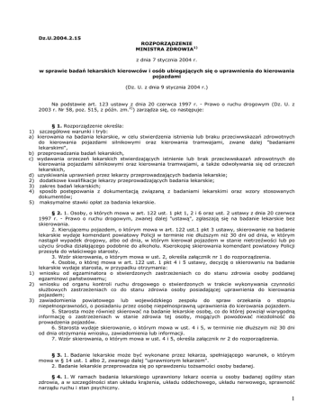 Dz.U.2004.2.15 ROZPORZĄDZENIE MINISTRA ZDROWIA1) z dnia 7 stycznia 2004 r. w sprawie badań lekarskich kierowców i osób ubiegających się o uprawnienia do kierowania pojazdami (Dz. U. z dnia 9 stycznia 2004 r.) Na podstawie art. 123 ustawy z dnia 20 czerwca 1997 r. - Prawo o ruchu drogowym (Dz. U. z 2003 r. Nr 58, poz. 515, z późn. zm.2)) zarządza się, co następuje: § 1. Rozporządzenie określa: 1) szczegółowe warunki i tryb: a) kierowania na badania lekarskie, w celu stwierdzenia istnienia lub braku przeciwwskazań zdrowotnych do kierowania pojazdami silnikowymi oraz kierowania tramwajami, zwane dalej "badaniami lekarskimi", b) przeprowadzania badań lekarskich, c) wydawania orzeczeń lekarskich stwierdzających istnienie lub brak przeciwwskazań zdrowotnych do kierowania pojazdami silnikowymi oraz kierowania tramwajami, a takŜe odwoływania się od orzeczeń lekarskich, d) uzyskiwania uprawnień przez lekarzy przeprowadzających badania lekarskie; 2) dodatkowe kwalifikacje lekarzy przeprowadzających badania lekarskie; 3) zakres badań lekarskich; 4) sposób postępowania z dokumentacją związaną z badaniami lekarskimi oraz wzory stosowanych dokumentów; 5) maksymalne stawki opłat za badania lekarskie. § 2. 1. Osoby, o których mowa w art. 122 ust. 1 pkt 1, 2 i 6 oraz ust. 2 ustawy z dnia 20 czerwca 1997 r. - Prawo o ruchu drogowym, zwanej dalej "ustawą", zgłaszają się na badanie lekarskie bez skierowania. 2. Kierującemu pojazdem, o którym mowa w art. 122 ust.1 pkt 3 ustawy, skierowanie na badanie lekarskie wydaje komendant powiatowy Policji w terminie nie dłuŜszym niŜ 30 dni od dnia, w którym nastąpił wypadek drogowy, albo od dnia, w którym kierował pojazdem w stanie nietrzeźwości lub po uŜyciu środka działającego podobnie do alkoholu. Kserokopię skierowania komendant powiatowy Policji przesyła do właściwego starosty. 3. Wzór skierowania, o którym mowa w ust. 2, określa załącznik nr 1 do rozporządzenia. 4. Osobie, o której mowa w art. 122 ust. 1 pkt 4 i 5 ustawy, decyzję o skierowaniu na badanie lekarskie wydaje starosta, w przypadku otrzymania: 1) wniosku od egzaminatora o stwierdzonych zastrzeŜeniach co do stanu zdrowia osoby poddanej egzaminowi państwowemu; 2) wniosku od organu kontroli ruchu drogowego o stwierdzonych w trakcie wykonywania czynności słuŜbowych zastrzeŜeniach co do stanu zdrowia osoby posiadającej uprawnienia do kierowania pojazdem; 3) zawiadomienia powiatowego lub wojewódzkiego zespołu do spraw orzekania o stopniu niepełnosprawności, o posiadaniu przez osobę niepełnosprawną uprawnienia do kierowania pojazdem. 5. Starosta moŜe równieŜ skierować na badanie lekarskie osobę, co do której powziął wiarygodną informację o zastrzeŜeniach w stanie zdrowia tej osoby, mogących powodować niezdolność do prowadzenia pojazdów. 6. Starosta wydaje skierowanie, o którym mowa w ust. 4 i 5, w terminie nie dłuŜszym niŜ 30 dni od dnia otrzymania wniosku, zawiadomienia lub informacji. 7. Wzór skierowania, o którym mowa w ust. 4 i 5, określa załącznik nr 2 do rozporządzenia. § 3. 1. Badanie lekarskie moŜe być wykonane przez lekarza, spełniającego warunek, o którym mowa w § 14 ust. 1 albo 2, zwanego dalej "uprawnionym lekarzem". 2. Badanie lekarskie przeprowadza się po sprawdzeniu toŜsamości osoby badanej. § 4. 1. W ramach badania lekarskiego uprawniony lekarz ocenia u osoby badanej ogólny stan zdrowia, a w szczególności stan układu krąŜenia, układu oddechowego, układu nerwowego, sprawność narządu ruchu i stan psychiczny. 1 2. W wyniku badania lekarskiego uprawniony lekarz stwierdza u osoby badanej istnienie lub brak: chorób narządu wzroku; chorób narządu słuchu i równowagi; chorób układu sercowo-naczyniowego; chorób narządu ruchu; chorób układu nerwowego; zaburzeń psychicznych; cukrzycy, przy uwzględnieniu wyników badania poziomu cukru we krwi; niewydolności nerek; objawów wskazujących na uzaleŜnienie od alkoholu lub jego naduŜywanie; objawów wskazujących na uzaleŜnienie od środków o działaniu podobnym do alkoholu lub ich naduŜywanie; 11) przyjmowania leków, mogących mieć wpływ na zdolność do prowadzenia pojazdu; 12) innych powaŜnych zaburzeń stanu zdrowia istotnych dla oceny zdolności do prowadzenia pojazdu. 3. JeŜeli uprawniony lekarz stwierdzi istotne odchylenia od prawidłowego stanu zdrowia, zleca osobie badanej odpowiednie badania pomocnicze i konsultacje specjalistyczne. 4. Skierowanie w celu wykonania konsultacji okulistycznej oraz przeprowadzenia badania oceniającego widzenie zmierzchowe i zjawisko olśnienia jest obligatoryjne w odniesieniu do: 1) osób ubiegających się albo posiadających prawo jazdy kategorii C, C1, D, D1, C+E, C1+E, D+E, D1+E lub pozwolenie do kierowania tramwajem; 2) kierowców podlegających kontrolnym badaniom lekarskim, o których mowa w art. 122 ust. 2 ustawy; 3) kandydatów na instruktorów lub egzaminatorów osób ubiegających się o uprawnienia do kierowania pojazdami; 4) kierowców podlegających badaniom lekarskim, o których mowa w art. 39c ustawy z dnia 6 września 2001 r. o transporcie drogowym (Dz. U. Nr 125, poz. 1371, z późn. zm.3)). 5. Przy ustalaniu ograniczeń w kierowaniu pojazdem wynikających ze stanu zdrowia kandydata na kierowcę i kierowcy naleŜy brać pod uwagę stopień zaawansowania objawów chorobowych i ich dynamikę, z uwzględnieniem moŜliwości postępu choroby, jak i cofania się jej objawów. 6. W przypadku zastrzeŜeń co do stanu zdrowia kandydata na kierowcę i kierowcy, uprawniony lekarz wyznacza datę ponownego badania wynikającą z oceny stanu zdrowia osoby badanej. 7. Uprawniony lekarz powinien korzystać ze wskazówek metodycznych dotyczących postępowania w stosunku do kandydatów na kierowców i kierowców, upowszechnianych przez jednostki badawczorozwojowe w dziedzinie medycyny pracy. 1) 2) 3) 4) 5) 6) 7) 8) 9) 10) § 5. JeŜeli kierujący pojazdem lub osoba