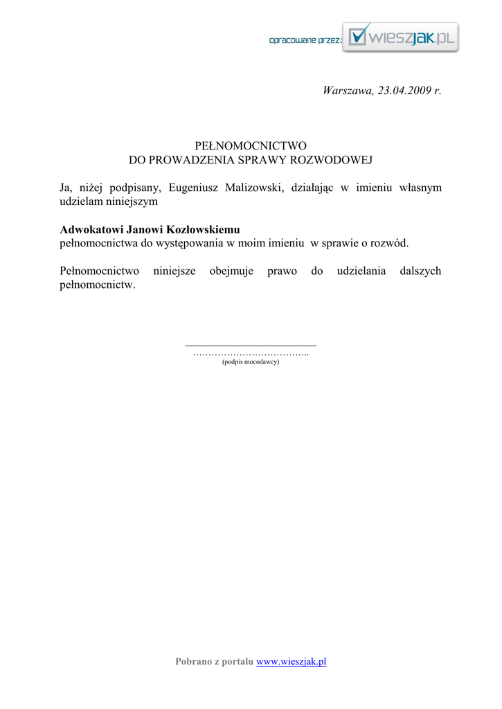 Warszawa, 23.04.2009 r. PEŁNOMOCNICTWO DO PROWADZENIA SPRAWY ROZWODOWEJ Ja, niżej podpisany, Eugeniusz Malizowski, działając w imieniu własnym udzielam niniejszym Adwokatowi Janowi Kozłowskiemu pełnomocnictwa do występowania w moim imieniu w sprawie o rozwód. Pełnomocnictwo pełnomocnictw. niniejsze obejmuje prawo do ______________________ ……………………………….. (podpis mocodawcy) Pobrano z portalu www.wieszjak.pl udzielania dalszych
