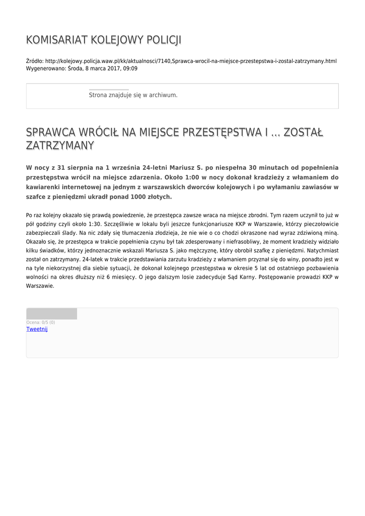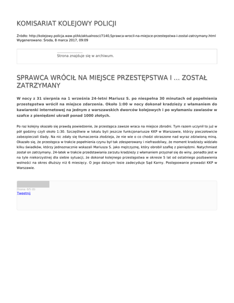 KOMISARIAT KOLEJOWY POLICJI Źródło: http://kolejowy.policja.waw.pl/kk/aktualnosci/7140,Sprawca-wrocil-na-miejsce-przestepstwa-i-zostal-zatrzymany.html Wygenerowano: Środa, 8 marca 2017, 09:09 Strona znajduje się w archiwum. SPRAWCA WRÓCIŁ NA MIEJSCE PRZESTĘPSTWA I ... ZOSTAŁ ZATRZYMANY W nocy z 31 sierpnia na 1 września 24-letni Mariusz S. po niespełna 30 minutach od popełnienia przestępstwa wrócił na miejsce zdarzenia. Około 1:00 w nocy dokonał kradzieży z włamaniem do kawiarenki internetowej na jednym z warszawskich dworców kolejowych i po wyłamaniu zawiasów w szafce z pieniędzmi ukradł ponad 1000 złotych. Po raz kolejny okazało się prawdą powiedzenie, że przestępca zawsze wraca na miejsce zbrodni. Tym razem uczynił to już w pół godziny czyli około 1:30. Szczęśliwie w lokalu byli jeszcze funkcjonariusze KKP w Warszawie, którzy pieczołowicie zabezpieczali ślady. Na nic zdały się tłumaczenia złodzieja, że nie wie o co chodzi okraszone nad wyraz zdziwioną miną. Okazało się, że przestępca w trakcie popełnienia czynu był tak zdesperowany i niefrasobliwy, że moment kradzieży widziało kilku świadków, którzy jednoznacznie wskazali Mariusza S. jako mężczyznę, który obrobił szafkę z pieniędzmi. Natychmiast został on zatrzymany. 24-latek w trakcie przedstawiania zarzutu kradzieży z włamaniem przyznał się do winy, ponadto jest w na tyle niekorzystnej dla siebie sytuacji, że dokonał kolejnego przestępstwa w okresie 5 lat od ostatniego pozbawienia wolności na okres dłuższy niż 6 miesięcy. O jego dalszym losie zadecyduje Sąd Karny. Postępowanie prowadzi KKP w Warszawie. Ocena: 0/5 (0) Tweetnij