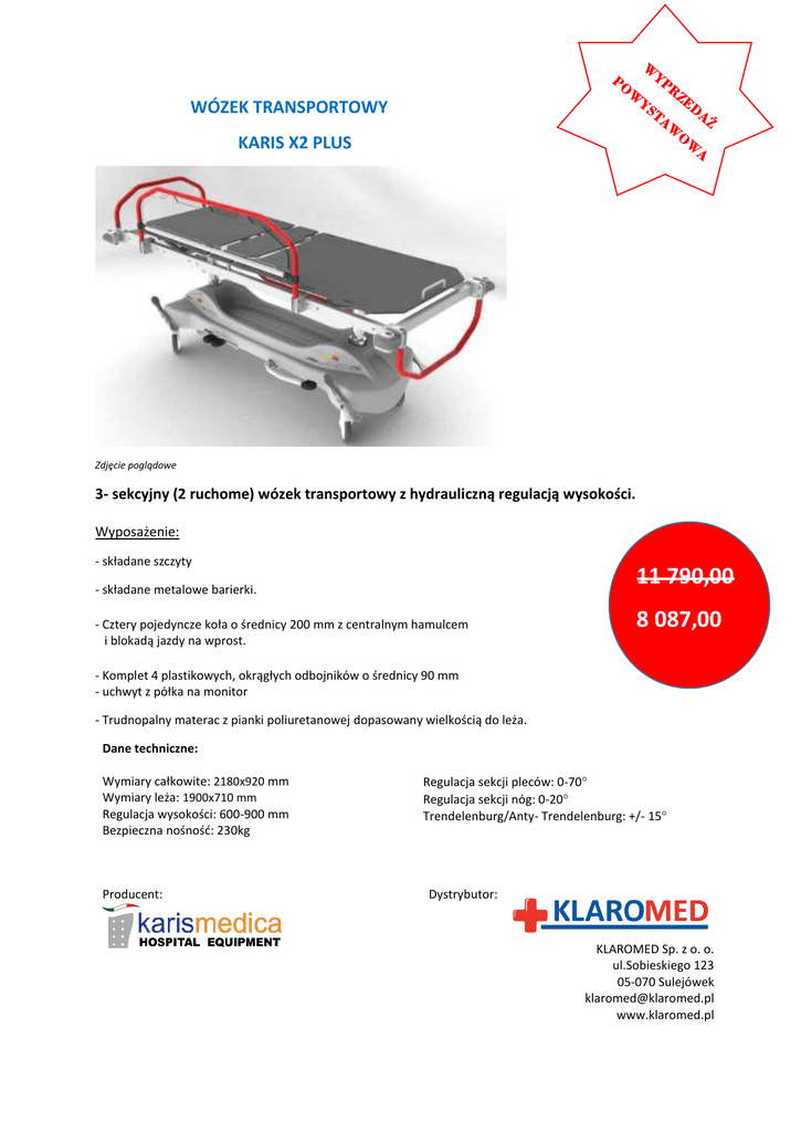 WÓZEK TRANSPORTOWY KARIS X2 PLUS Zdjęcie poglądowe 3- sekcyjny (2 ruchome) wózek transportowy z hydrauliczną regulacją wysokości. Wyposażenie: - składane szczyty 11 790,00 - składane metalowe barierki. - Cztery pojedyncze koła o średnicy 200 mm z centralnym hamulcem i blokadą jazdy na wprost. 8 087,00 - Komplet 4 plastikowych, okrągłych odbojników o średnicy 90 mm - uchwyt z półka na monitor - Trudnopalny materac z pianki poliuretanowej dopasowany wielkością do leża. Dane techniczne: Wymiary całkowite: 2180x920 mm Wymiary leża: 1900x710 mm Regulacja wysokości: 600-900 mm Bezpieczna nośność: 230kg Producent: Regulacja sekcji pleców: 0-70 Regulacja sekcji nóg: 0-20 Trendelenburg/Anty- Trendelenburg: +/- 15 Dystrybutor: KLAROMED Sp. z o. o. ul.Sobieskiego 123 05-070 Sulejówek [email protected] www.klaromed.pl