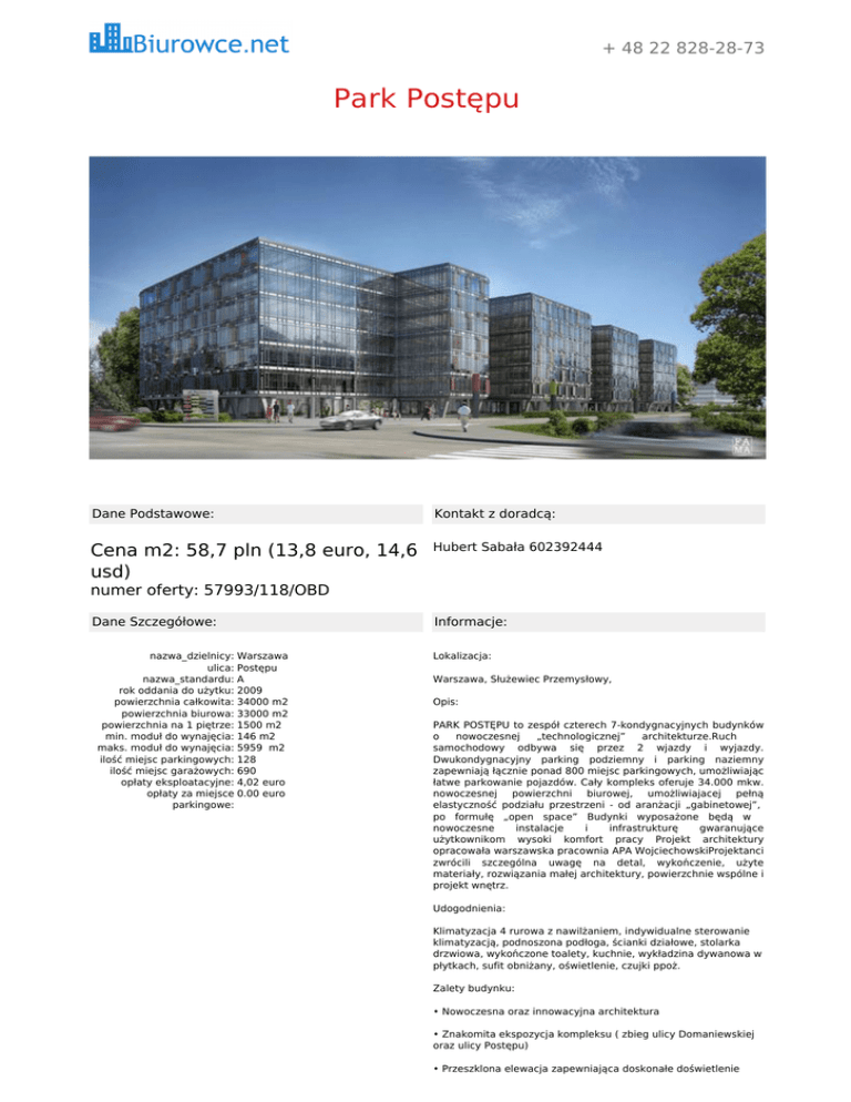 + 48 22 828-28-73 Park Postępu Dane Podstawowe: Kontakt z doradcą: Cena m2: 58,7 pln (13,8 euro, 14,6 usd) Hubert Sabała 602392444 numer oferty: 57993/118/OBD Dane Szczegółowe: nazwa_dzielnicy: Warszawa ulica: Postępu nazwa_standardu: A rok oddania do użytku: 2009 powierzchnia całkowita: 34000 m2 powierzchnia biurowa: 33000 m2 powierzchnia na 1 piętrze: 1500 m2 min. moduł do wynajęcia: 146 m2 maks. moduł do wynajęcia: 5959 m2 ilość miejsc parkingowych: 128 ilość miejsc garażowych: 690 opłaty eksploatacyjne: 4,02 euro opłaty za miejsce 0.00 euro parkingowe: Informacje: Lokalizacja: Warszawa, Służewiec Przemysłowy, Opis: PARK POSTĘPU to zespół czterech 7-kondygnacyjnych budynków o nowoczesnej „technologicznej” architekturze.Ruch samochodowy odbywa się przez 2 wjazdy i wyjazdy. Dwukondygnacyjny parking podziemny i parking naziemny zapewniają łącznie ponad 800 miejsc parkingowych, umożliwiając łatwe parkowanie pojazdów. Cały kompleks oferuje 34.000 mkw. nowoczesnej powierzchni biurowej, umożliwiajacej pełną elastyczność podziału przestrzeni - od aranżacji „gabinetowej”, po formułę „open space” Budynki wyposażone będą w nowoczesne instalacje i infrastrukturę gwaranujące użytkownikom wysoki komfort pracy Projekt architektury opracowała warszawska pracownia APA WojciechowskiProjektanci zwrócili szczególna uwagę na detal, wykończenie, użyte materiały, rozwiązania małej architektury, powierzchnie wspólne i projekt wnętrz. Udogodnienia: Klimatyzacja 4 rurowa z nawilżaniem, indywidualne sterowanie klimatyzacją, podnoszona podłoga, ścianki działowe, stolarka drzwiowa, wykończone toalety, kuchnie, wykładzina dywanowa w płytkach, sufit obniżany, oświetlenie, czujki ppoż. Zalety budynku: • Nowoczesna oraz innowacyjna architektura • Znakomita ekspozycja kompleksu ( zbieg ulicy Domaniewskiej oraz ulicy Postępu) • Przeszklona elewacja zapewniająca doskonałe doświetlenie wnętrza budynku • Elastyczne pod względem aranżacji powierzchnie wszystkich pięter (typowa wielkość 1300 m2 – 1500 m2) • Kantyna pracownicza, salonik prasowy, kwiaciarnia, fitness-club • Cztery niezależne wejścia oraz samodzielne hole recepcyjne • Dwie kondygnacje parkingu podziemnego oraz parking naziemny ( 820 miejsc) • Efektywnie zaprojektowane otoczenie kompleksu umożliwiające swobodną komunikację. ( wjazdy od ulicy Domaniewskiej oraz ulicy Postępu, dwie samodzielne rampy wjazdowe do garażu podziemnego) Dostępne powierzchnie: Budynek A 1.p: 334 m2, 304 m2 od zaraz, 153 m2 od marca 2016 2.p: 394 m2, 275 m2, 146 m2 od zaraz 4.p: 525 m2 od sierpnia 2015 5.p: 324 m2 od zaraz, 404 m2 od października 2015, 215 m2, 462 m2 od stycznia 2017 6.p: 1 535 m2 od zaraz Budynek D 1.p: 483 m2, 405 m2 od zaraz Dostępność: Oferta na życzenie! biurowce.net Adres:ul. Konduktorska 4 lok. 30, Warszawa, [email protected]