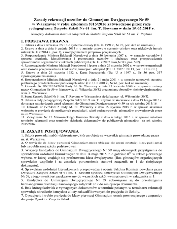 Zasady rekrutacji uczniów do Gimnazjum Dwujęzycznego Nr 59 w Warszawie w roku szkolnym 2015/2016 zatwierdzone przez radę pedagogiczną Zespołu Szkół Nr 61 im. T. Reytana w dniu 19.02.2015 r. Niniejszy dokument stanowi załącznik do Statutu Zespołu Szkół Nr 61 im. T. Reytana I. PODSTAWA PRAWNA 1. Ustawa z dnia 7 września 1991 r. o systemie oświaty (Dz. U. 1991 r., Nr 95, poz. 425 ze zmianami). 2. Ustawa z dnia z dnia 6 grudnia 2013 r. o zmianie ustawy o systemie oświaty oraz niektórych innych ustaw (Dz. U z 2014 r., poz. 7), z uwzględnieniem przepisów przejściowych. 3. Rozporządzenie Ministra Edukacji Narodowej z dnia 30 kwietnia 2007 r. w sprawie warunków i sposobu oceniania, klasyfikowania i promowania uczniów i słuchaczy oraz przeprowadzania sprawdzianów i egzaminów w szkołach publicznych (Dz. U. z 2007 roku, Nr 83, poz. 562). 4. Rozporządzenie Ministra Edukacji Narodowej i Sportu z dnia 29 stycznia 2002 r. w sprawie organizacji oraz sposobu przeprowadzania konkursów, turniejów i olimpiad (Dz. U. 2002 r. Nr 13, poz. 125 ze zm.). 5. Ustawa z dnia 26 stycznia 1982 r. Karta Nauczyciela (Dz. U. z 1997 r., Nr 56, poz. 357 z późniejszymi zmianami). 6. Rozporządzenie Ministra Edukacji Narodowej z dnia 21 maja 2001 r. w sprawie ramowych statutów publicznego przedszkola oraz publicznych szkół (Dz. U. z 2001 r., Nr 61, poz. 624 ze zmianami). 7. Uchwała Nr XXIX/934/2008 Rady M. St. Warszawy z dnia 17 kwietnia 2008 r. w sprawie zmiany nazwy Gimnazjum Nr 59 w Warszawie, ul. Wiktorska 30/32 oraz zmiany obwodów niektórych gimnazjów w m. st. Warszawie. 8. Statut Zespołu Szkół Nr 61 im. T. Reytana w Warszawie z siedzibą przy ul. Wiktorskiej 30/32. 9. Uchwała rady pedagogicznej Zespołu Szkół Nr 61 im. T. Reytana w Warszawie z dnia 19 lutego 2015 r. dotycząca zatwierdzenia zasad rekrutacji do Gimnazjum Dwujęzycznego Nr 59 na rok szkolny 2015/16. 10. Uchwała nr IV/54/2015 Rady M. St. Warszawy z dnia 15 stycznia 2015 r. w sprawie składania wniosków o przyjęcie do publicznych przedszkoli, szkół podstawowych i gimnazjów prowadzonych przez m. st. Warszawę. 11. Zarządzenie Nr 12 Mazowieckiego Kuratora Oświaty z dnia 6 lutego 2015 r. w sprawie ustalenia terminów rekrutacji oraz terminów składania dokumentów do publicznych gimnazjów na rok szkolny 2015/2016. II. ZASADY POSTĘPOWANIA 1. Szkoła prowadzi nabór elektroniczny, którym objęte są wszystkie gimnazja prowadzone przez m. st. Warszawę. 2. O przyjęcie do klasy pierwszej Gimnazjum może ubiegać się uczeń ostatniej klasy publicznej lub niepublicznej szkoły podstawowej. 3. Wszyscy kandydaci do Gimnazjum Dwujęzycznego Nr 59 mają obowiązek przystąpienia do sprawdzianu uzdolnień kierunkowych w dniu 14 maja 2015 r. o godzinie 815 w szkole pierwszego wyboru, w której znajduje się preferowana klasa dwujęzyczna (lista gimnazjów organizujących sprawdzian wspólnie i na zasadzie porozumienia stanowi załącznik nr 1 do niniejszego dokumentu). 4. Sprawdzian uzdolnień kierunkowych przeprowadza i ocenia Szkolna Komisja powołana przez Dyrektora Zespołu Szkół Nr 61 im. T. Reytana spośród nauczycieli Gimnazjum Dwujęzycznego Nr 59, a jego wynik jest przekazywany do wszystkich szkół wymienionych w załączniku nr 1. 5. Kandydaci do Gimnazjum Dwujęzycznego Nr 59 zobowiązani są do przestrzegania harmonogramu rekrutacji stanowiącego załącznik nr 2 do niniejszego dokumentu. 6. Brak któregokolwiek z wymaganych dokumentów w terminie podanym w terminarzu rekrutacji spowoduje skreślenie kandydata z listy zakwalifikowanych do przyjęcia do Szkoły. 7. O przyjęciu i trybie przyjęcia do klasy pierwszej Gimnazjum ucznia powracającego z zagranicy decyduje Dyrektor Zespołu Szkół. III. WYMAGANE DOKUMENTY 1. Oryginał świadectwa ukończenia szkoły podstawowej. 2. Oryginał zaświadczenia o wynikach sprawdzianu przeprowadzonego w ostatnim roku nauki w szkole podstawowej. 3. Karta zdrowia (lub podanie z prośbą o jej założenie). 4. Dwie fotografie formatu legitymacyjnego: 35x45 mm (podpisane: imię i nazwisko, data urodzenia, adres zamieszkania). 5. Deklaracja woli podjęcia nauki w Gimnazjum Dwujęzycznym Nr 59 (do pobrania ze strony internetowej Szkoły). IV. PROCES REKRUTACJI 1. Laureaci konkursów przedmiotowych o zasięgu wojewódzkim lub ponadwojewódzkim organizowanych przez Kuratorium Oświaty, których program obejmuje w całości lub poszerza treści podstawy programowej co najmniej jednego przedmiotu, tj.: - polonistycznego; - matematycznego; - przyrodniczego; - mini LOGIA przyjmowani są do Gimnazjum niezależnie od uzyskanej w procesie rekrutacji liczby punktów. 2. Wszyscy kandydaci przystępują do sprawdzianu uzdolnień kierunkowych, w wyniku którego mogą uzyskać maksymalnie 200 punktów przeliczonych następnie według kryteriów szkolnych (patrz punkt 3a). 3. W procesie rekrutacji kandydat może uzyskać maksymalnie 145 punktów: Szkolna Komisja Rekrutacyjna przyznaje kandydatom punkty według następujących zasad: a) 0,20 x liczba punktów ze sprawdzianu uzdolnień kierunkowych – maksymalnie 40 punktów; b) za sprawdzian przeprowadzony w ostatnim roku nauki w szkole podstawowej – maksymalnie 45 punktów, tj.: 0,20 x wynik procentowy z języka polskiego; 0,20 x wynik procentowy z matematyki; 0,05 x wynik procentowy z języka obcego. c) za oceny na świadectwie ukończenia szkoły podstawowej – maksymalnie 20 punktów: język polski matematyka przyroda historia język obcy ocena celująca lub bardzo dobra ocena dobra 4 pkt. 3 pkt. d) za inne osiągnięcia wymienione na świadectwie ukończenia szkoły podstawowej udokumentowane stosownym zaświadczeniem/dyplomem maksymalnie 40 pkt.: - finaliści konkursów przedmiotowych organizowanych przez Kuratorium Oświaty (polonistycznego, matematycznego, przyrodniczego, mini Logia), laureaci konkursu historycznego „Losy żołnierza i dzieje oręża polskiego”, laureaci konkursu Kangur Matematyczny (tytuł uzyskany