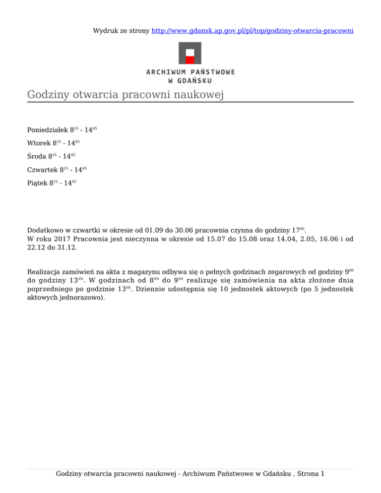 Wydruk ze strony http://www.gdansk.ap.gov.pl/pl/top/godziny-otwarcia-pracowni Godziny otwarcia pracowni naukowej Poniedziałek 815 - 1445 Wtorek 815 - 1445 Środa 815 - 1445 Czwartek 815 - 1445 Piątek 815 - 1445 Dodatkowo w czwartki w okresie od 01.09 do 30.06 pracownia czynna do godziny 1700. W roku 2017 Pracownia jest nieczynna w okresie od 15.07 do 15.08 oraz 14.04, 2.05, 16.06 i od 22.12 do 31.12. Realizacja zamówień na akta z magazynu odbywa się o pełnych godzinach zegarowych od godziny 900 do godziny 13 00 . W godzinach od 8 00 do 9 00 realizuje się zamówienia na akta złożone dnia poprzedniego po godzinie 1300. Dziennie udostępnia się 10 jednostek aktowych (po 5 jednostek aktowych jednorazowo). Godziny otwarcia pracowni naukowej - Archiwum Państwowe w Gdańsku , Strona 1