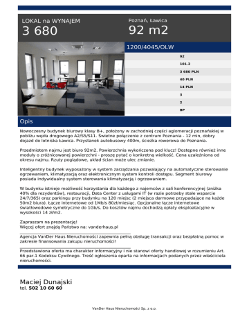 LOKAL na WYNAJEM 3 680 Poznań, Ławica 92 m2 1200/4045/OLW 92 101.2 3 680 PLN 40 PLN 14 PLN 3 2 BP Opis Nowoczesny budynek biurowy klasy B+, położony w zachodniej części aglomeracji poznańskiej w pobliżu węzła drogowego A2/S5/S11. Świetne połączenie z centrum Poznania - 12 min, dobry dojazd do lotniska Ławica. Przystanek autobusowy 400m, ścieżka rowerowa do Poznania. Przedmiotem najmu jest biuro 92m2. Powierzchnia wykończona pod klucz! Dostępne również inne moduły o zróżnicowanej powierzchni - proszę pytać o konkretną wielkość. Cena uzależniona od okresu najmu. Rzuty poglądowe, układ ścian może ulec zmianie. Inteligentny budynek wyposażony w system zarządzania pozwalający na automatyczne sterowanie ogrzewaniem, klimatyzacją oraz elektronicznym system kontroli dostępu. Segment biurowy posiada indywidualny system sterowania klimatyzacją i ogrzewaniem. W budynku istnieje możliwość korzystania dla każdego z najemców z sali konferencyjnej (zniżka 40% dla rezydentów), restauracji, Data Center z usługami IT (w razie potrzeby stałe wsparcie 24/7/365) oraz parkingu przy budynku na 120 miejsc (2 miejsca darmowe przypadające na każde 50m2 biura). Łącze internetowe od 1Mb/s 80zł/miesiąc. Opcjonalne łącze internetowe światłowodowe symetryczne do 1Gb/s. Do kosztów najmu dochodzą opłaty eksploatacyjne w wysokości 14 zł/m2. Zapraszam na prezentację! Więcej ofert znajdą Państwo na: vanderhaus.pl _____________________________________________________ Agencja VanDer Haus Nieruchomości zapewnia pełną obsługę transakcji oraz bezpłatną pomoc w zakresie finansowania zakupu nieruchomości! _____________________________________________________ Przedstawiona oferta ma charakter informacyjny i nie stanowi oferty handlowej w rozumieniu Art. 66 par.1 Kodeksu Cywilnego. Treść ogłoszenia oparta na informacjach podanych przez właściciela nieruchomości. Maciej Dunajski tel. 502 10 60 60 VanDer Haus Nieruchomości Sp. z o.o. email: [email protected] VanDer Haus Nieruchomości Sp. z o.o. Powered by TCPDF (www.tcpdf.org)