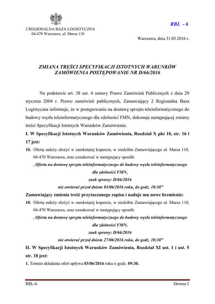 RBL - 6 2 REGIONALNA BAZA LOGISTYCZNA 04-470 Warszawa, ul. Marsa 110 Warszawa, dnia 31.05.2016 r. ZMIANA TREŚCI SPECYFIKACJI ISTOTNYCH WARUNKÓW ZAMÓWIENIA POSTĘPOWANIE NR D/66/2016 Na podstawie art. 38 ust. 4 ustawy Prawo Zamówień Publicznych z dnia 29 stycznia 2004 r. Prawo zamówień publicznych, Zamawiający 2 Regionalna Baza Logistyczna informuje, że w postępowaniu na dostawę sprzętu teleinformatycznego do budowy węzła teleinformatycznego dla zdolności FMN, dokonuje następującej zmiany treści Specyfikacji Istotnych Warunków Zamówienia. I. W Specyfikacji Istotnych Warunków Zamówienia, Rozdział X pkt 10, str. 16 i 17 jest: 10. Ofertę należy złożyć w zamkniętej kopercie, w siedzibie Zamawiającego ul. Marsa 110, 04-470 Warszawa, oraz oznakować w następujący sposób: „Oferta na dostawę sprzętu teleinformatycznego do budowy węzła teleinformatycznego dla zdolności FMN, znak sprawy: D/66/2016 nie otwierać przed dniem 03/06/2016 roku, do godz. 10:30” Zamawiający zmienia treść przytaczanego zapisu i nadaje mu nowe brzmienie: 10. Ofertę należy złożyć w zamkniętej kopercie, w siedzibie Zamawiającego ul. Marsa 110, 04-470 Warszawa, oraz oznakować w następujący sposób: „Oferta na dostawę sprzętu teleinformatycznego do budowy węzła teleinformatycznego dla zdolności FMN, znak sprawy: D/66/2016 nie otwierać przed dniem 27/06/2016 roku, do godz. 10:30” II. W Specyfikacji Istotnych Warunków Zamówienia, Rozdział XI ust. 1 i ust. 5 str. 18 jest: 1. Termin składania ofert upływa 03/06/2016 roku o godz. 09:30. RBL-6 Strona 1 5. Publiczne otwarcie ofert nastąpi w dniu 03/06/2016 roku, o godz. 10:30, w siedzibie Zamawiającego, budynek nr 1 - sala konferencyjna. Zamawiający zmienia treść przytaczanego zapisu i nadaje mu nowe brzmienie: 1. Termin składania ofert upływa 27/06/2016 roku o godz. 09:30. 5. Publiczne otwarcie ofert nastąpi w dniu 27/06/2016 roku, o godz. 10:30, w siedzibie Zamawiającego, budynek nr 1 - sala konferencyjna. III. W Specyfikacji Istotnych Warunków Zamówienia, Załącznik nr 1 do SIWZ - Opis przedmiotu Zamówienia, ZADANIE NR 2 wiersz 6 tabeli, str. 12 jest: 4 6. VMWarevSphere 6 (ze wsparciem podstawowym na 1 procesor na 1 rok) Enterprise Plus (Procesorowe) nie dotyczy (licencja na 4 procesory -2 serwery 2 procesoro we) nie dotyczy Zamawiający zmienia treść przytaczanego zapisu i nadaje mu nowe brzmienie: 4 6. VMWarevSphere 6 (ze wsparciem podstawowym na 1 procesor na 36 miesięcy) Enterprise Plus (Procesorowe) nie dotyczy (licencja na 4 procesory -2 serwery 2 procesoro we) nie dotyczy IV. W Specyfikacji Istotnych Warunków Zamówienia, Załącznik nr 1 do SIWZ - Opis przedmiotu Zamówienia, ZADANIE NR 2 wiersz 7 tabeli, str. 12 jest: 7. VeeamBackup&Replic ation v9 Enterprise (nowelicencje) (Procesorowe) nie dotyczy 4 nie dotyczy Zamawiający zmienia treść przytaczanego zapisu i nadaje mu nowe brzmienie: 7. RBL-6 VeeamBackup&Replic ation v9 Enterprise (nowelicencje) wymagane jest wsparcie producenta w godzinach roboczych tj. 5 dni/tydzień i 8 godzin/dzień. W ramach wsprarcia producenta wymagana jest cykliczna informacja dotycząca zmian i nowości wprowadzonych do oprogramowania będącego przedmiotem (Procesorowe) nie dotyczy 4 nie dotyczy Strona 2 zamówienia. V. W Specyfikacji Istotnych Warunków Zamówienia, Załącznik nr 1 do SIWZ Szczegółowe warunki serwisu gwarancyjnego dla sprzętu, str. 13 i 14 jest: Szczegółowe warunki serwisu gwarancyjnego dla sprzętu: 1. Całość dostarczonego sprzętu musi być objęta gwarancją producenta opartą o świadczenia gwarancyjne producenta sprzętu, niezależne od statusu partnerskiego Wykonawcy przez okres 36 miesięcy. Przy dostawie sprzętu Wykonawca dostarczy oświadczenie producenta lub przedstawiciela producenta w Polsce (oficjalnego biura producenta w Polsce) o wykupieniu przez Wykonawcę wymaganych przez Zamawiającego serwisów gwarancyjnych na dostarczony sprzęt. 2. Na dostarczany sprzęt musi być udzielona min. 36 miesięczna gwarancja od daty odbioru sprzętu, oparta na gwarancji producenta. Rozwiązania; serwis gwarancyjny świadczony ma być w miejscu wskazanym przez Zamawiającego na terytorium RP przez Wykonawcę; czas reakcji na zgłoszony problem (rozumiany jako podjęcie działań diagnostycznych i kontakt ze zgłaszającym) nie może przekroczyć 4 godzin; usunięcie usterki (naprawa lub wymiana wadliwego podzespołu lub urządzenia) ma zostać wykonana w przeciągu 2 dni roboczych od momentu zgłoszenia usterki; Serwis musi być świadczony przez 8 godzin na dobę przez 5 dni w tygodniu. Wykonawca ma obowiązek przyjmowania zgłoszeń serwisowych przez telefon (w godzinach pracy Zamawiającego), fax, e-mail lub WWW (przez całą dobę); Wykonawca ma udostępnić pojedynczy punkt przyjmowania zgłoszeń serwisowych. Zaproponowany pakiet serwisowy musi zapewniać bezpośrednie zgłoszenie awarii sprzętu do producenta sprzętu (a nie tylko u Wykonawcy) przez cały okres trwania gwarancji. 3. W przypadku sprzętu, dla którego jest wymagany dłuższy czas na naprawę sprzętu, Zamawiający dopuszcza podstawienie na czas naprawy sprzętu o nie gorszych parametrach funkcjonalnych. Naprawa w takim przypadku nie może przekroczyć 10 dni od momentu zgłoszenia usterki. 4. Zamawiający w zaproponowanych pakietach serwisowych producenta musi otrzymać dostęp do pomocy technicznej Producenta (telefon, e-mail lub WWW) w zakresie rozwiązywania problemów związanych z bieżącą eksploatacją dostarczonych rozwiązań w godzinach pracy Zamawiającego. RBL-6 Strona 3 5. Wszystkie dostarczane moduły (np. typu SFP) muszą pochodzić od producenta urządzeń sieciowych i być objęte serwisem gwarancyjnym opartym na świadczeniach producenta sprzętu. 6. W przypadku konieczności wymiany uszkodzonej pamięci masowej (nośnika danych, dysku twardego), pamięci RAM lub flash, uszkodzone moduły pozostaną u Użytkownika. (dla urządzeń Cisco 