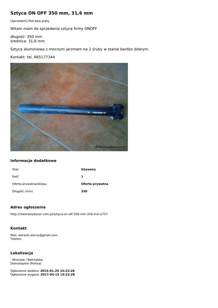 Sztyca ON OFF 350 mm, 31,6 mm [Sprzedam] Pod dwa pręty Witam mam do sprzedania sztycę firmy ONOFF długość: 350 mm średnica: 31,6 mm Sztyca aluminiowa z mocnym jarzmem na 2 śruby w stanie bardzo dobrym. Kontakt: tel. 665177344 Informacje dodatkowe Stan Używany Ilość 1 Oferta prywatna/sklepu Oferta prywatna Długość (mm) 350 Adres ogłoszenia http://rowerowybazar.com.pl/sztyca-on-off-350-mm-316-mm,o757 Kontakt Mail: [email protected] Telefon: Lokalizacja , Wrocław / Bełchatów Dolnośląskie (Polska) Ogłoszenie dodano: 2015-01-25 15:22:28 Ogłoszenie wygasa: 2017-04-15 15:22:28 Powered by TCPDF (www.tcpdf.org)