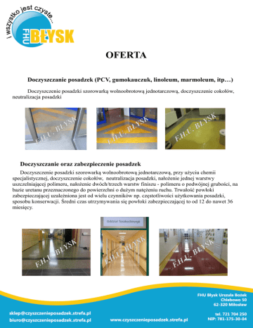 OFERTA Doczyszczanie posadzek (PCV, gumokauczuk, linoleum, marmoleum, itp…) Doczyszczenie posadzki szorowarką wolnoobrotową jednotarczową, doczyszczenie cokołów, neutralizacja posadzki Doczyszczanie oraz zabezpieczenie posadzek Doczyszczenie posadzki szorowarką wolnoobrotową jednotarczową, przy użyciu chemii specjalistycznej, doczyszczenie cokołów, neutralizacja posadzki, nałożenie jednej warstwy uszczelniającej polimeru, nałożenie dwóch/trzech warstw finiszu - polimeru o podwójnej grubości, na bazie uretanu przeznaczonego do powierzchni o dużym natężeniu ruchu. Trwałość powłoki zabezpieczającej uzależniona jest od wielu czynników np. częstotliwości użytkowania posadzki, sposobu konserwacji. Średni czas utrzymywania się powłoki zabezpieczającej to od 12 do nawet 36 miesięcy. Doczyszczanie oraz zabezpieczenie hal sportowych Doczyszczenie posadzki szorowarką wolnoobrotową jednotarczową, neutralizacja posadzki, nałożenie dwóch warstw powłoki zabezpieczającej, która gwarantuje odpowiednie zachowanie antypoślizgowe i spełnia wymagania normy DIN 18032-2. Trwałość powłoki uzależniona jest od wielu czynników np. częstotliwości użytkowania posadzki, sposobu konserwacji. Średni czas utrzymywania się powłoki zabezpieczającej to od 6-12miesięcy. Doczyszczanie posadzek przemysłowych 1) Doczyszczenie posadzki szorowarką wolnoobrotową jednotarczową, doczyszczenie cokołów, neutralizacja posadzki. 2) Doczyszczenie posadzki maszyną wysokociśnieniową pracującą przy pomocy zimnej lub gorącej wody, ściągnięcie wody za pomocą gum lub automatów przemysłowych. Czyszczenie wykładzin dywanowych 1) Odkurzenie na sucho, usunięcie plam, przebarwień, gum do żucia, etc..., maszynowe wtarcie prespray’u, płukanie ekstrakcyjne za pomocą ekstraktora. 2) Odkurzanie na sucho, odplamianie, natryśnięcie preparatu prespray, dogłębne czyszczenie runa wykładziny za pomocą maszyny Rotowash (dwie szczotki walcowe obracające się przeciwbieżnie z prędkością 1200obr/min, wyczesujące brud oraz resztki wody) Schnięcie od 15-60min zależne od chłonności runa wykładziny. Pielęgnacyjne czyszczenie wykładzin dywanowych Odkurzanie na sucho, natryśnięcie preparatu prespray, czyszczenie za pomocą maszyny Rotowash (dwie szczotki walcowe obracające się przeciwbieżnie z prędkością 1200obr/min, wyczesujące brud oraz resztki wody) Schnięcie od 15-40min zależne od chłonności runa wykładziny. Doczyszczanie schodów Doczyszczenie stopni wraz z cokołami Pobudowlane, poremontowe doczyszczanie posadzek Doczyszczenie posadzki szorowarką wolnoobrotową jednotarczową, doczyszczenie cokołów, neutralizacja posadzki. Zabezpieczanie posadzek kamiennych oraz płytek Zabezpieczenie impregnatem do posadzek kamiennych i betonowych. Impregnat jest bezbarwny, wnika w posadzkę i zabezpiecza ją od wewnątrz. Zapobiega przed wnikaniem brudu, oleju oraz innych zabrudzeń ropopochodnych, uniemożliwia zabrudzenie powierzchni paliwem samochodowym, olejami silnikowymi, tłuszczem z resztek jedzenia, czerwonym winem, napojami gazowanymi oraz zanieczyszczeniami atmosferycznymi, etc... Zapobiega powstawaniu wykwitów solnych, porastaniu mchów i alg, materiał staje się mniej higroskopijny. Zabieg jest jednorazowy, nie wymaga cyklicznych powtórzeń oraz nie powoduję zmiany efektu wizualnego. Środek impregnuje kamień od środka i jedyna możliwość usunięcia to zeszlifowanie powierzchni kamienia. Szlifowanie, polerowanie kamienia oraz krystalizacja marmuru Doczyszczanie szorowarką wolnoobrotową jednotarczową przy użyciu padów diamentowych o różnych gradacjach. W pierwszej fazie kamień jest doczyszczany poprzez delikatny szlif, który usuwa brud oraz zarysowania posadzki. A następnie polerowany tworząc efekt lustra. Czas wykonania usług uwarunkowany jest od m.in. metrażu, rodzaju i stopnia zabrudzeń oraz rodzaju czyszczonej powierzchni.