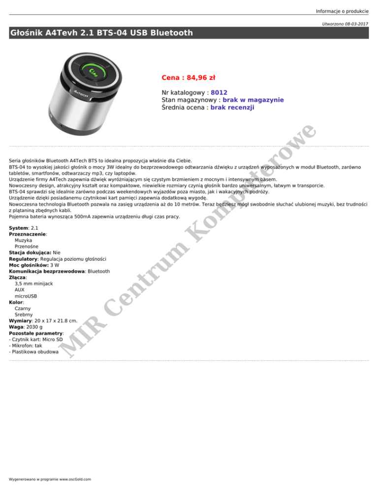 Informacje o produkcie Utworzono 08-03-2017 Głośnik A4Tevh 2.1 BTS-04 USB Bluetooth Cena : 84,96 zł ow e Nr katalogowy : 8012 Stan magazynowy : brak w magazynie Średnia ocena : brak recenzji M IR K um tr C en System: 2.1 Przeznaczenie: Muzyka Przenośne Stacja dokująca: Nie Regulatory: Regulacja poziomu głośności Moc głośników: 3 W Komunikacja bezprzewodowa: Bluetooth Złącza: 3,5 mm minijack AUX microUSB Kolor: Czarny Srebrny Wymiary: 20 x 17 x 21.8 cm. Waga: 2030 g Pozostałe parametry: - Czytnik kart: Micro SD - Mikrofon: tak - Plastikowa obudowa om pu te r Seria głośników Bluetooth A4Tech BTS to idealna propozycja właśnie dla Ciebie. BTS-04 to wysokiej jakości głośnik o mocy 3W idealny do bezprzewodowego odtwarzania dźwięku z urządzeń wyposażonych w moduł Bluetooth, zarówno tabletów, smartfonów, odtwarzaczy mp3, czy laptopów. Urządzenie firmy A4Tech zapewnia dźwięk wyróżniającym się czystym brzmieniem z mocnym i intensywnym basem. Nowoczesny design, atrakcyjny kształt oraz kompaktowe, niewielkie rozmiary czynią głośnik bardzo uniwersalnym, łatwym w transporcie. BTS-04 sprawdzi się idealnie zarówno podczas weekendowych wyjazdów poza miasto, jak i wakacyjnych podróży. Urządzenie dzięki posiadanemu czytnikowi kart pamięci zapewnia dodatkową wygodę. Nowoczesna technologia Bluetooth pozwala na zasięg urządzenia aż do 10 metrów. Teraz będziesz mógł swobodnie słuchać ulubionej muzyki, bez trudności z plątaniną zbędnych kabli. Pojemna bateria wynosząca 500mA zapewnia urządzeniu długi czas pracy. Wygenerowano w programie www.oscGold.com