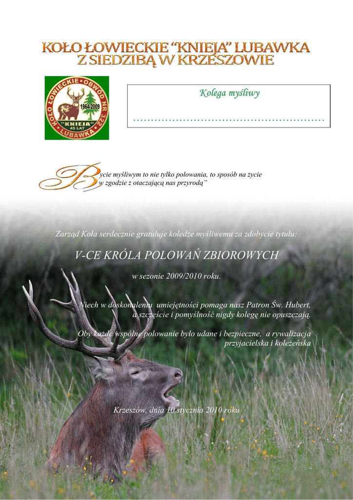Kolega myśliwy ……………………………………………… ycie myśliwym to nie tylko polowania, to sposób na życie w zgodzie z otaczającą nas przyrodą” Zarząd Koła serdecznie gratuluje koledze myśliwemu za zdobycie tytułu: V-CE KRÓLA POLOWAŃ ZBIOROWYCH w sezonie 2009/2010 roku. Niech w doskonaleniu umiejętności pomaga nasz Patron Św. Hubert, a szczęście i pomyślność nigdy kolegę nie opuszczają. Oby każde wspólne polowanie było udane i bezpieczne, a rywalizacja przyjacielska i koleżeńska Krzeszów, dnia 10 stycznia 2010 roku
