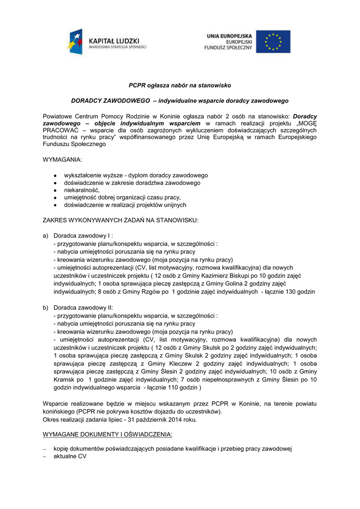 PCPR ogłasza nabór na stanowisko DORADCY ZAWODOWEGO – indywidualne wsparcie doradcy zawodowego Powiatowe Centrum Pomocy Rodzinie w Koninie ogłasza nabór 2 osób na stanowisko: Doradcy zawodowego – objęcie indywidualnym wsparciem w ramach realizacji projektu „MOGĘ PRACOWAĆ – wsparcie dla osób zagrożonych wykluczeniem doświadczających szczególnych trudności na rynku pracy” współfinansowanego przez Unię Europejską w ramach Europejskiego Funduszu Społecznego WYMAGANIA: wykształcenie wyższe - dyplom doradcy zawodowego doświadczenie w zakresie doradztwa zawodowego niekaralność, umiejętność dobrej organizacji czasu pracy, doświadczenie w realizacji projektów unijnych ZAKRES WYKONYWANYCH ZADAŃ NA STANOWISKU: a) Doradca zawodowy I : - przygotowanie planu/konspektu wsparcia, w szczególności : - nabycia umiejętności poruszania się na rynku pracy - kreowania wizerunku zawodowego (moja pozycja na rynku pracy) - umiejętności autoprezentacji (CV, list motywacyjny, rozmowa kwalifikacyjna) dla nowych uczestników i uczestniczek projektu ( 12 osób z Gminy Kazimierz Biskupi po 10 godzin zajęć indywidualnych; 1 osoba sprawująca pieczę zastępczą z Gminy Golina 2 godziny zajęć indywidualnych; 8 osób z Gminy Rzgów po 1 godzinie zajęć indywidualnych - łącznie 130 godzin b) Doradca zawodowy II: - przygotowanie planu/konspektu wsparcia, w szczególności : - nabycia umiejętności poruszania się na rynku pracy - kreowania wizerunku zawodowego (moja pozycja na rynku pracy) - umiejętności autoprezentacji (CV, list motywacyjny, rozmowa kwalifikacyjna) dla nowych uczestników i uczestniczek projektu ( 12 osób z Gminy Skulsk po 2 godziny zajęć indywidualnych; 1 osoba sprawująca pieczę zastępczą z Gminy Skulsk 2 godziny zajęć indywidualnych; 1 osoba sprawująca pieczę zastępczą z Gminy Kleczew 2 godziny zajęć indywidualnych; 1 osoba sprawująca pieczę zastępczą z Gminy Ślesin 2 godziny zajęć indywidualnych; 10 osób z Gminy Kramsk po 1 godzinie zajęć indywidualnych; 7 osób niepełnosprawnych z Gminy Ślesin po 10 godzin indywidualnego wsparcia - łącznie 110 godzin ) Wsparcie realizowane będzie w miejscu wskazanym przez PCPR w Koninie, na terenie powiatu konińskiego (PCPR nie pokrywa kosztów dojazdu do uczestników). Okres realizacji zadania lipiec - 31 październik 2014 roku. WYMAGANE DOKUMENTY I OŚWIADCZENIA: kopię dokumentów poświadczających posiadane kwalifikacje i przebieg pracy zawodowej aktualne CV list motywacyjny referencje oświadczenie o niekaralności (zał. Nr 1) oświadczenie o wyrażeniu zgody na przetwarzanie danych osobowych o treści: „ Wyrażam zgodę na przetwarzanie moich danych osobowych zawartych w ofercie pracy dla potrzeb niezbędnych do realizacji procesu rekrutacji, zgodnie z ustawą z dnia 29.08.1997r. o ochronie danych osobowych ( tekst jednolity Dz..U. z 2002r, NR 101, poz. 926 ze zm.)” oferta cenowa wykonania zadania MIEJSCE WYKONYWANIA PRACY: Powiat koniński RODZAJ UMOWY: Umowa zlecenie. Dokumenty należy składać w zamkniętej kopercie w terminie do dnia 20 czerwca 2014r., listownie bądź osobiście w siedzibie Powiatowego Centrum Pomocy Rodzinie w Koninie Aleje 1 Maja 9, 62-510 Konin z dopiskiem „DORADCA ZAWODOWY – indywidualne wsparcie „ Z kandydatami spełniającymi wymagania zostanie przeprowadzona rozmowa kwalifikacyjna, na którą kandydaci zostaną zaproszeni telefonicznie.