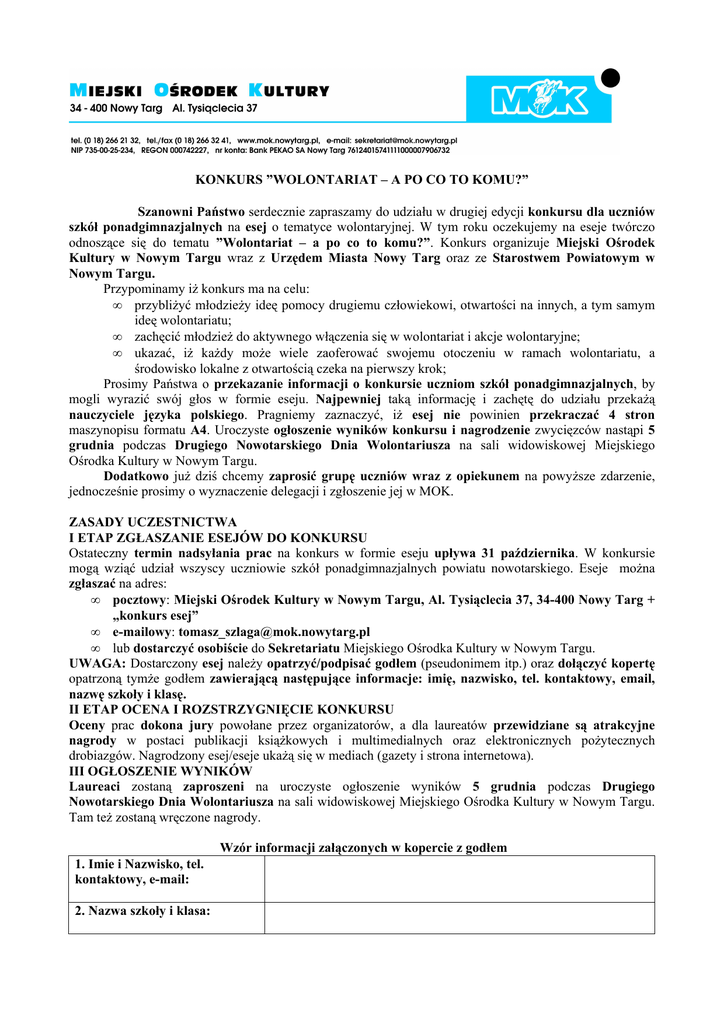 KONKURS ”WOLONTARIAT – A PO CO TO KOMU?” Szanowni Państwo serdecznie zapraszamy do udziału w drugiej edycji konkursu dla uczniów szkół ponadgimnazjalnych na esej o tematyce wolontaryjnej. W tym roku oczekujemy na eseje twórczo odnoszące się do tematu ”Wolontariat – a po co to komu?”. Konkurs organizuje Miejski Ośrodek Kultury w Nowym Targu wraz z Urzędem Miasta Nowy Targ oraz ze Starostwem Powiatowym w Nowym Targu. Przypominamy iż konkurs ma na celu: • przybliżyć młodzieży ideę pomocy drugiemu człowiekowi, otwartości na innych, a tym samym ideę wolontariatu; • zachęcić młodzież do aktywnego włączenia się w wolontariat i akcje wolontaryjne; • ukazać, iż każdy może wiele zaoferować swojemu otoczeniu w ramach wolontariatu, a środowisko lokalne z otwartością czeka na pierwszy krok; Prosimy Państwa o przekazanie informacji o konkursie uczniom szkół ponadgimnazjalnych, by mogli wyrazić swój głos w formie eseju. Najpewniej taką informację i zachętę do udziału przekażą nauczyciele języka polskiego. Pragniemy zaznaczyć, iż esej nie powinien przekraczać 4 stron maszynopisu formatu A4. Uroczyste ogłoszenie wyników konkursu i nagrodzenie zwycięzców nastąpi 5 grudnia podczas Drugiego Nowotarskiego Dnia Wolontariusza na sali widowiskowej Miejskiego Ośrodka Kultury w Nowym Targu. Dodatkowo już dziś chcemy zaprosić grupę uczniów wraz z opiekunem na powyższe zdarzenie, jednocześnie prosimy o wyznaczenie delegacji i zgłoszenie jej w MOK. ZASADY UCZESTNICTWA I ETAP ZGŁASZANIE ESEJÓW DO KONKURSU Ostateczny termin nadsyłania prac na konkurs w formie eseju upływa 31 października. W konkursie mogą wziąć udział wszyscy uczniowie szkół ponadgimnazjalnych powiatu nowotarskiego. Eseje można zgłaszać na adres: • pocztowy: Miejski Ośrodek Kultury w Nowym Targu, Al. Tysiąclecia 37, 34-400 Nowy Targ + „konkurs esej” • e-mailowy: [email protected] • lub dostarczyć osobiście do Sekretariatu Miejskiego Ośrodka Kultury w Nowym Targu. UWAGA: Dostarczony esej należy opatrzyć/podpisać godłem (pseudonimem itp.) oraz dołączyć kopertę opatrzoną tymże godłem zawierającą następujące informacje: imię, nazwisko, tel. kontaktowy, email, nazwę szkoły i klasę. II ETAP OCENA I ROZSTRZYGNIĘCIE KONKURSU Oceny prac dokona jury powołane przez organizatorów, a dla laureatów przewidziane są atrakcyjne nagrody w postaci publikacji książkowych i multimedialnych oraz elektronicznych pożytecznych drobiazgów. Nagrodzony esej/eseje ukażą się w mediach (gazety i strona internetowa). III OGŁOSZENIE WYNIKÓW Laureaci zostaną zaproszeni na uroczyste ogłoszenie wyników 5 grudnia podczas Drugiego Nowotarskiego Dnia Wolontariusza na sali widowiskowej Miejskiego Ośrodka Kultury w Nowym Targu. Tam też zostaną wręczone nagrody. Wzór informacji załączonych w kopercie z godłem 1. Imie i Nazwisko, tel. kontaktowy, e-mail: 2. Nazwa szkoły i klasa: