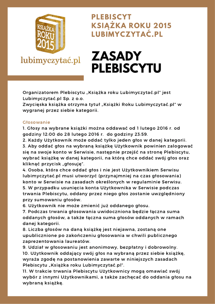 PLEBISCYT KSIĄŻKA ROKU 2015 LUBIMYCZYTAĆ.PL ZASADY PLEBISCYTU Organizatorem Plebiscytu „ Książka roku Lubimyczytać . pl ” jest Lubimyczytać . pl Sp . z o . o . Zwycięska książka otrzyma tytuł „ Książki Roku Lubimyczytać . pl ” w wygranej przez siebie kategorii . Głosowanie 1 . Głosy na wybrane książki można oddawać od 1 lutego 2016 r . od godziny 12 : 00 do 28 lutego 2016 r . do godziny 23 : 59 . 2 . Każdy Użytkownik może oddać tylko jeden głos w danej kategorii . 3 . Aby oddać głos na wybraną książkę Użytkownik powinien zalogować się na swoje konto w Serwisie , następnie przejść na stronę Plebiscytu , wybrać książkę w danej kategorii , na którą chce oddać swój głos oraz kliknąć przycisk „ głosuję ”. 4 . Osoba , która chce oddać głos i nie jest Użytkownikiem Serwisu lubimyczytać . pl musi utworzyć ( przynajmniej na czas głosowania ) konto w Serwisie na zasadach określonych w regulaminie Serwisu . 5 . W przypadku usunięcia konta Użytkownika w Serwisie podczas trwania Plebiscytu , oddany przez niego głos zostanie uwzględniony przy sumowaniu głosów . 6 . Użytkownik nie może zmienić już oddanego głosu . 7 . Podczas trwania głosowania uwidoczniona będzie łączna suma oddanych głosów , a także łączna suma głosów oddanych w ramach danej kategorii . 8 . Liczba głosów na daną książkę jest niejawna , zostaną one upublicznione po zakończeniu głosowania w chwili publicznego zaprezentowania laureatów . 9 . Udział w głosowaniu jest anonimowy , bezpłatny i dobrowolny . 10 . Użytkownik oddający swój głos na wybraną przez siebie książkę , wyraża zgodę na postanowienia zawarte w niniejszych zasadach Plebiscytu „ Książka roku Lubimyczytać . pl ”. 11 . W trakcie trwania Plebiscytu Użytkownicy mogą omawiać swój wybór z innymi Użytkownikami , a także zachęcać do oddania głosu na wybraną książkę . PLEBISCYT KSIĄŻKA ROKU 2015 LUBIMYCZYTAĆ.PL ZASADY PLEBISCYTU 12. W trakcie trwania Plebiscytu Autorzy oraz Wydawcy nominowanych Książek mogą zachęcać za pośrednictwem mediów do oddania głosu na daną nominowaną książkę. Wybór nominowanych książek: 1. Zespół Lubimyczytać.pl pod przewodnictwem Izabeli Sadowskiej – Prezesa Zarządu Lubimyczytać.pl Sp. z o.o., wybrał nominowane książki spośród wszystkich książek zamieszczonych w Serwisie, które zostały wydane w okresie od 1 stycznia 2015 r. do 31 grudnia 2015 r. 2. Książki zostały nominowane w 10 kategoriach: a. Kryminał, sensacja, thriller; b. Literatura piękna; c. Literatura faktu; d. Horror; e. Literatura obyczajowa; f. Fantastyka, fantasy; g. Science fiction; h. Autobiografia, biografia, wspomnienia; i. Literatura młodzieżowa; j. Powieść historyczna. 3. Podczas nominacji książki zespół lubimyczytać.pl brał pod uwagę: a. popularność książki w Serwisie w tym: i. liczba ocen i opinii Użytkowników Serwisu, ii. średnia ocena książki, iii. aktywność Użytkowników odnosząca się do dyskusji nad książką, b. wartość literacką i artystyczną, na podstawie subiektywnej opinii zespołu oceniającego, c. nowatorstwo w ramach reprezentowanego gatunku, d. liczbę nagród przyznanych danej książce w Polsce i za granicą, e. popularność książki na rynku mierzoną na podstawie miejsc w zestawieniach w ogólnoświatowych mediach, PLEBISCYT KSIĄŻKA ROKU 2015 LUBIMYCZYTAĆ.PL ZASADY PLEBISCYTU f. liczbę publikacji na temat książki w mediach ogólnopolskich i światowych, g. datę publikacji książki. 4. W każdej kategorii, może być nominowanych maksymalnie 20 książek. Nominowane książki w danej kategorii nie mogą być napisane przez tego samego autora. 5. Ta sama książka może być nominowana tylko w jednej kategorii. 6. Książki tego samego autora mogą być nominowane w różnych kategoriach. 7. Książki tego samego wydawnictwa mogą być nominowane zarówno w ramach jednej jak i wielu kategoriach. 8. Nominacje książki są ostateczne i nieodwołalne i nie podlegają reklamacji. 9. Na życzenie autora lub wydawcy nominowanej książki, Organizator usunie książkę z udziału w Plebiscycie. 10. W przypadku usunięcia książki przez Organizatora, o którym mowa w pkt 9, nie zostanie ona zastąpiona przez inną książkę. Ogłoszenie wyników 1. Wyłonienie laureatów Plebiscytu nastąpi w terminie do 7 dni od dnia zakończenia głosowania. 2. Informacja o zwycięzcach zostanie podana do publicznej wiadomości w formie wpisu na stronie głównej Serwisu, a także na stronie Plebiscytu. 3. W ramach kategorii wygrywa książka, która zgromadziła najwięcej głosów w trakcie głosowania. 4. W przypadku równej liczby głosów, zwycięstwo przypada ex aequo książkom, które uzyskały największą liczbę głosów. 5. Zwycięska książka otrzyma tytuł „Książka Roku 2015 Lubimyczytać.pl w kategorii x” gdzie x jest nazwą kategorii, w której książka zwyciężyła. 6. Tytuł jest niezbywalny. PLEBISCYT KSIĄŻKA ROKU 2015 LUBIMYCZYTAĆ.PL ZASADY PLEBISCYTU 7 . Wydawcy oraz Autorzy książek , które zwyciężą w plebiscycie , mogą posługiwać się otrzymanym tytułem „ Książka Roku 2015 Lubimyczytać . pl w kategorii x ”, gdzie x jest nazwą kategorii , w której przyznano nagrodę . Pozostałe 1 . Zasady Plebiscytu mogą ulec zmianie . O wszelkich zmianach Użytkownicy zostaną poinformowani poprzez umieszczenie stosownej informacji na stronie Plebiscytu . 2 . W kwestiach nieuregulowanych niniejszymi Zasadami stosuje się regulamin ogólny Serwisu dostępny na stronie internetowej http :// lubimyczytac . pl / regulamin oraz przepisy Kodeksu Cywilnego i inne obowiązujące przepisy prawa polskiego .