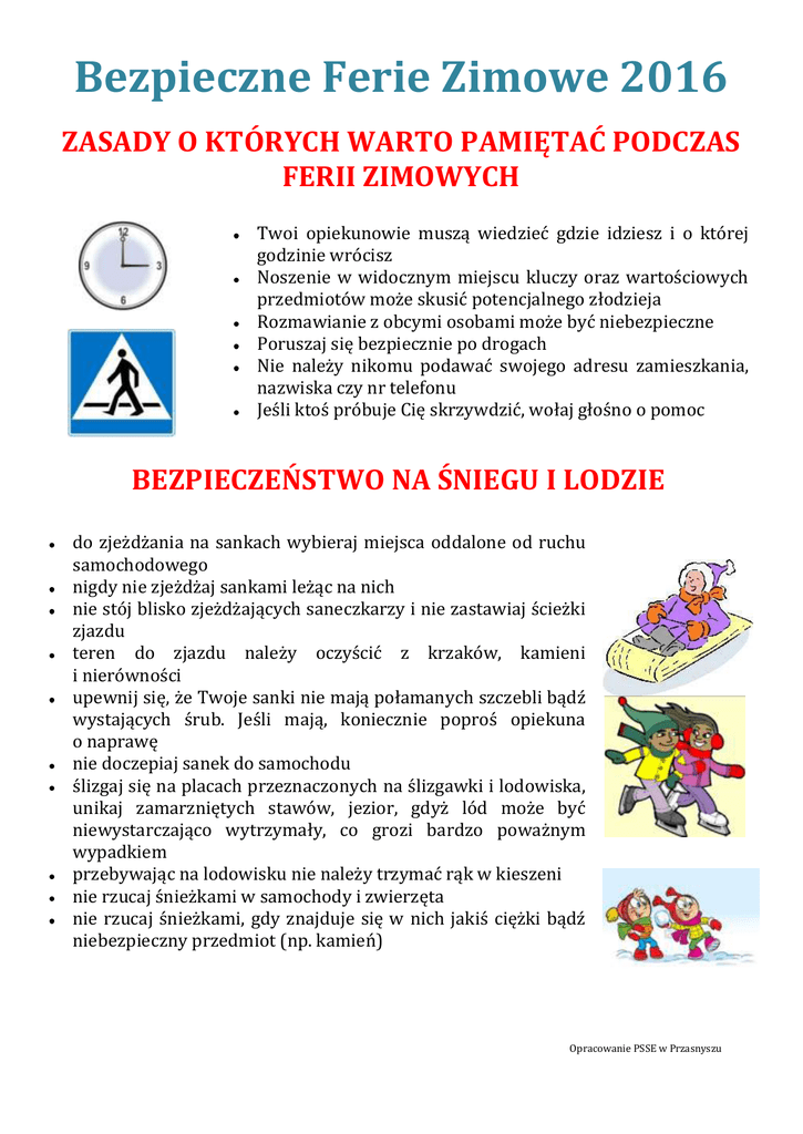 Bezpieczne Ferie Zimowe 2016 ZASADY O KTÓRYCH WARTO PAMIĘTAĆ PODCZAS FERII ZIMOWYCH Twoi opiekunowie muszą wiedzieć gdzie idziesz i o której godzinie wrócisz Noszenie w widocznym miejscu kluczy oraz wartościowych przedmiotów może skusić potencjalnego złodzieja Rozmawianie z obcymi osobami może być niebezpieczne Poruszaj się bezpiecznie po drogach Nie należy nikomu podawać swojego adresu zamieszkania, nazwiska czy nr telefonu Jeśli ktoś próbuje Cię skrzywdzić, wołaj głośno o pomoc BEZPIECZEŃSTWO NA ŚNIEGU I LODZIE do zjeżdżania na sankach wybieraj miejsca oddalone od ruchu samochodowego nigdy nie zjeżdżaj sankami leżąc na nich nie stój blisko zjeżdżających saneczkarzy i nie zastawiaj ścieżki zjazdu teren do zjazdu należy oczyścić z krzaków, kamieni i nierówności upewnij się, że Twoje sanki nie mają połamanych szczebli bądź wystających śrub. Jeśli mają, koniecznie poproś opiekuna o naprawę nie doczepiaj sanek do samochodu ślizgaj się na placach przeznaczonych na ślizgawki i lodowiska, unikaj zamarzniętych stawów, jezior, gdyż lód może być niewystarczająco wytrzymały, co grozi bardzo poważnym wypadkiem przebywając na lodowisku nie należy trzymać rąk w kieszeni nie rzucaj śnieżkami w samochody i zwierzęta nie rzucaj śnieżkami, gdy znajduje się w nich jakiś ciężki bądź niebezpieczny przedmiot (np. kamień) Opracowanie PSSE w Przasnyszu